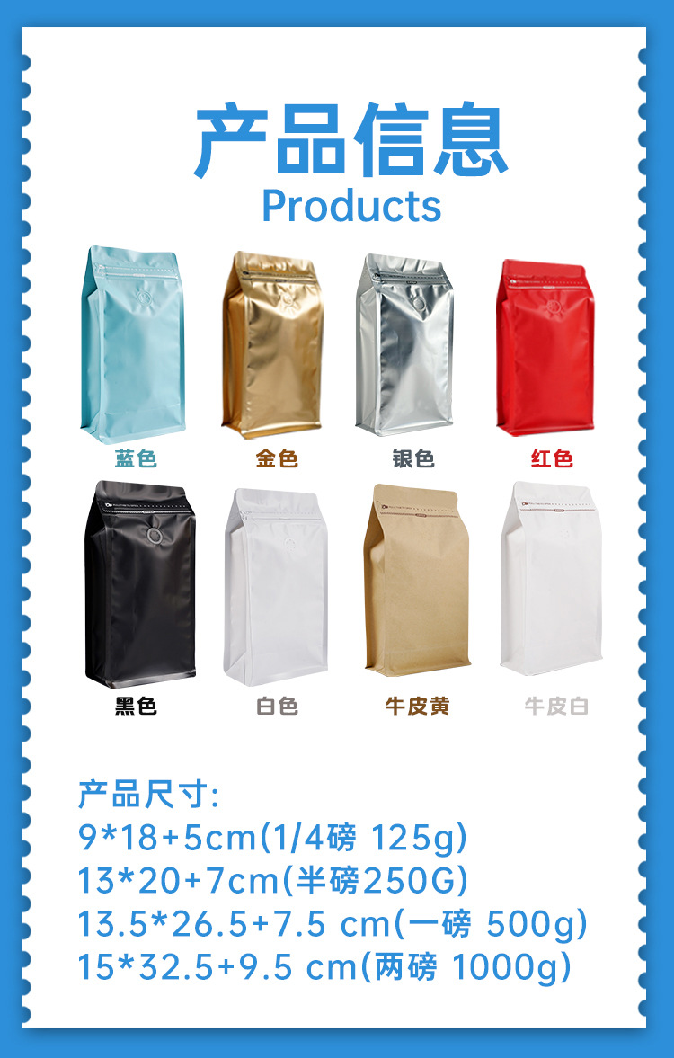 | Modelo de especificación | 125g [sin válvula de aire] negro 9*18 5cm28 seda [50 precio],125g [con válvula de aire] negro 9*18 5cm28 seda [50 precio],250g [sin válvula de aire] negro 13*20 7cm28 alambre [50 precio],250g [con válvula de aire] negro 13*20 7cm28 seda [50 precio],500g [sin válvula de aire] negro 13.5*26.5 7.5cm28 seda [50 precio],500g [con válvula de aire] negro 13.5*26.5 7.5cm28 seda [50 precio],1000g [sin válvula de aire] negro 15*32.5 9.5cm28 seda [50 precio],1000g [con válvula de aire] negro 15*32.5 9.5cm28 seda [50 precio],125g [sin válvula de aire] rojo 9*18 5cm28 seda [50 precio],125g [con válvula de aire] rojo 9*18 5cm28 seda [50 precio],250g [sin válvula de aire] rojo 13*20 7cm28 alambre [50 precio],250g [con válvula de aire] rojo 13*20 7cm28 seda [50 precio],500g [sin válvula de aire] rojo 13.5*26.5 7.5cm28 seda [50 precio],500g [con válvula de aire] rojo 13,5*26,5 7,5cm28 seda [50 precio],1000g [sin válvula de aire] rojo 15*32.5 9.5cm28 seda [50 precio],1000g [con válvula de aire] rojo 15*32.5 9.5cm28 seda [50 precio],125g [sin válvula de aire] azul 9*18 5cm28 seda [50 precio],125g [con válvula de aire] azul 9*18 5cm28 seda [50 precio],250g [sin válvula de aire] azul 13*20 7cm28 seda [50 precio],250g [con válvula de aire] azul 13*20 7cm28 seda [50 precio],500g [sin válvula de aire] azul 13.5*26.5 7.5cm28 seda [50 precio],500g [con válvula de aire] azul 13.5*26.5 7.5cm28 seda [50 precio],1000g [sin válvula de aire] azul 15*32.5 9.5cm28 seda [50 precio],1000g [con válvula de aire] azul 15*32.5 9.5cm28 seda [50 precio],125g [sin válvula de aire] alambre dorado 9*18 5cm28 [50 precio],125g [con válvula de aire] alambre dorado 9*18 5cm28 [50 precio],250g [sin válvula de aire] alambre dorado 13*20 7cm28 [50 precio],250g [con válvula de aire] oro 13*20 7cm28 seda [50 precio],500g [sin válvula de aire] oro 13.5*26.5 7.5cm28 seda [50 precio],500g [con válvula de aire] oro 13.5*26.5 7.5cm28 seda [50 precio],1000g [sin válvula de aire] oro 15*32.5 9.5cm28 seda [50 precio],1000g [con válvula de aire] oro 15*32.5 9.5cm28 seda [50 precio],125g [sin válvula de aire] plata 9*18 5cm28 seda [50 precio],125g [con válvula de aire] plata 9*18 5cm28 seda [50 precio],250g [con válvula de aire] plata 13*20 7cm28 seda [50 precio],250g [sin válvula de aire] plata 13*20 7cm28 seda [50 precio],500g [sin válvula de aire] plata 13.5*26.5 7.5cm28 seda [50 precio],500g [con válvula de aire] plata 13.5*26.5 7.5cm28 seda [50 precio],1000g [sin válvula de aire] plata 15*32.5 9.5cm28 seda [50 precio],1000g [con válvula de aire] plata 15*32.5 9.5cm28 seda [50 precio],125g [sin válvula de aire] alambre blanco 9*18 5cm28 [50 precio],125g [con válvula de aire] alambre blanco 9*18 5cm28 [50 precio],250g [sin válvula de aire] alambre blanco 13*20 7cm28 [50 precio],250g [con válvula de aire] alambre blanco 13*20 7cm28 [50 precio],500g [sin válvula de aire] blanco 13.5*26.5 7.5cm28 seda [50 precio],500g [con válvula de aire] blanco 13,5*26,5 7,5cm28 seda [50 precio],1000g [sin válvula de aire] Blanco 15*32.5 9.5cm28 alambre [50 precio],1000g [con válvula de aire] Blanco 15*32.5 9.5cm28 seda [50 precio],125g [sin válvula de aire] Piel amarilla 9*18 5cm28 seda [50 precio],125g [con válvula de aire] Piel amarilla 9*18 5cm28 seda [50 precio],250g [sin válvula de aire] Piel amarilla 13*20 7cm28 seda [50 precio],250g [con válvula de aire] Piel amarilla 13*20 7cm28 seda [50 precio],500g [sin válvula de aire] Piel amarilla 13,5*26,5 7,5cm28 seda [50 precios],500g [con válvula de aire] Piel amarilla 13,5*26,5 7,5cm28 seda [50 precios],1000g [sin válvula de aire] Piel amarilla 15*32.5 9.5cm28 seda [50 precios],1000g [con válvula de aire] Piel amarilla 15*32.5 9.5cm28 seda [50 precios],[Con válvula de aire] Piel de vaca blanca 13.5*26.5 7.5cm28 seda [50 precios],[Sin válvula de aire] Color transparente 13*20 7cm28 alambre [50 precios],[Con válvula de aire] Color transparente 13*20 7cm28 alambre [50 precios],[Sin válvula de aire] Color transparente 13,5*26,5 alambre 7,5cm28 [50 precios],[Con válvula de aire] Color transparente 13,5*26,5 alambre 7,5cm28 [50 precios],[Sin válvula de aire] Color transparente 15*32.5 9.5cm28 alambre [50 precios],[Con válvula de aire] Color transparente 15*32.5 9.5cm28 alambre [50 precios] |