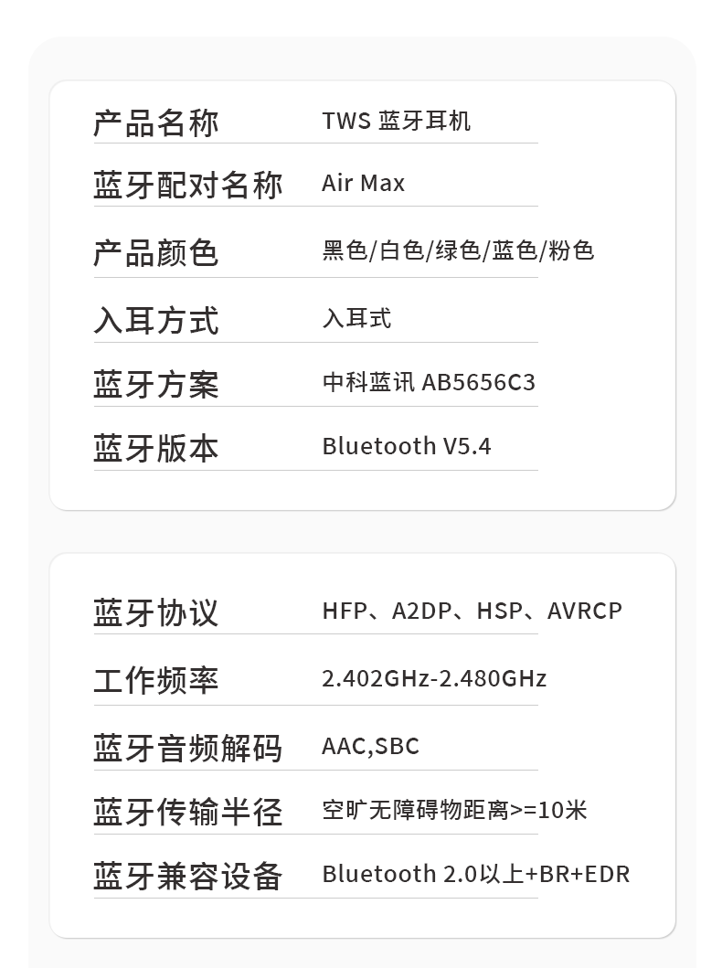 | color | Auriculares Bluetooth Uget-001 [Blanco] En caja,Auriculares Bluetooth Uget-001 [Negro] En caja,Air Max Haoyue Blanco [En caja],Air Max Premium Negro [En caja],Polvo Air Max Sakura [en caja],Air Max verde aguacate [en caja],Air Max Ice Crystal Azul [En caja],Almacén transparente AIR31 [rosa] en caja,Almacén transparente AIR31 [verde] en caja,Auriculares Bluetooth D56 [Blanco] En caja,Auriculares Bluetooth D56 [Color piel] En caja,Auriculares Bluetooth A9Pro [Blanco] En caja,Q10 [Blanco] Auriculares duales,Q10 [Negro] Auriculares duales en caja,Q10 [Color de piel] Auriculares duales en caja,Auriculares Bluetooth Q86 [marrón] en caja,Auriculares Bluetooth Q86 [tono de piel] en caja,Auriculares Bluetooth Q86 [verde] en caja,Auriculares Bluetooth Q87 [marrón] en caja,Auriculares Bluetooth Q87 [tono de piel] en caja,Auriculares Bluetooth Q87 [verde] en caja,Bolso OPP izquierdo de una sola oreja [negro],Bolso OPP de una sola oreja izquierda [blanco] |