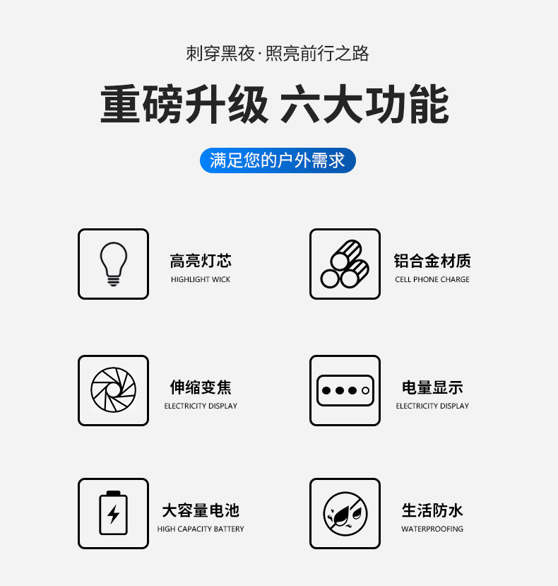 Nueva linterna, linterna portátil, linterna de luz fuerte con cuentas de seis luces, carga, alto brillo, largo alcance, ajuste de cuatro velocidades