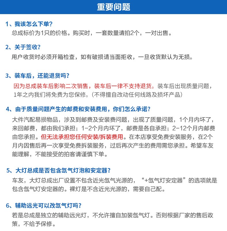 3、各位亲们,虽然网上有很多安装的教程,可是对于第一次购买安装的新手来说,还是一个挑战,为了不必要的纠纷,各位亲请确认会安装后再购买,或者与改装店谈好安装价格后,再来购买(价格绝对比直接在改装店购买要实惠很多),如因不会安装而导致的退换货,运费还请自理哦;