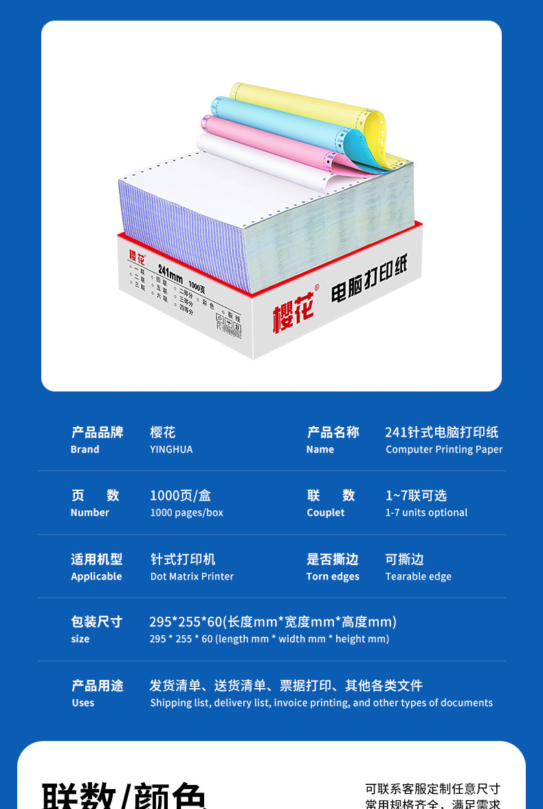 | Especificaciones y modelos | 1000页;一联一等分,1000页;一联二等分,1000页;一联三等分,1000页;二联一等分,1000页;二联二等分,1000页;二联三等分,1000页;三联一等分,1000页;三联二等分,1000页;三联三等分,1000页;四联一等分,1000页;四联二等分,1000页;四联三等分,1000页;五联一等分,1000页;五联二等分,1000页;五联三等分,1000页;六联一等分,1000页;六联二等分,1000页;六联三等分,1000页;七联一等分,1000页;七联三等分,1000页;一联一等分(500页),1000页5箱装;一联一等分,1000页5箱装;一联二等分,1000页5箱装;一联三等分,1000页5箱装;二联一等分,1000页5箱装;二联二等分,1000页5箱装;二联三等分,1000页5箱装;三联一等分,1000页5箱装;三联二等分,1000页5箱装;三联三等分,1000页5箱装;四联一等分,1000页5箱装;四联二等分,1000页5箱装;四联三等分,1000页5箱装;五联一等分,1000页5箱装;五联二等分,1000页5箱装;五联三等分,1000页5箱装;六联一等分,1000页5箱装;六联二等分,1000页5箱装;六联三等分,1000页5箱装;七联一等分,1000页5箱装;七联二等分,1000页5箱装;七联三等分,1000页10箱装;一联一等分,1000页10箱装;一联二等分,1000页10箱装;一联三等分,1000页10箱装;二联一等分,1000页10箱装;二联二等分,1000页10箱装;二联三等分,1000页10箱装;三联一等分,1000页10箱装;三联二等分,1000页10箱装;三联三等分,1000页10箱装;四联一等分,1000页10箱装;四联二等分,1000页10箱装;四联三等分,1000页10箱装;五联一等分,1000页10箱装;五联二等分,1000页10箱装;五联三等分,1000页10箱装;六联一等分,1000页10箱装;六联二等分,1000页10箱装;六联三等分,1000页10箱装;七联一等分,1000页10箱装;七联二等分,1000页10箱装;七联三等分 |
