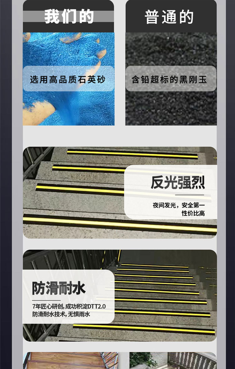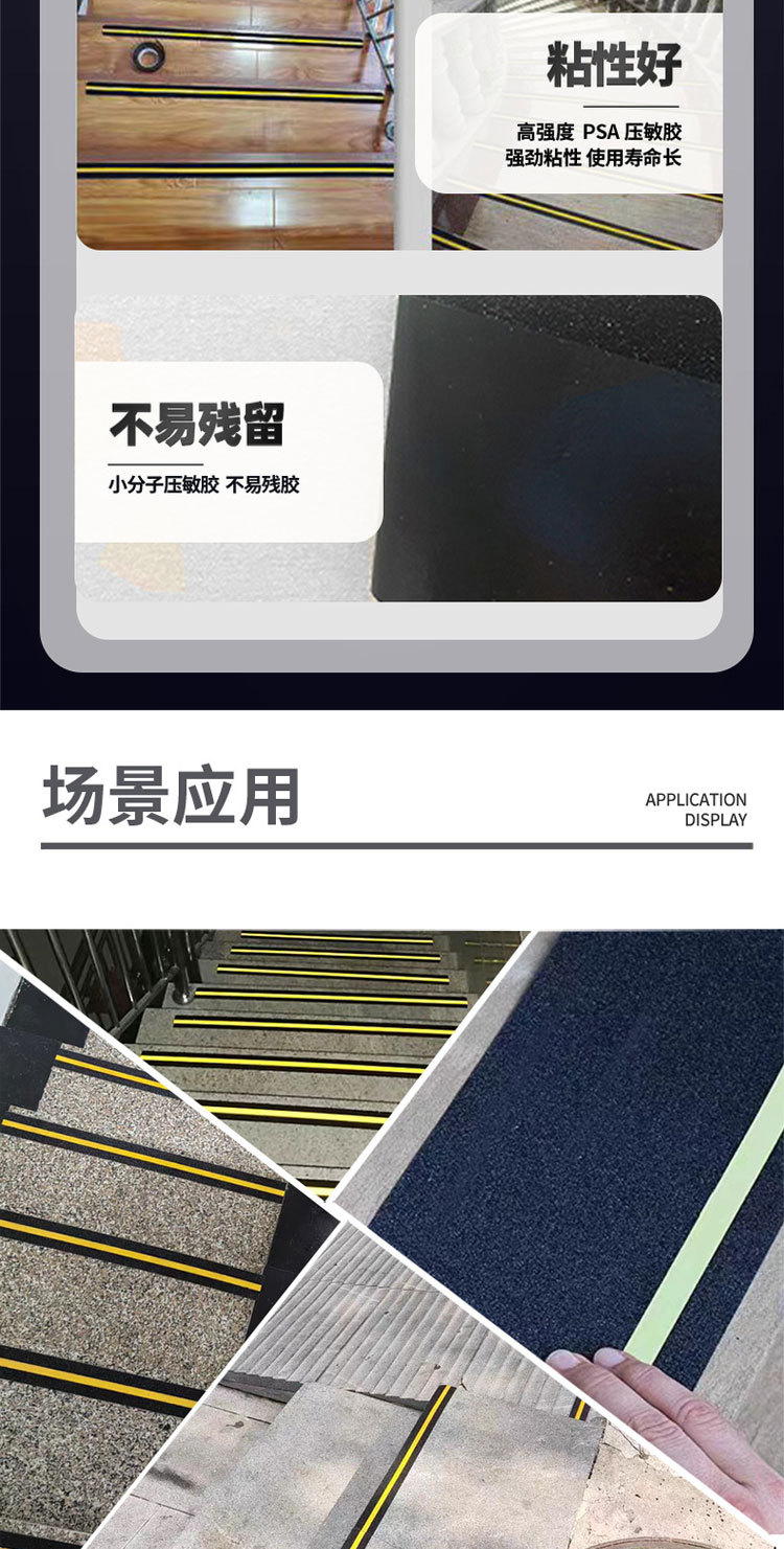 | Entorno de uso | Al contado, venta al por mayor transfronteriza de tiras reflectantes de esmerilado, escalones de escaleras, advertencias de seguridad, cintas antideslizantes, pegatinas antideslizantes, resistentes al desgaste e impermeables |