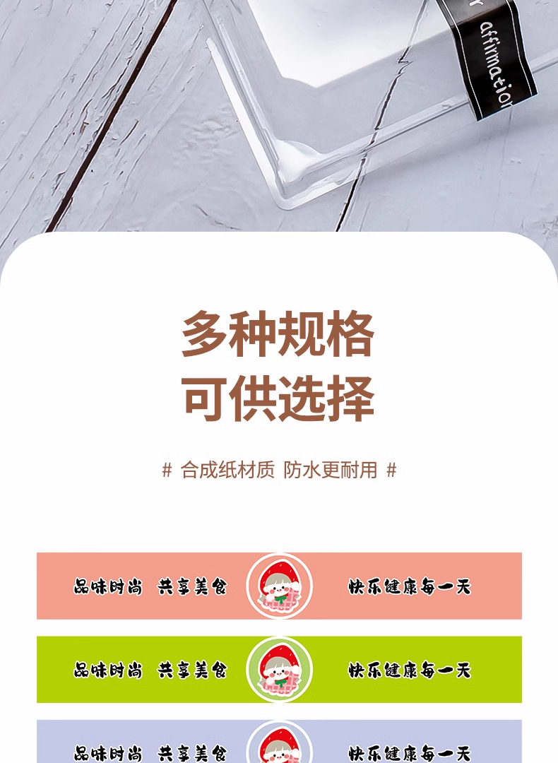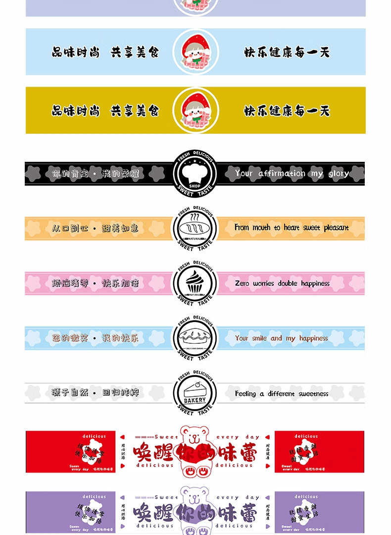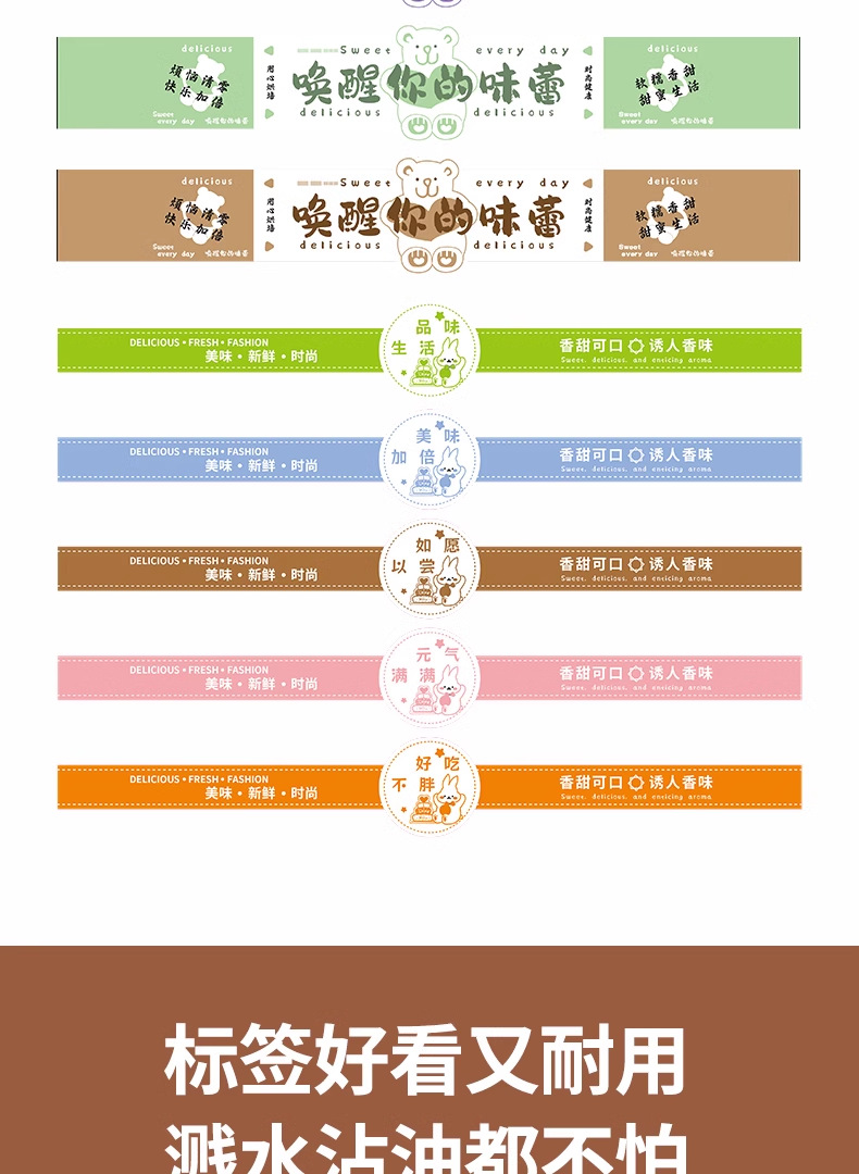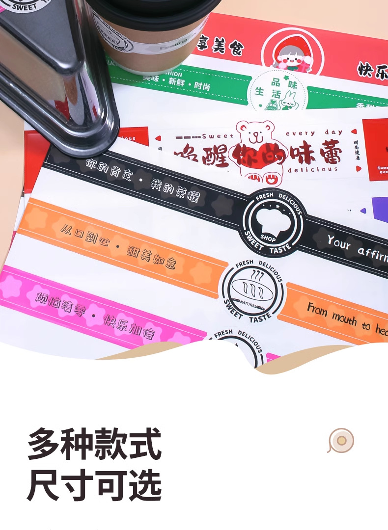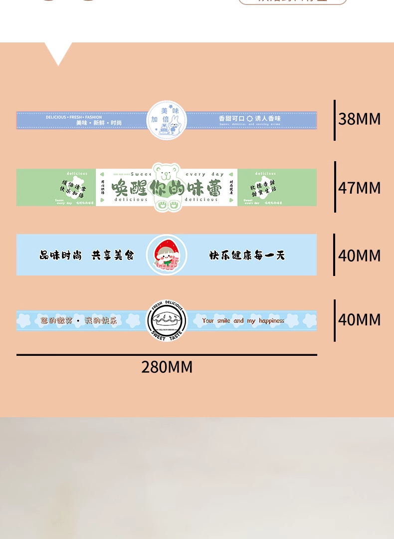 | Especificaciones y modelos | Sweet 280 * 40mm 5 pegatinas / 20 pegatinas / paquete, despertar 280 * 47mm 4 pegatinas / 20 pegatinas / paquete, delicioso y fresco 280 * 38mm 5 pegatinas / 20 pegatinas / paquete, saborear la moda 280 * 40mm 5 pegatinas / 20 pegatinas / paquete |