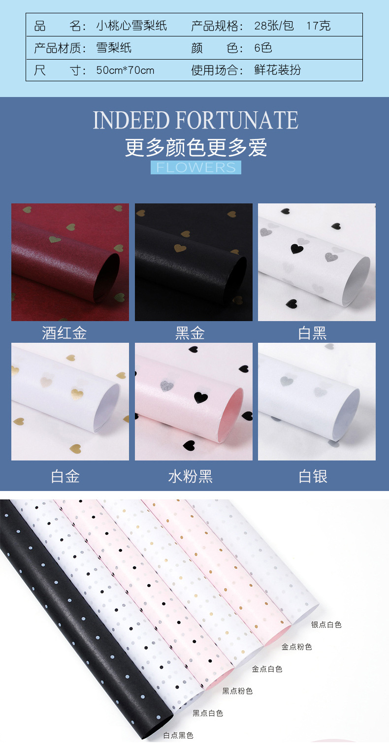 | Modelo de especificación | Papel de Sydney coreano-rosa 50*70cm;40 hojas/paquete,Papel de Sydney coreano-champán 50*70cm;40 hojas/paquete,Papel de Sydney coreano-morado claro 50*70cm;40 hojas/paquete,Papel de Sydney coreano-azul real 50*70cm;40 hojas/paquete,Papel de Sydney coreano-azul cielo 50*70cm;40 hojas/paquete,Papel de Sydney coreano-café 50*70cm;40 hojas/paquete,Papel de Sydney coreano-rojo vino 50*70cm;40 hojas/paquete,Papel de Sydney coreano-negro 50*70cm;40 hojas/paquete,Papel de Sydney coreano-gris oscuro 50*70cm;40 hojas/paquete,Papel de Sydney de punto redondo grande: oro redondo de polvo coreano (20 hojas);20 hojas/paquete,Papel de Sydney de punto redondo grande-Han rosa negro redondo (20 hojas);20 hojas/paquete,Papel de Sydney de punto redondo grande-oro redondo blanco (20 hojas);20 hojas/paquete,Papel de Sydney de punto redondo grande-oro redondo rojo (20 hojas);20 hojas/paquete,Papel de Sydney de punto redondo grande-oro redondo negro (20 hojas);20 hojas/paquete,Papel de Sydney de punto redondo grande-blanco redondo negro (20 hojas);20 hojas/paquete,Papel de Sydney de punto redondo grande-blanco rojo redondo (20 hojas; 20 hojas/paquete,Papel de Sydney de punto redondo grande-blanco redondo azul (20 hojas);20 hojas/paquete,Papel de Sydney de punto redondo grande-plata redonda blanca (20 hojas);20 hojas/paquete,Han Cai Sydney Paper-Little Peach Heart-Wine Red Gold; 28 hojas/paquete,Papel Han Cai Sydney-Corazón de melocotón pequeño-Oro negro; 28 hojas/paquete,Papel Han Cai Sydney-Corazón de melocotón pequeño-Blanco y negro; 28 hojas/paquete,Han Cai Sydney Paper-Little Peach Heart-Silver; 28 hojas/paquete,Hancai Sydney Paper-Little Peach Heart-gouache Black; 28 hojas/paquete,Hancai Sydney Paper-Little Peach Heart-gouache Gold; 28 hojas/paquete,Hancai Sydney Paper-Little Dot-White Dot Black; 28 hojas/paquete,Hancai Sydney Paper-Little Dobls-Black Dobls Pink; 28 hojas/paquete,Hancai Sydney Paper-Little Dot-Golden Dot White; 28 hojas/paquete,Hancai Sydney Paper-Little Dot-Golden Dot Rosa; 28 hojas/paquete,Hancai Sydney Paper-Little Dot-Silver Dot White; 28 hojas/paquete,Hancai Sydney Paper-Pearl Purple; 28 hojas/paquete,Hancai Sydney Paper-Pearl Blue; 28 hojas/paquete |