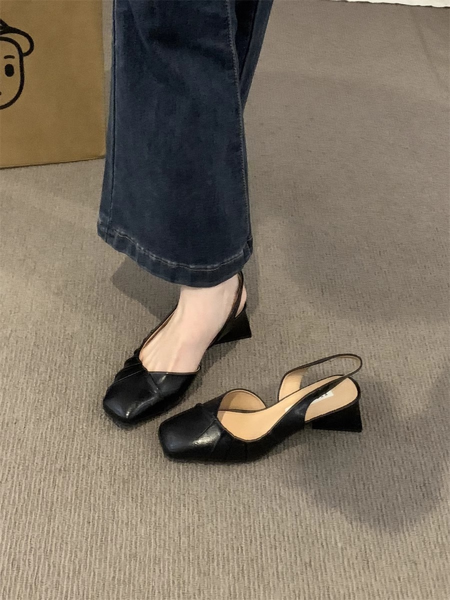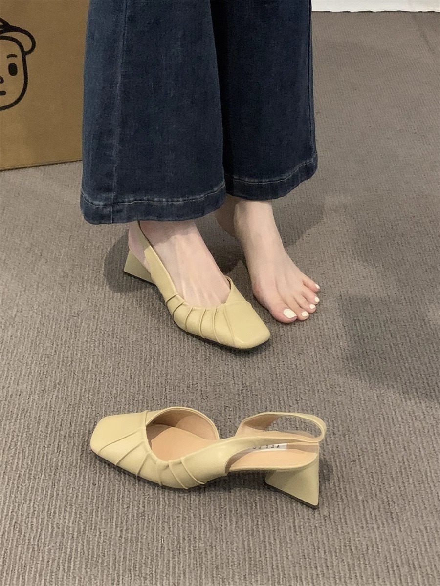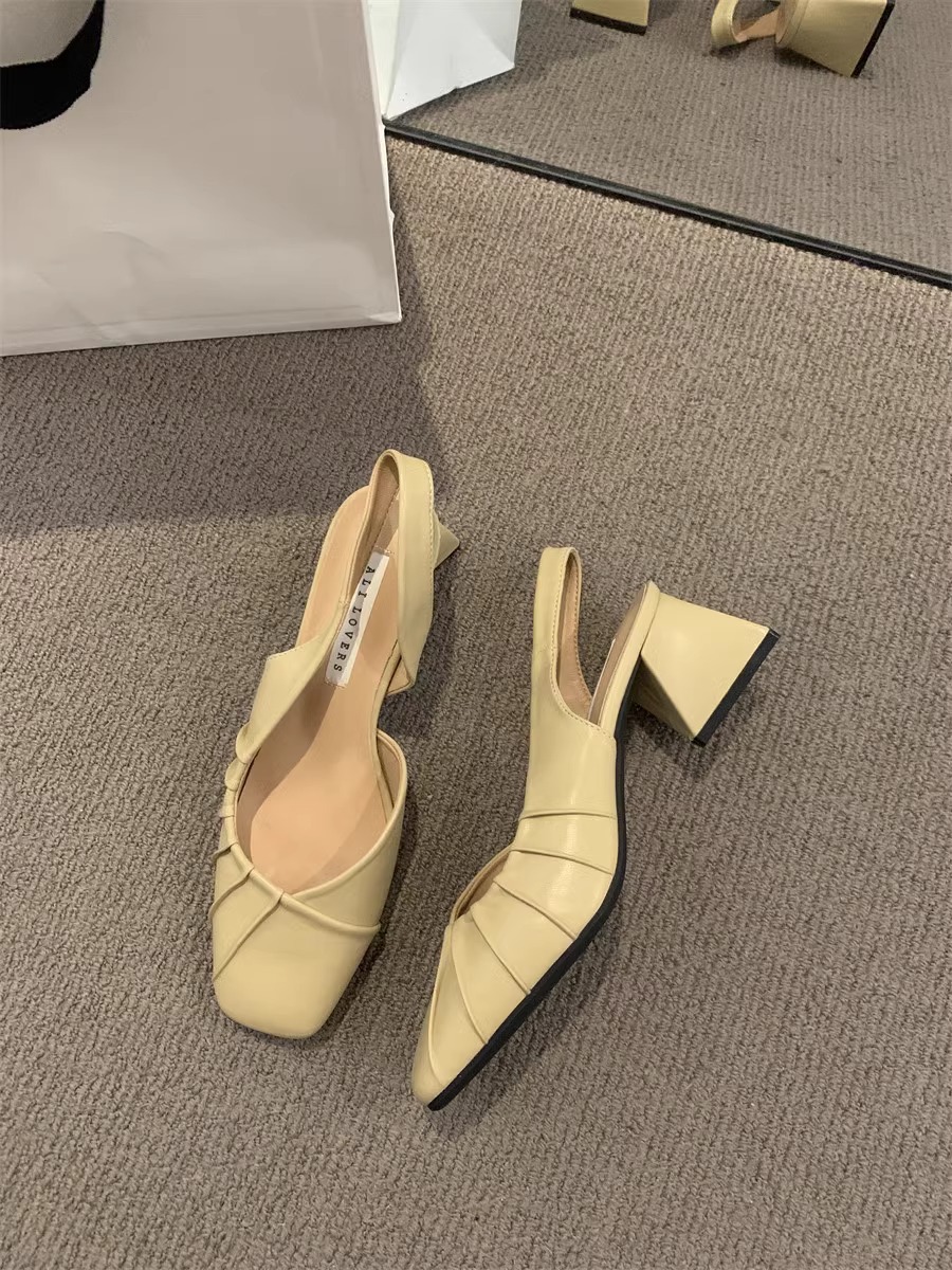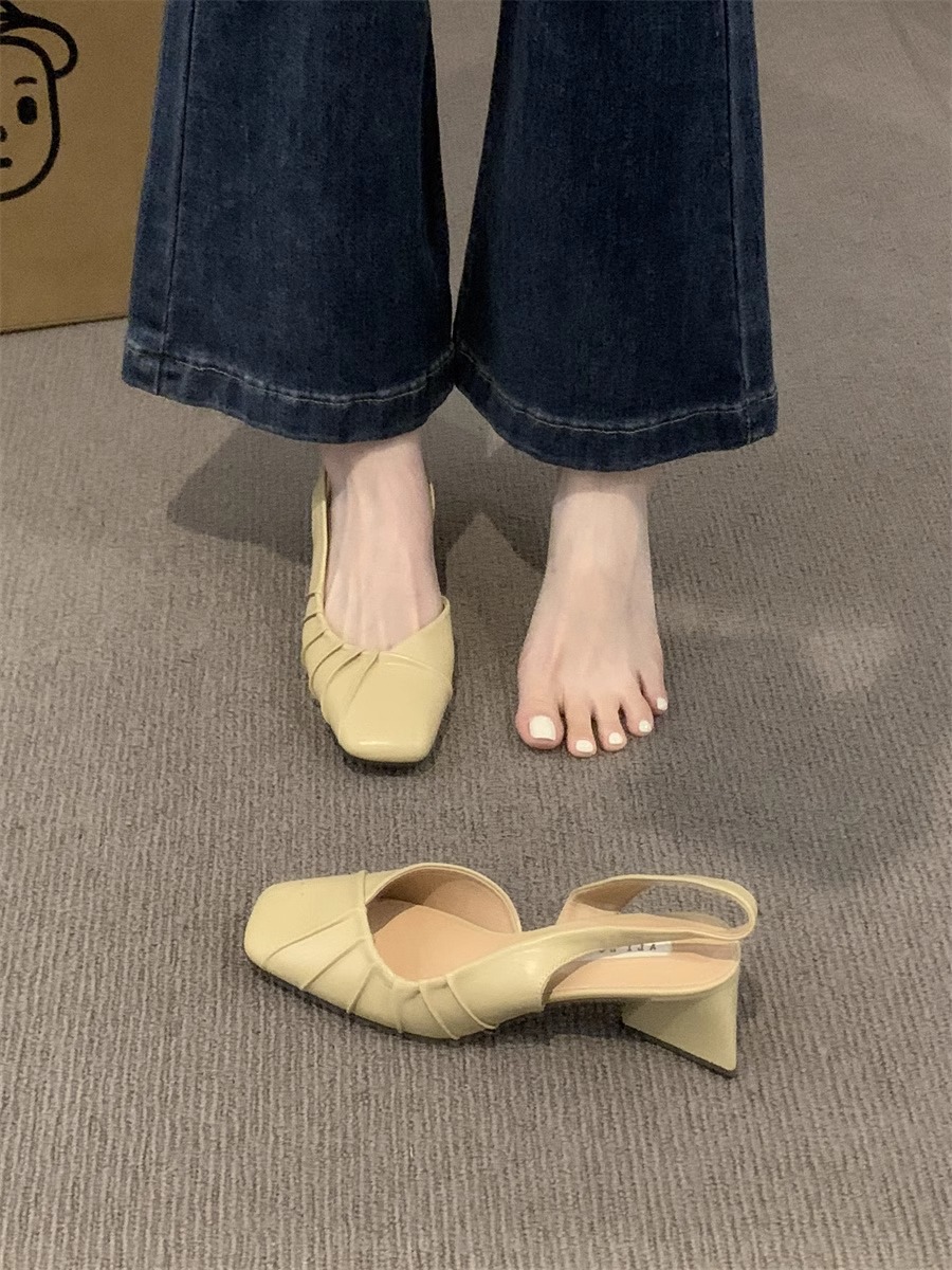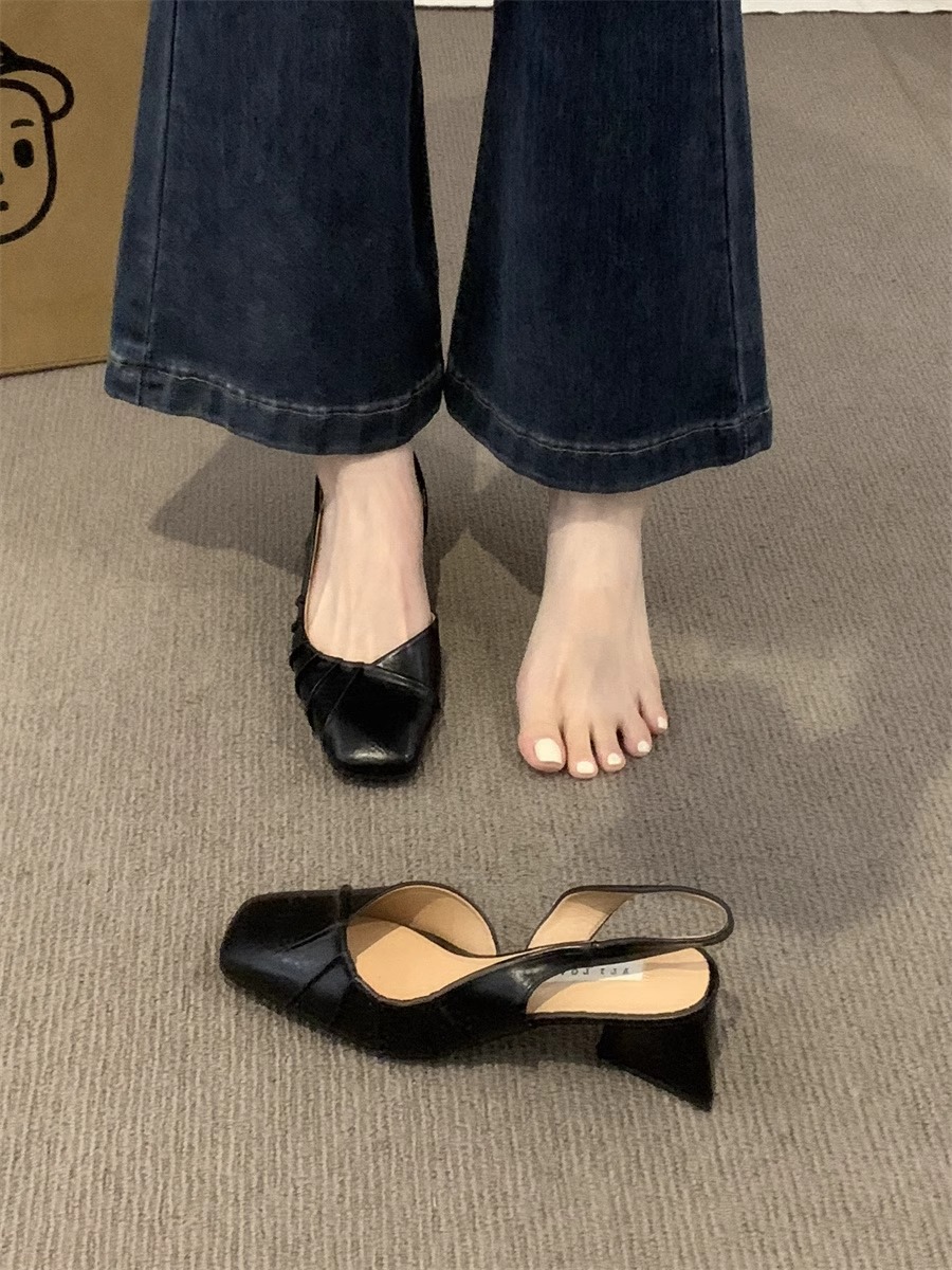 2024 primavera y verano nuevo estilo de tacón alto Baotou sandalias vacías trasero zapatos de mujer tacón grueso boca baja estilo suave francés zapatos individuales zapatos de mujer