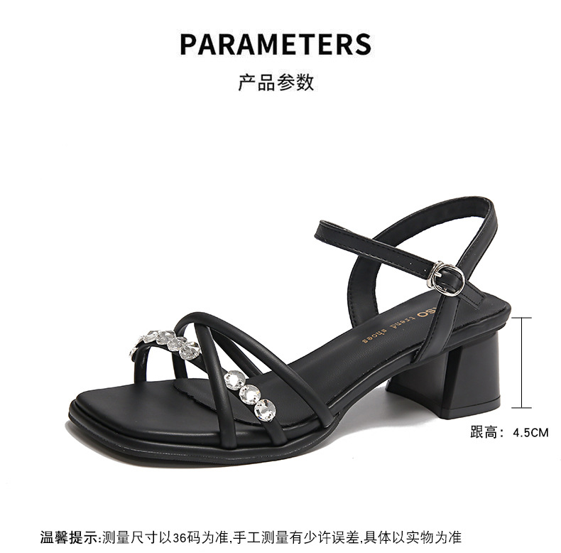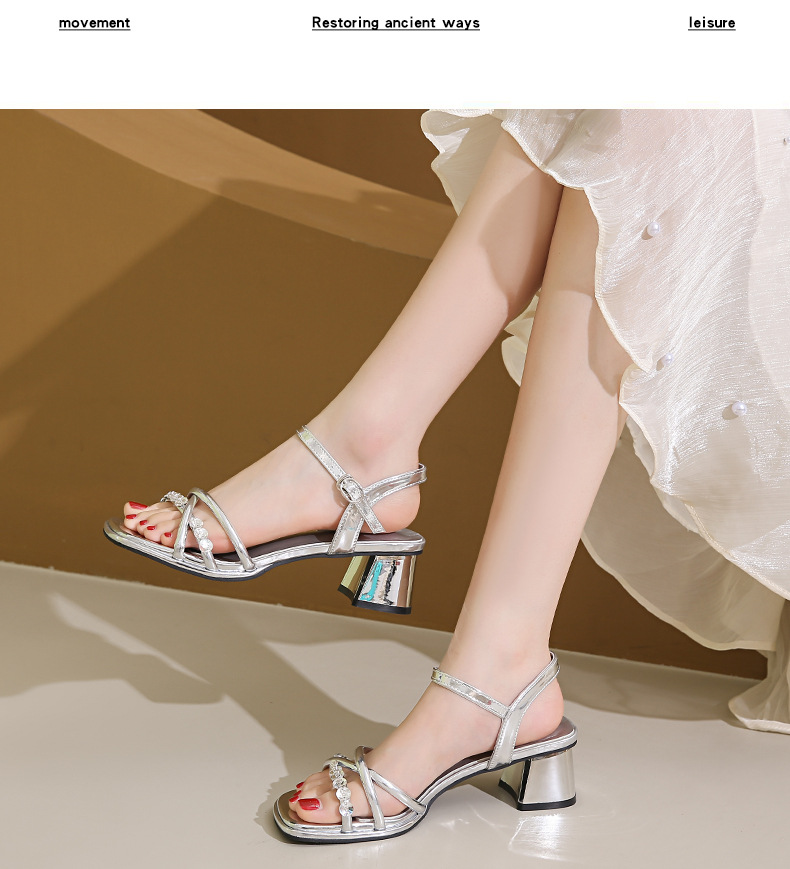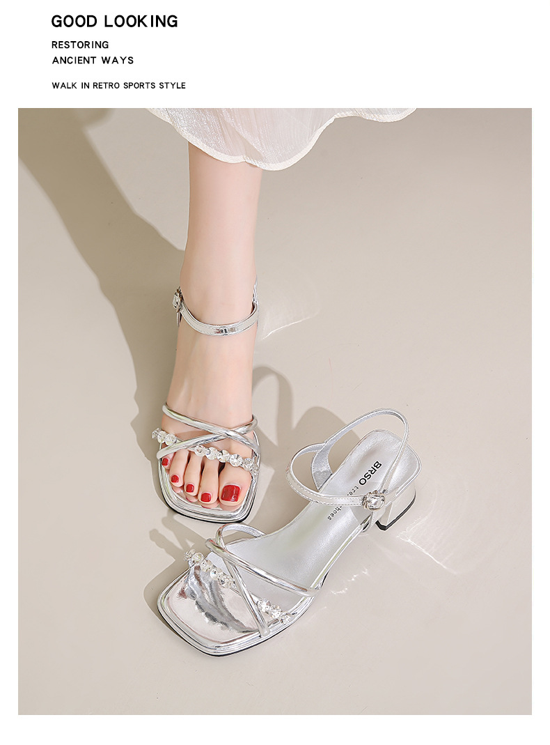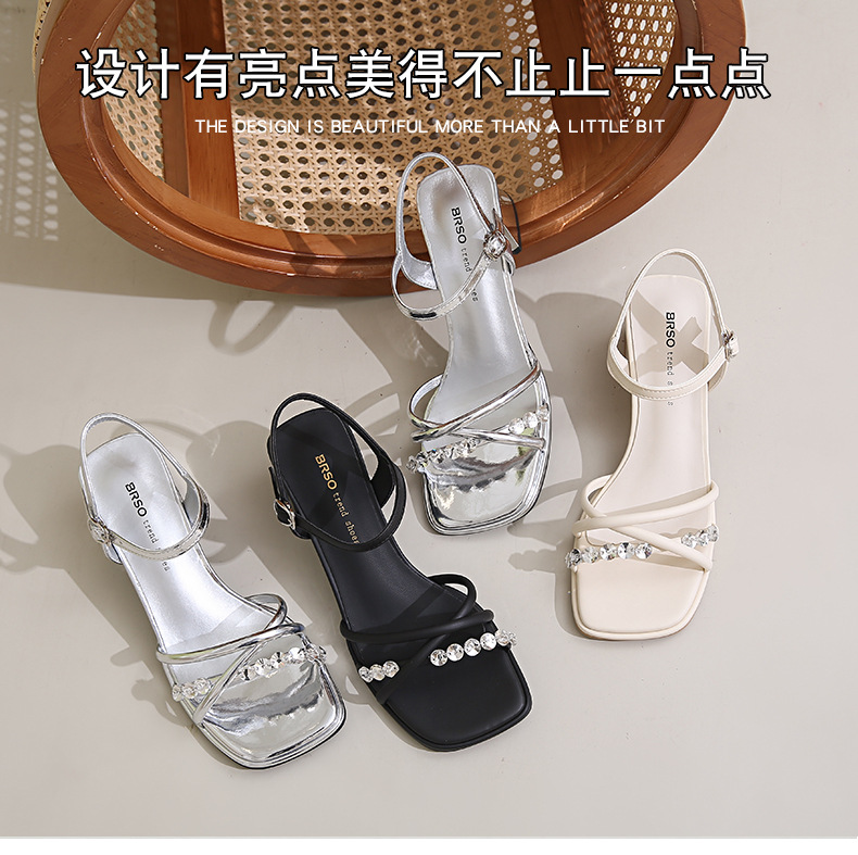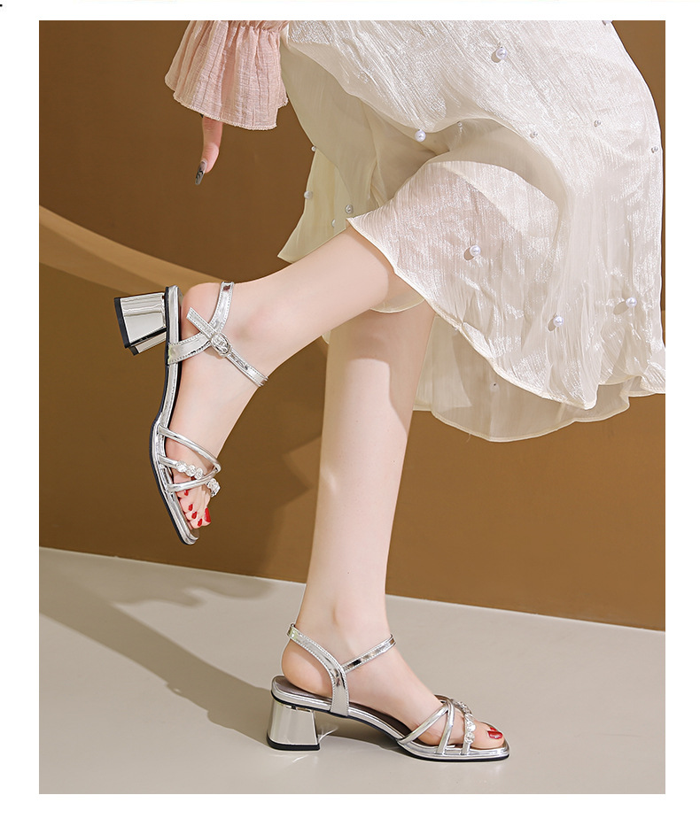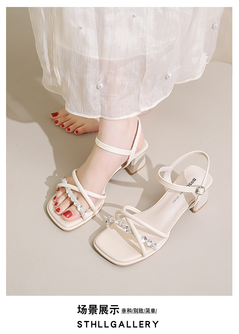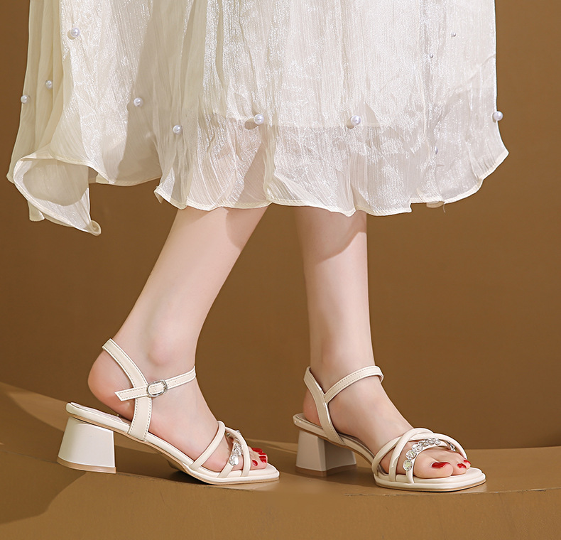 Sandalias francesas de tacón medio de tacón alto para mujer 2025 nuevo estilo de verano con zapatos de tacón grueso de diamantes de imitación con falda Sandalias de hadas