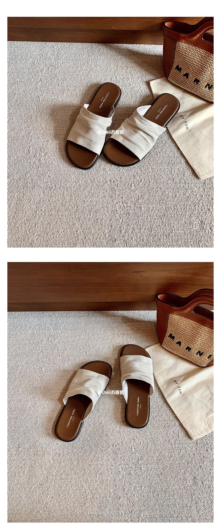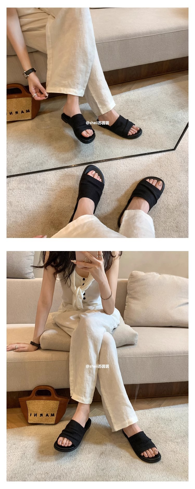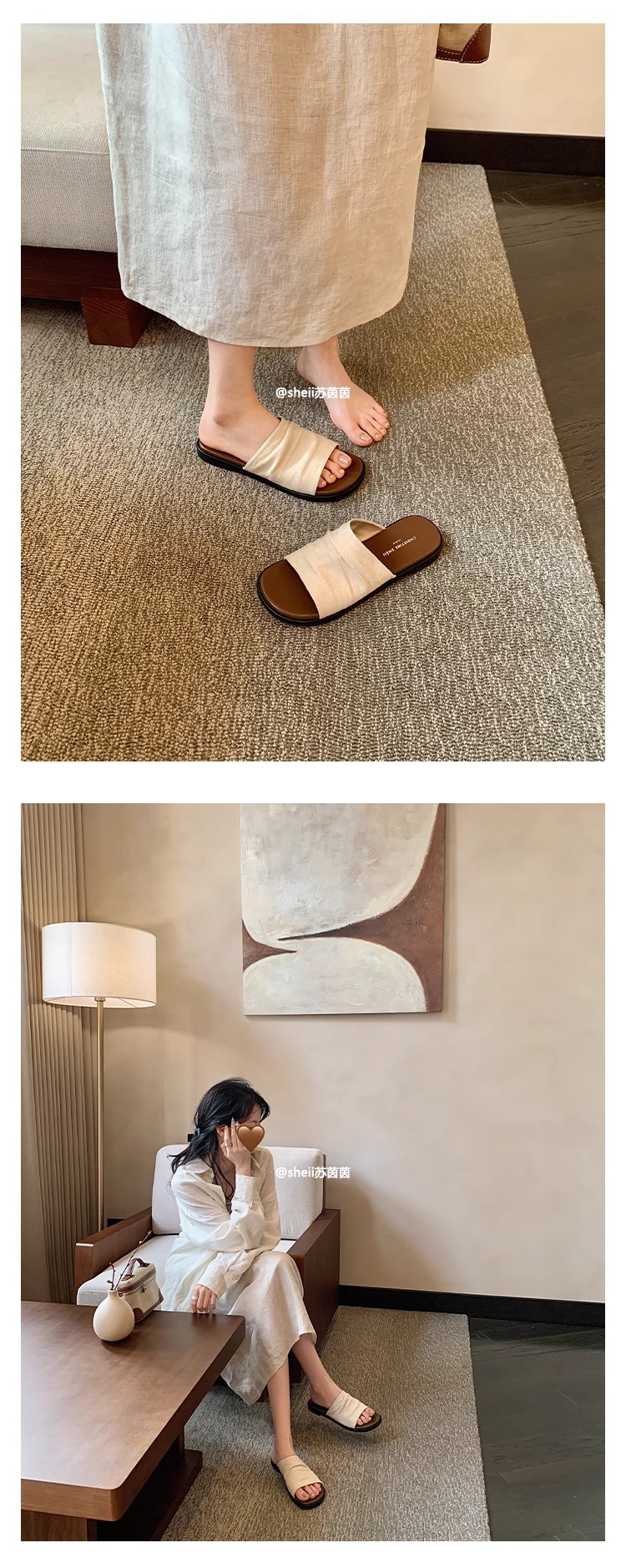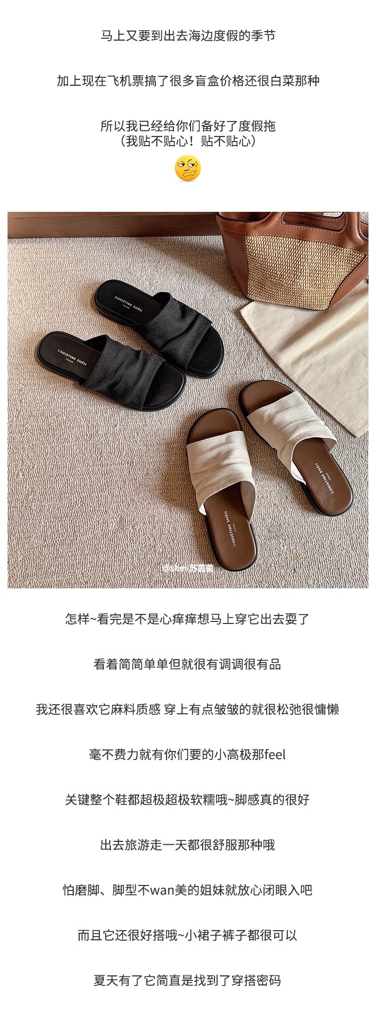 [Sheii Su Yinyin] Bangkok drag ~ Sandalias planas plisadas de lino de playa estilo resort, zapatillas de mujer, verano