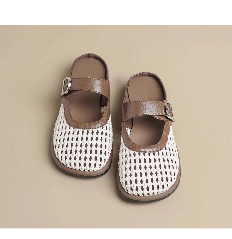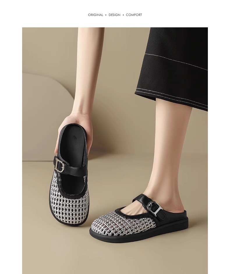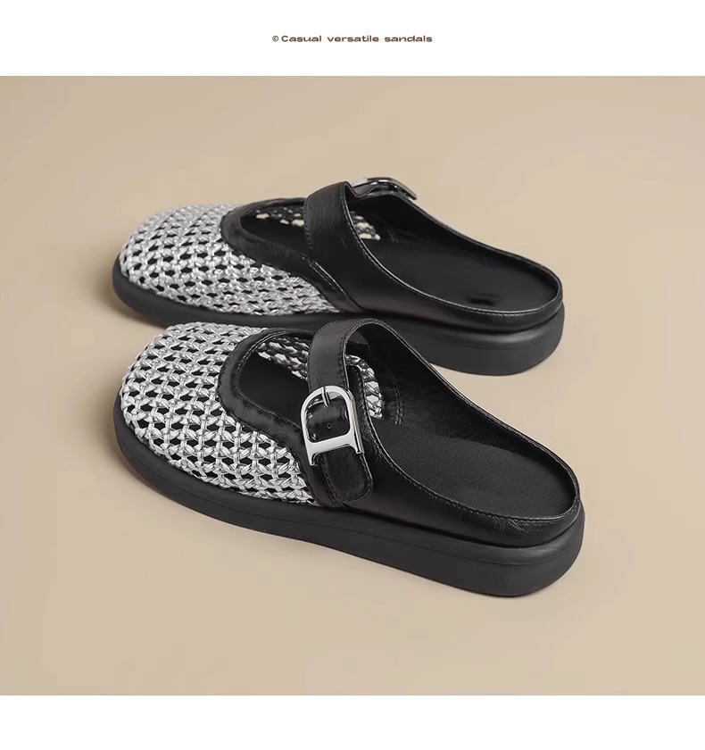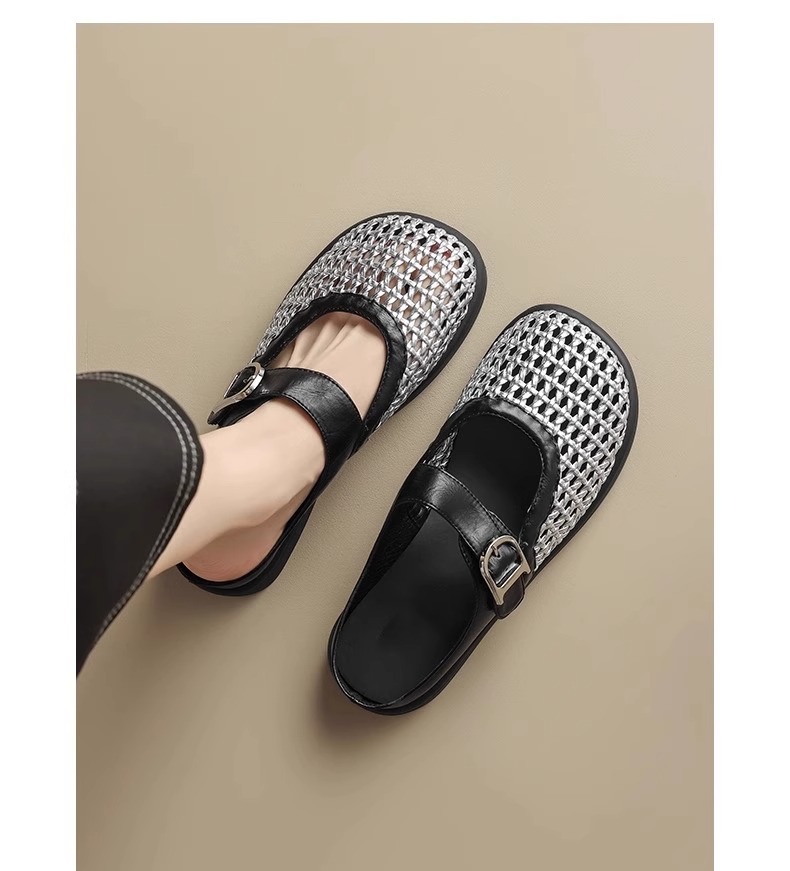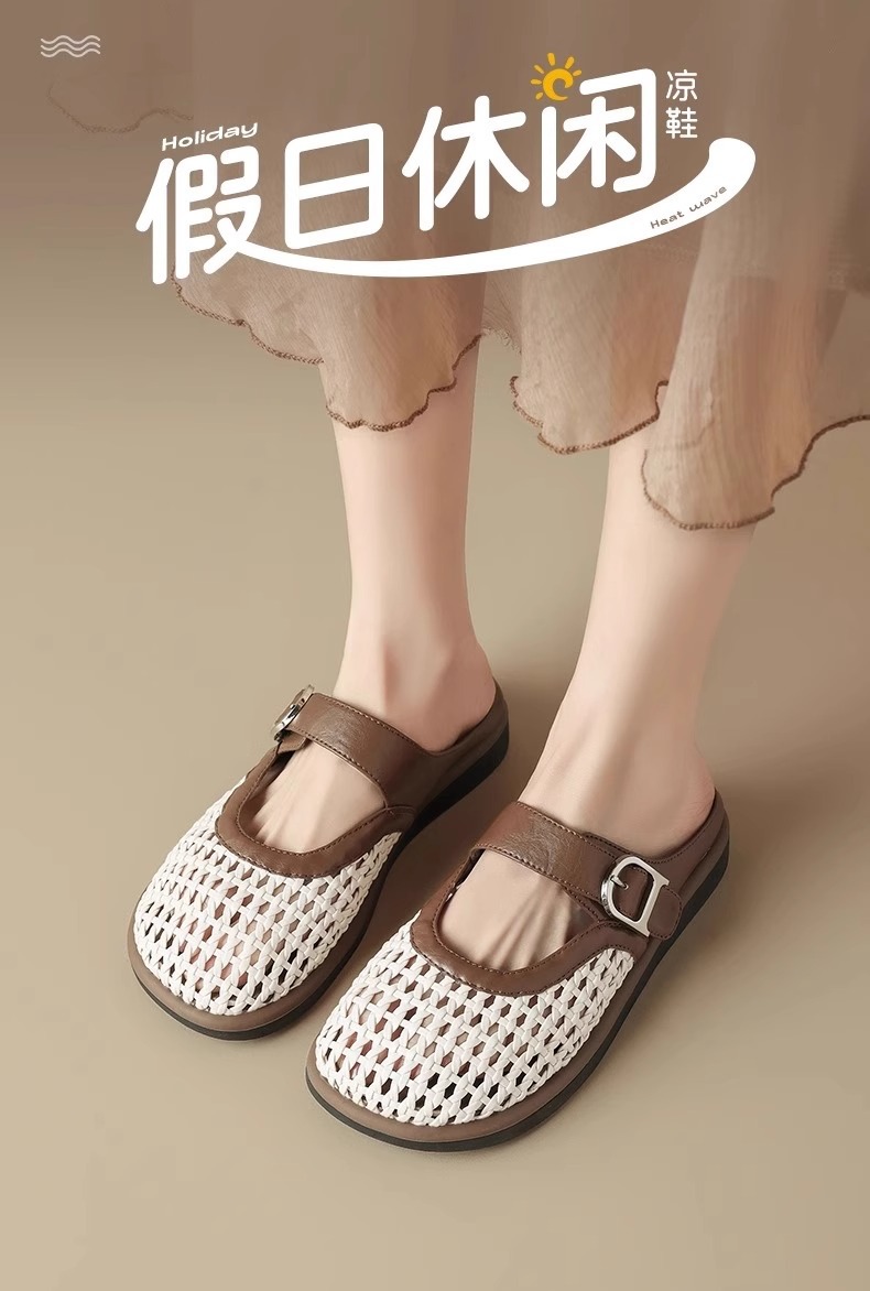 [Su Yinyin mismo párrafo] Hilo de malla streamer ~ Red de diamantes de imitación hebilla transpirable Baotou vacaciones zapatillas mujer medio arrastre verano