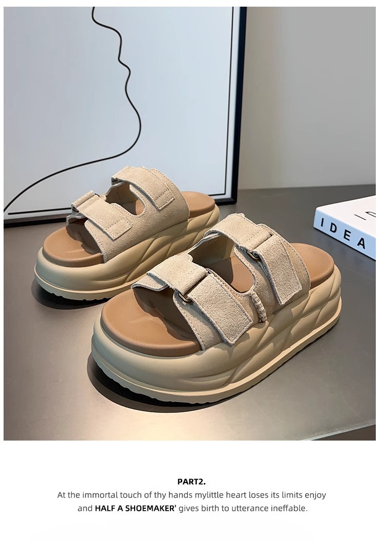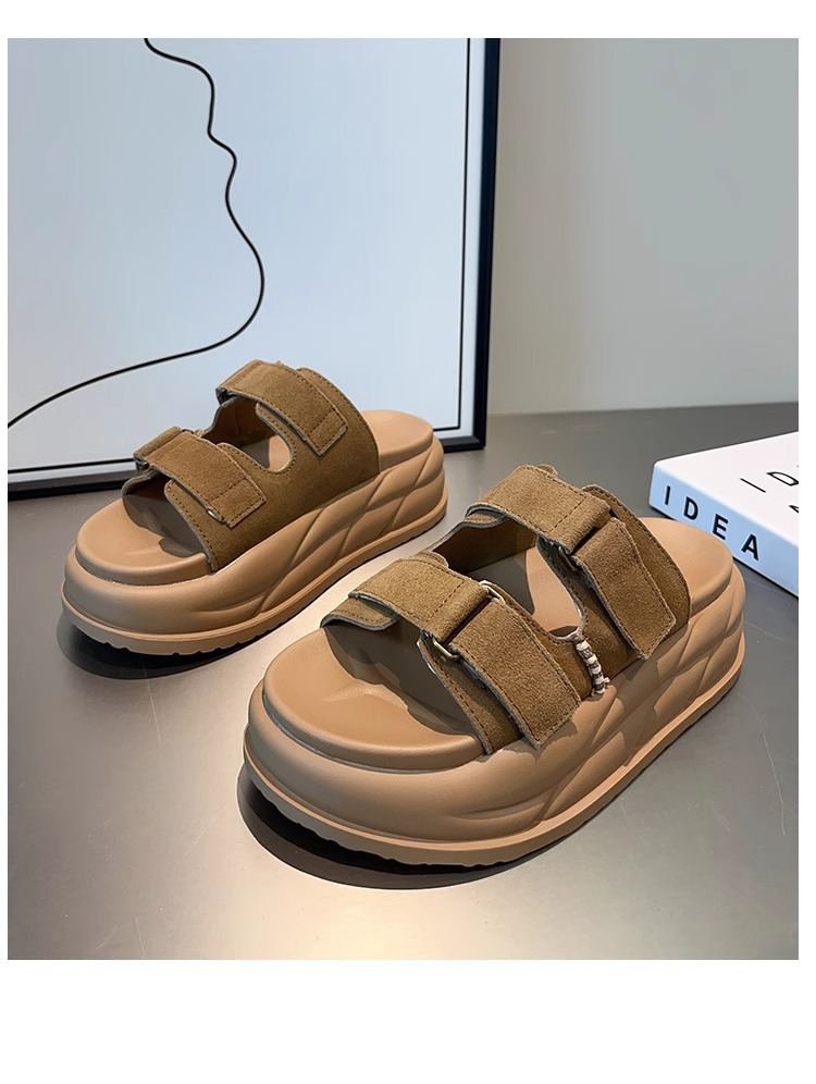 Pantuflas de cuero para mujer, sandalias y pantuflas casuales de verano 2025, pantuflas retro de fondo grueso con velcro de nuevo estilo