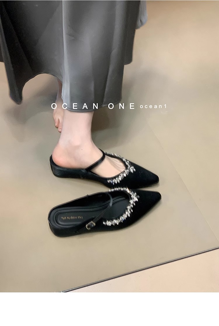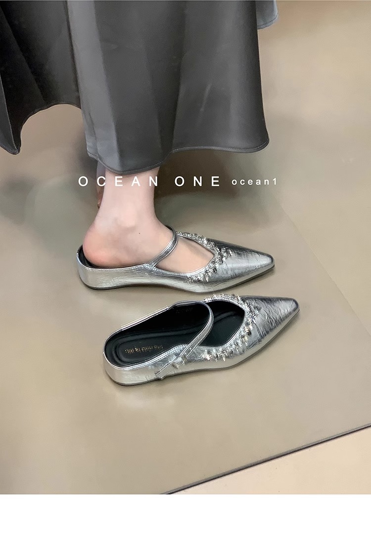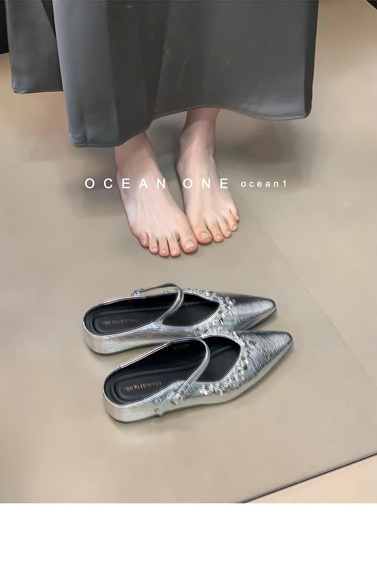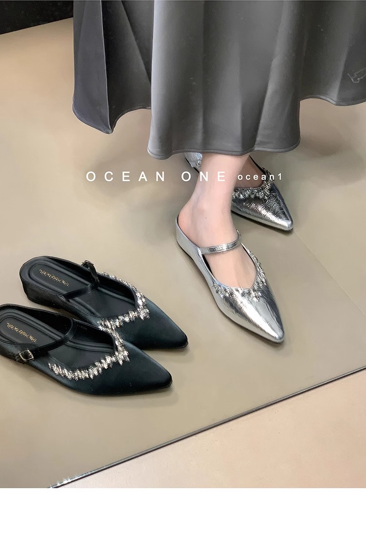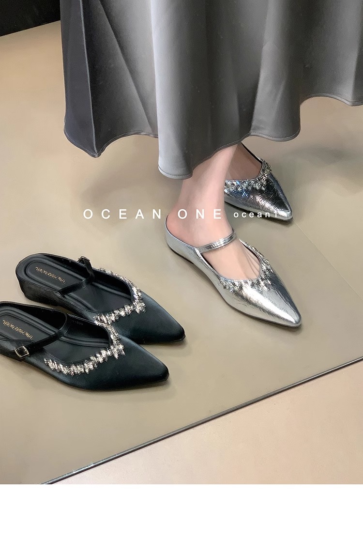 Aumento interior 3CM punta puntiaguda plata diamantes de imitación Baotou medias pantuflas zapatos de mujer ropa exterior 2025 primavera y verano zapatos franceses individuales