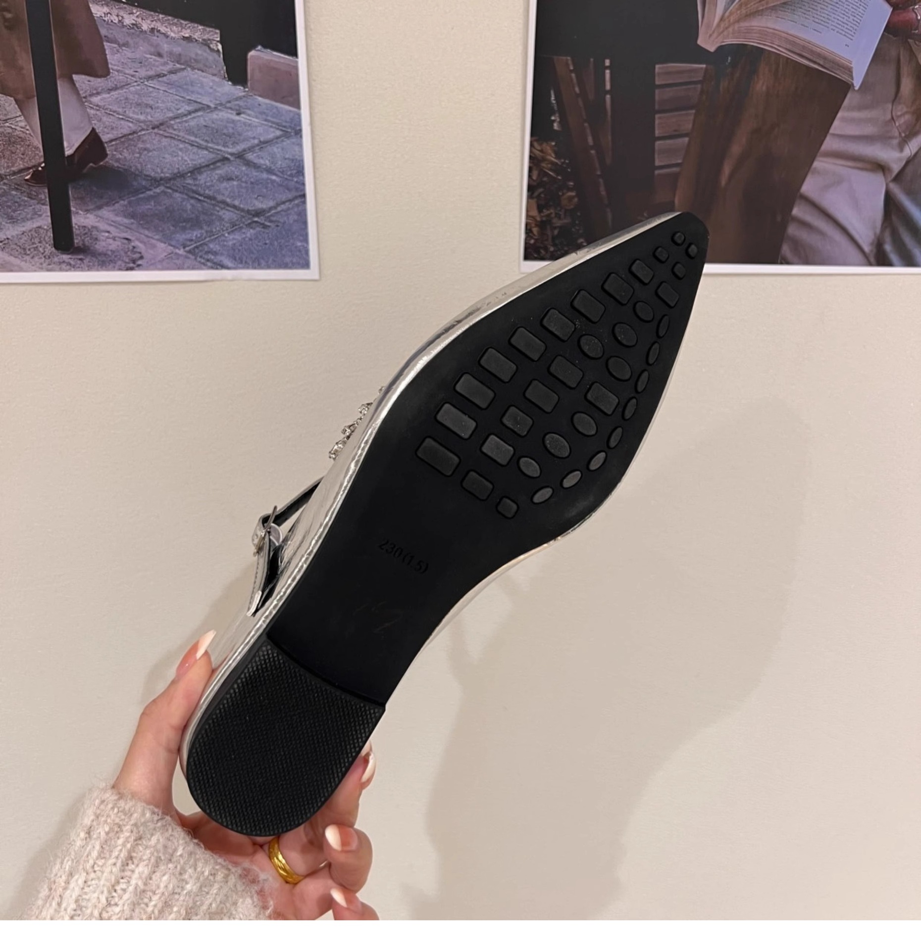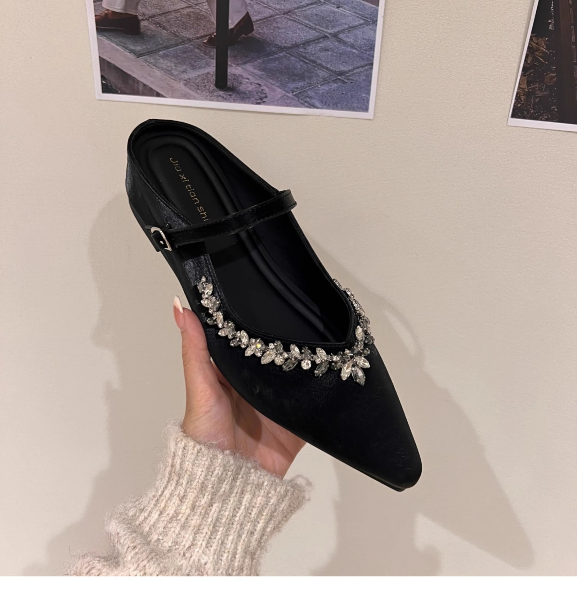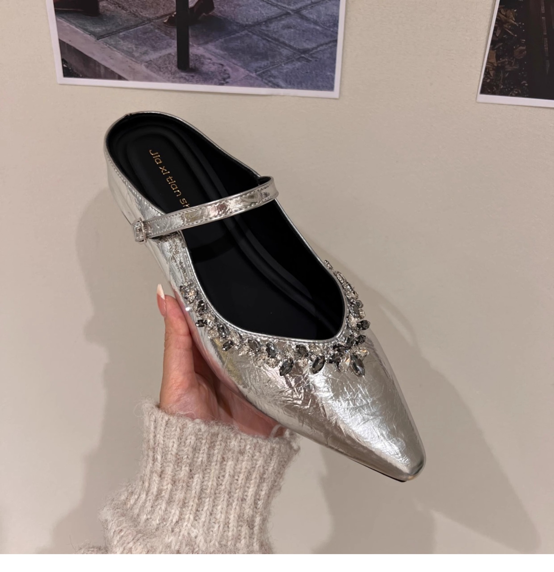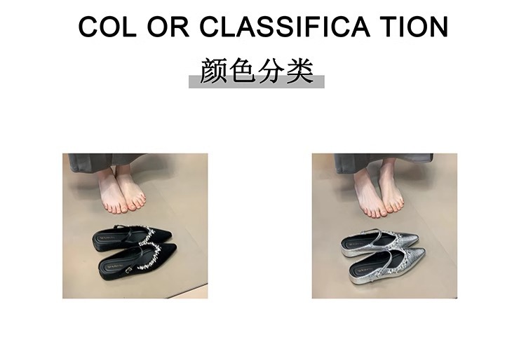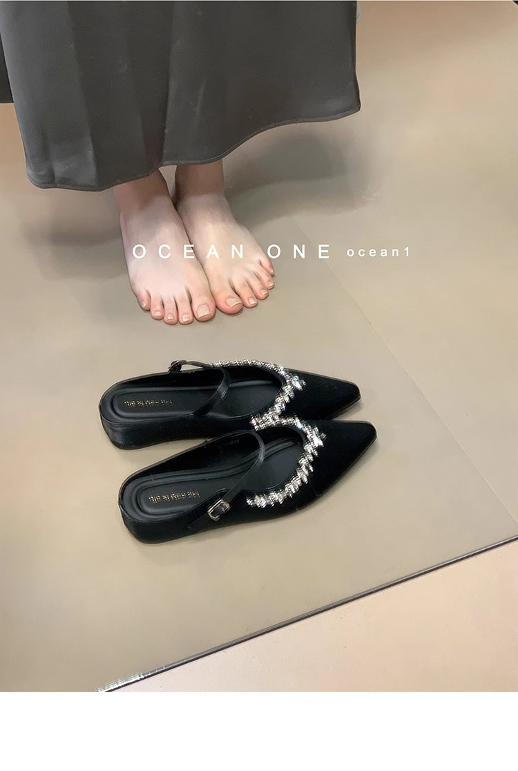 Aumento interior 3CM punta puntiaguda plata diamantes de imitación Baotou medias pantuflas zapatos de mujer ropa exterior 2025 primavera y verano zapatos franceses individuales