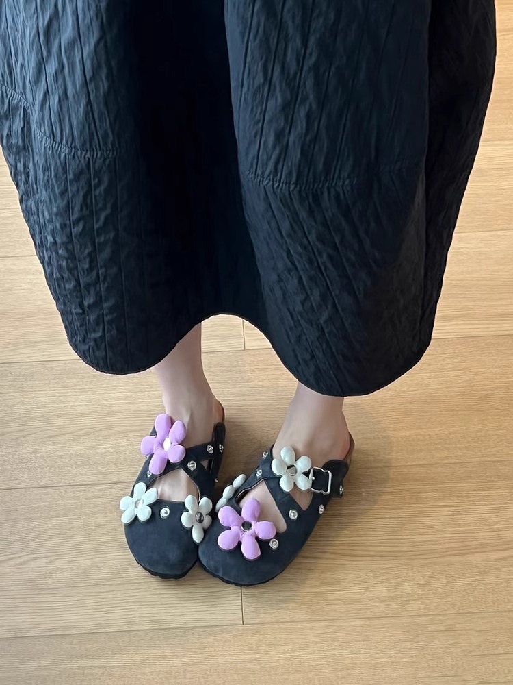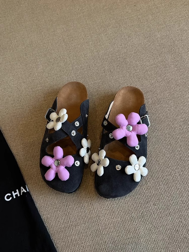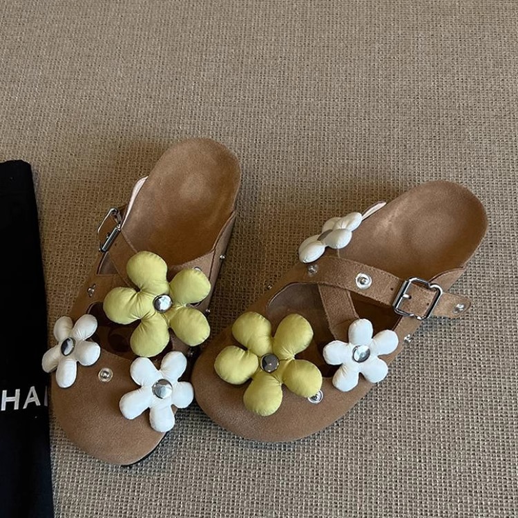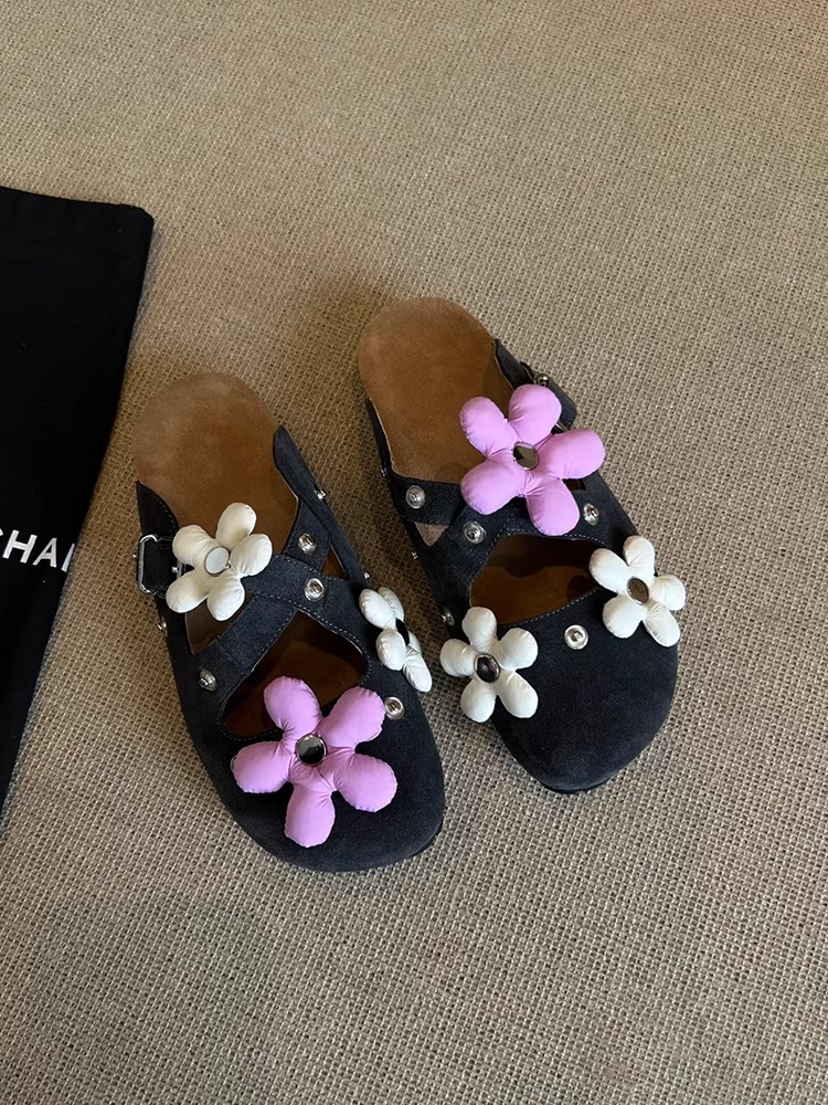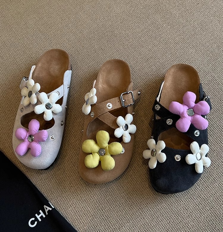 Versión de piel de oveja ~ Diseño de nicho hebilla de flor desmontable Birkenmuller zapatos mujer remache retro suela gruesa zapatillas de puntera