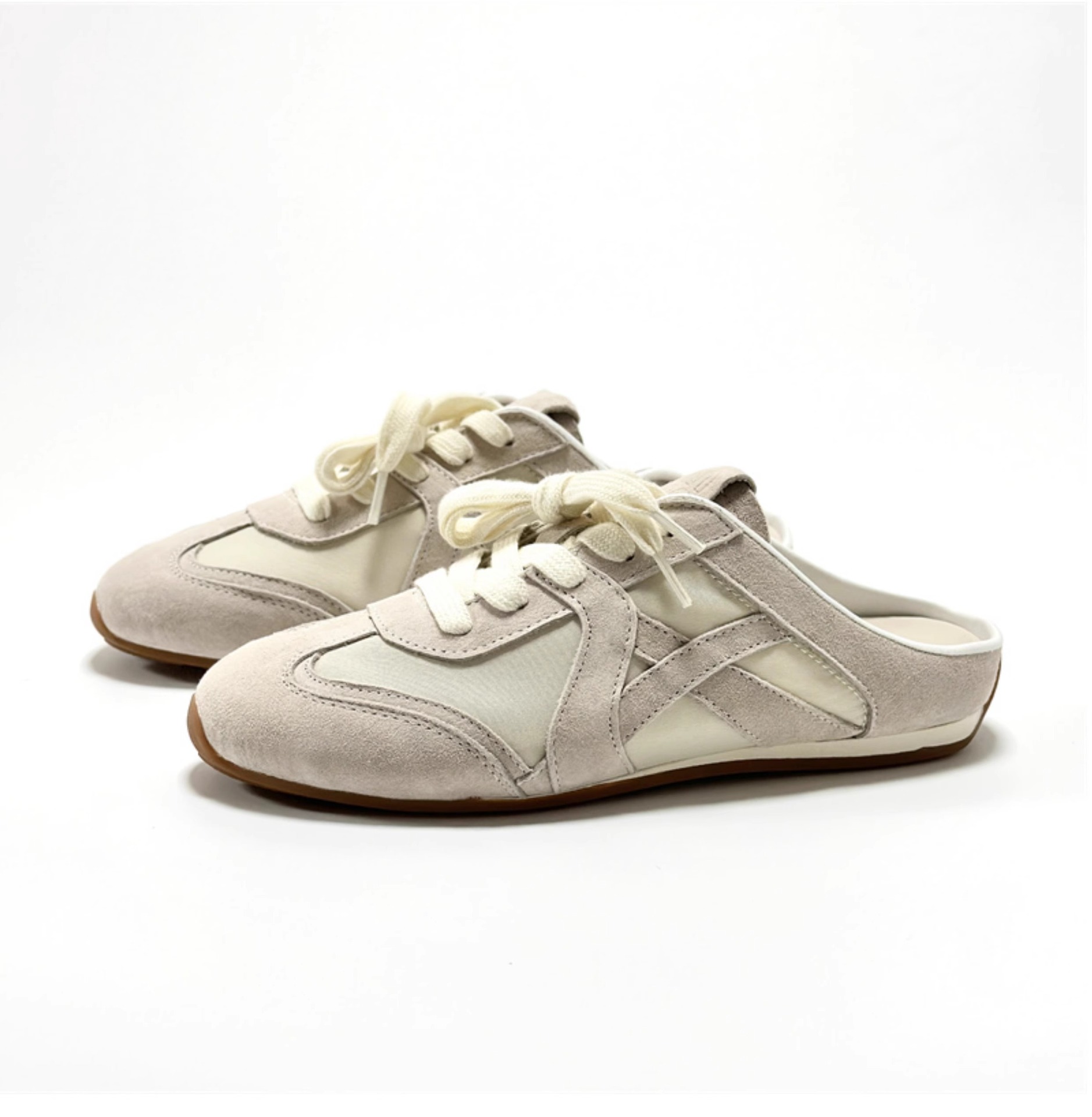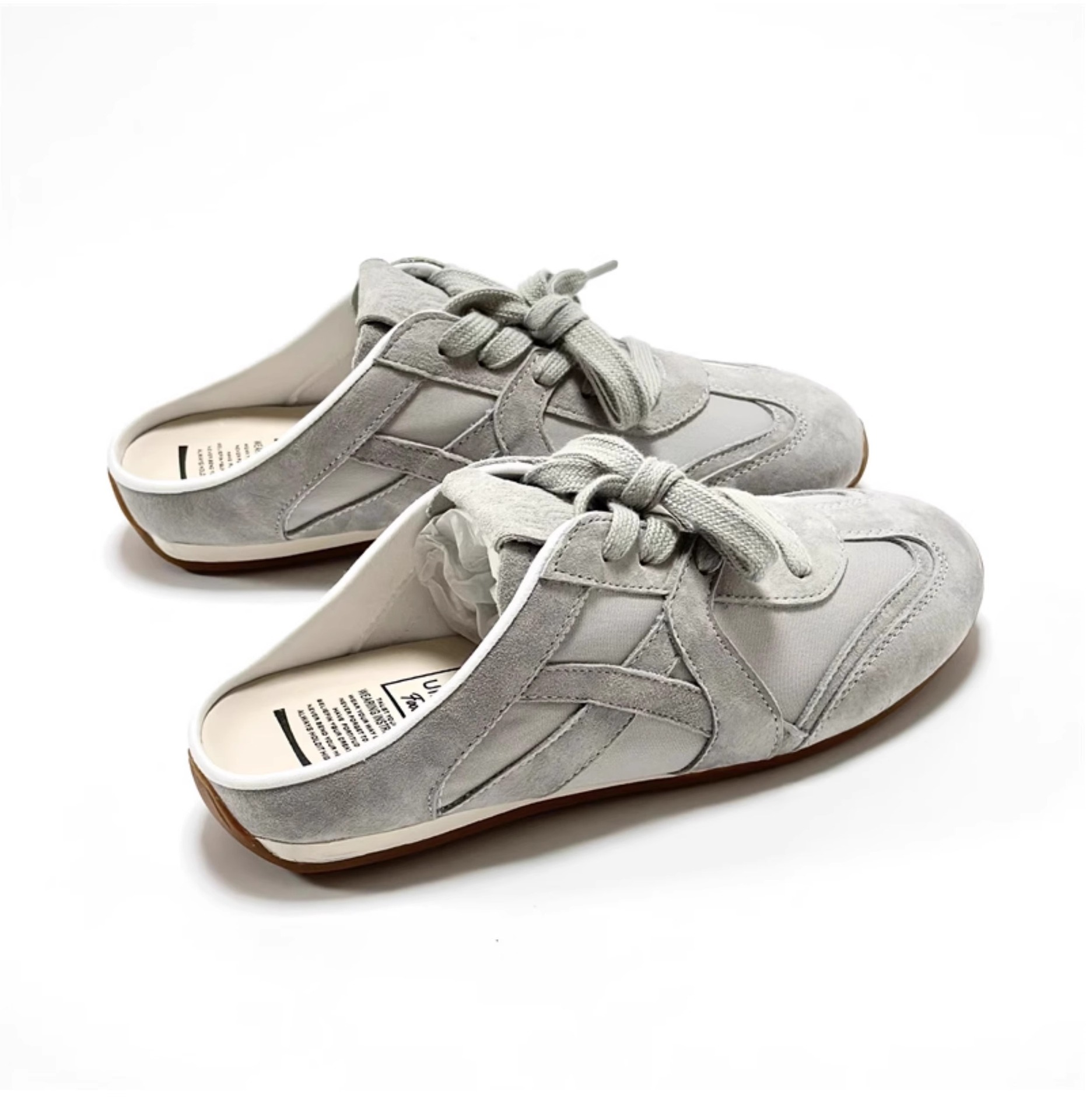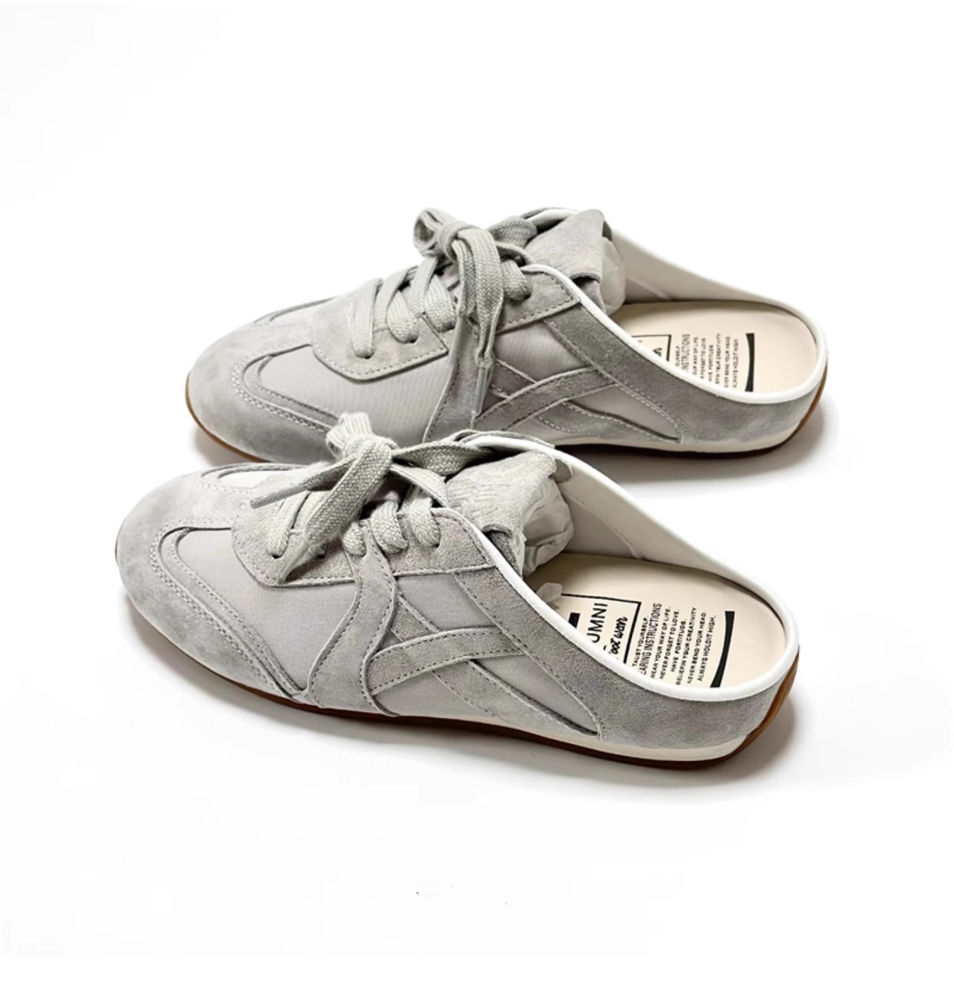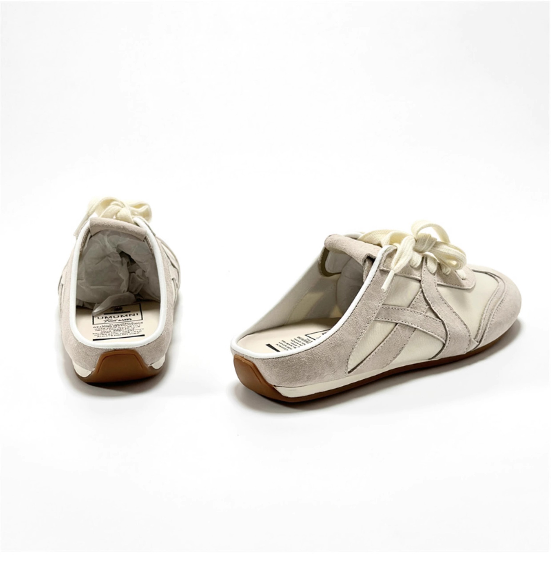 Versión coreana de las medias pantuflas de entrenamiento alemán para mujer, ropa exterior de verano, medias pantuflas de cuero a juego de color plano, zapatos blancos perezosos sin tacón