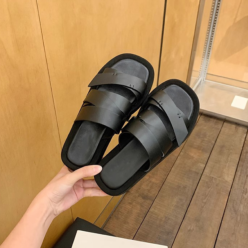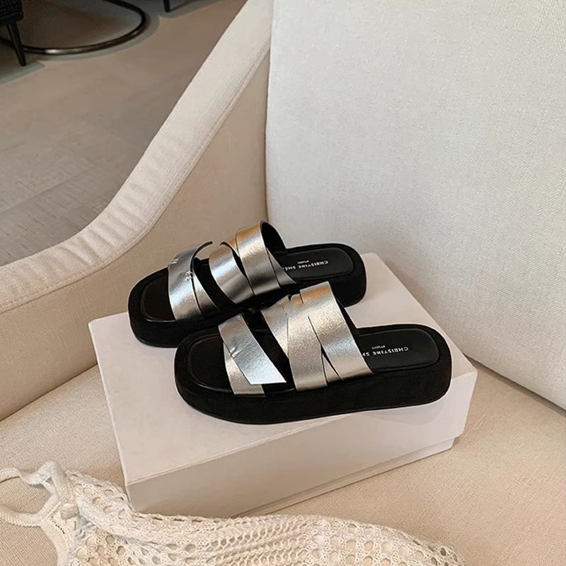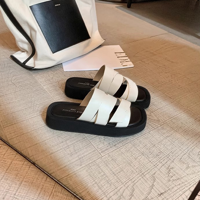 Estilo explosivo, aumento de las celebridades de Internet para el hogar, el mismo estilo, piel de zorro, todo fósforo, antideslizante, zapatillas de una palabra con fondo de bizcocho femenino de moda