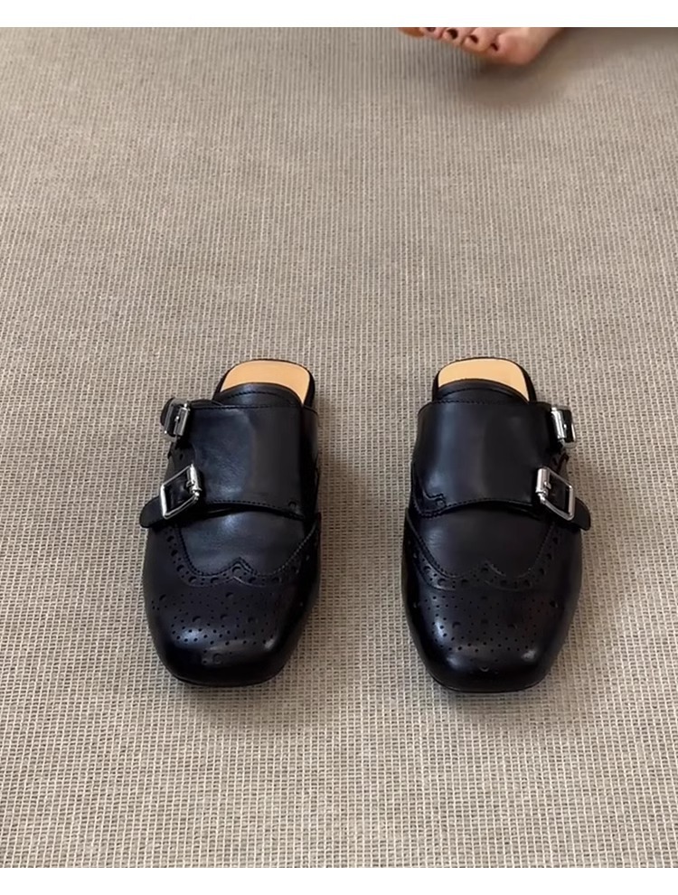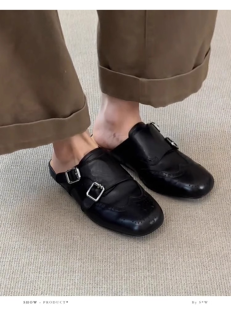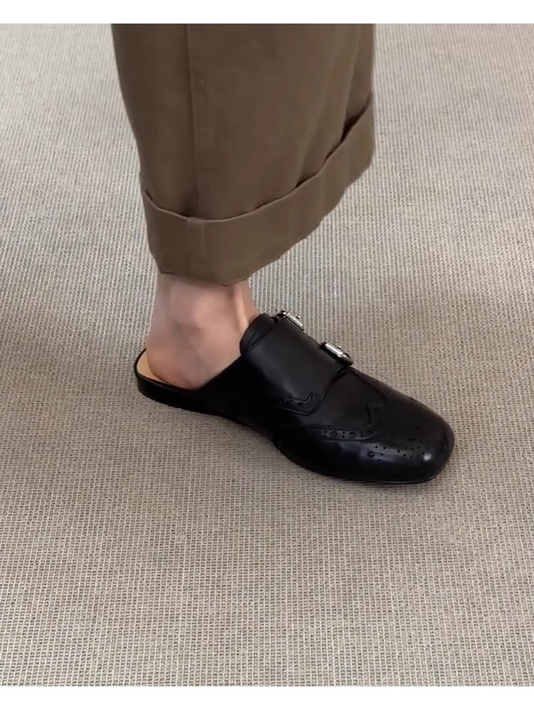 La marea no es sur ~ Zapatos con cabeza de bolso negro de cuero cruzado de un pie para mujer retro todo fósforo cabeza cuadrada media pantufla Brock