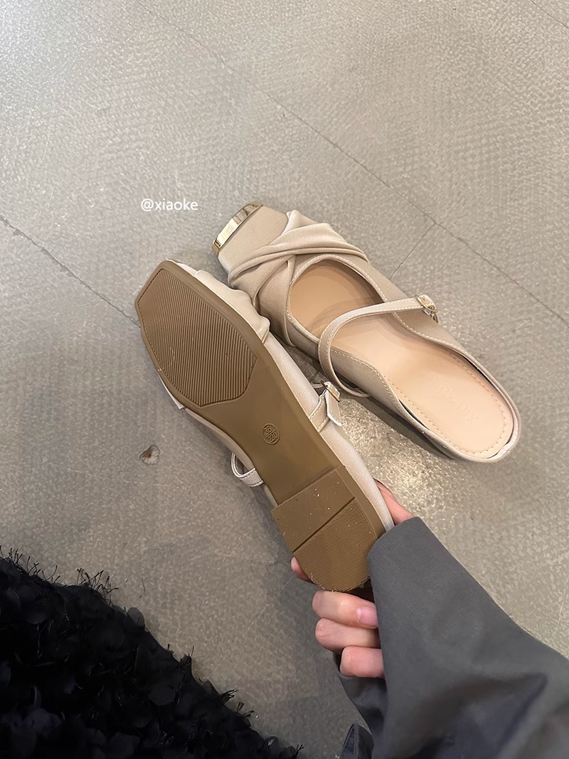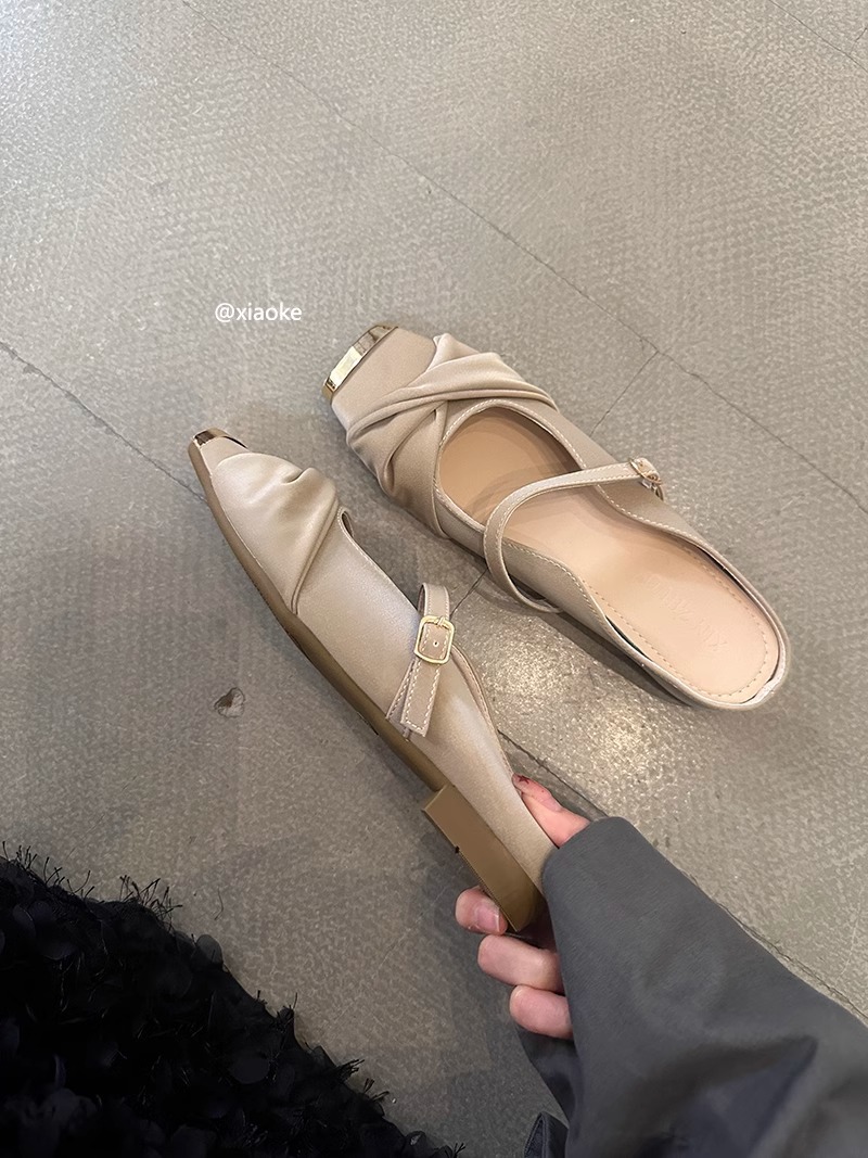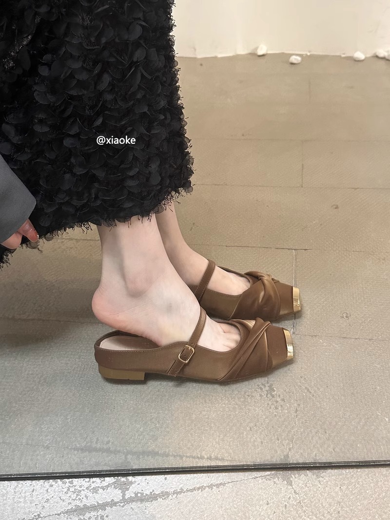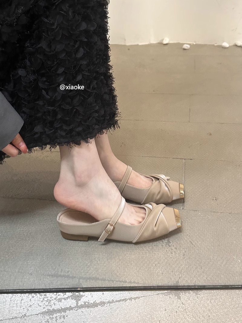 Cabeza cuadrada de metal, tacón plano, medio arrastre, modelo de primavera 2025, zapatillas de suela suave de cuero suave, las mujeres usan zapatos Mary Jane