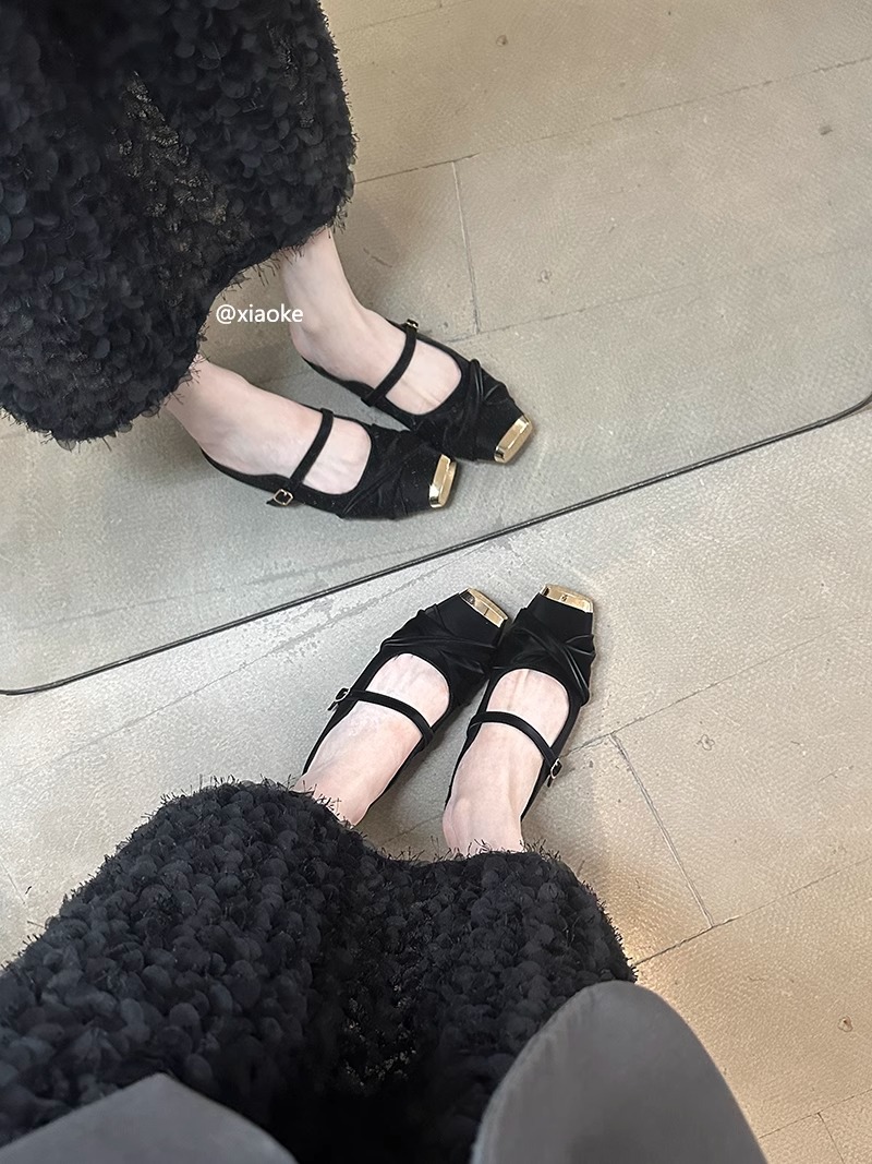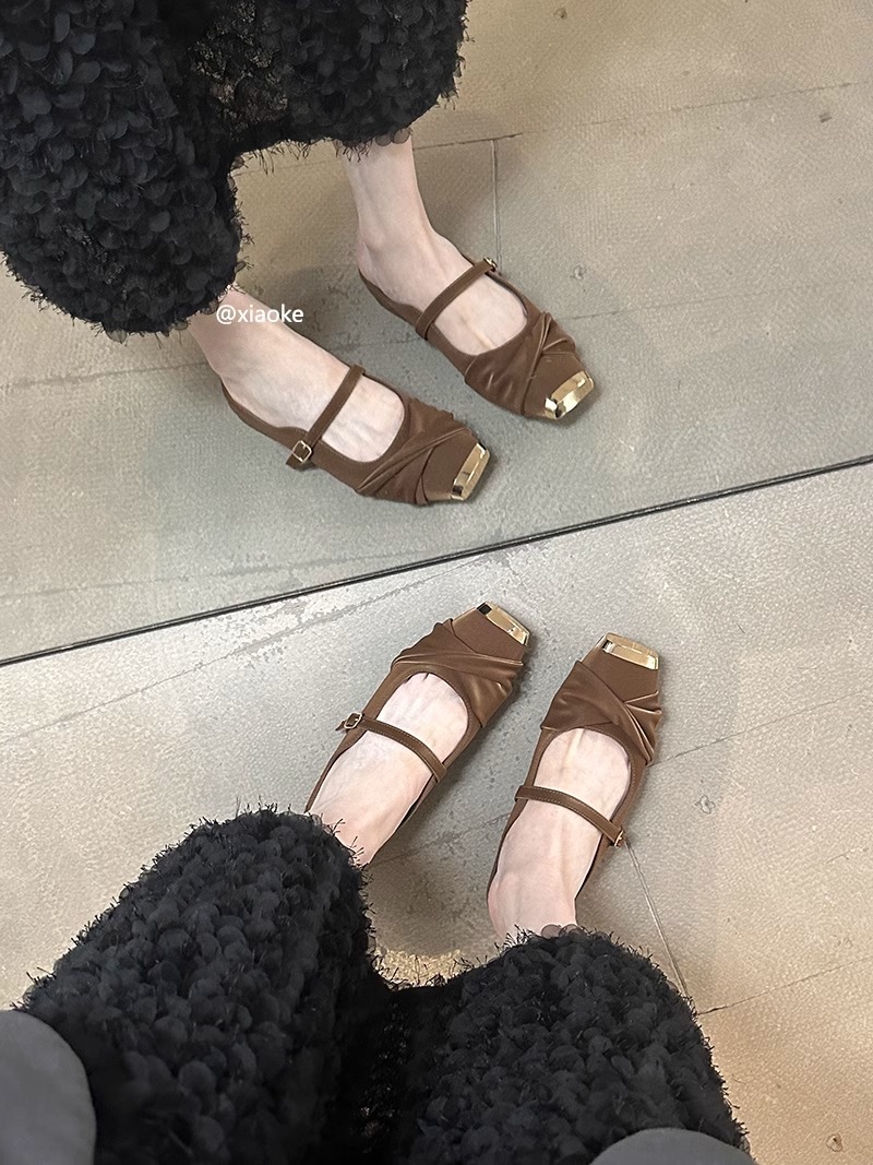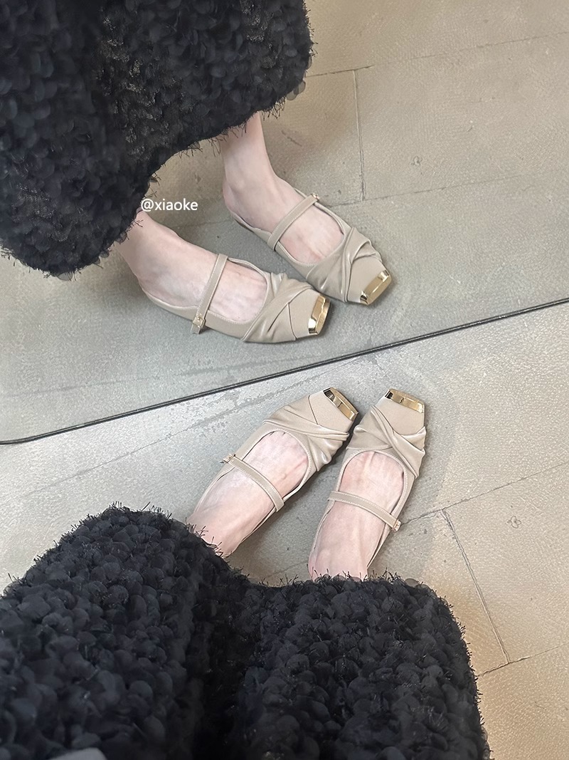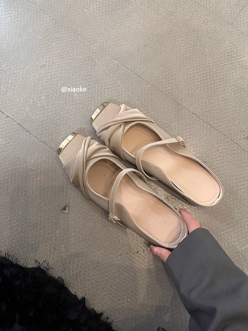Cabeza cuadrada de metal, tacón plano, medio arrastre, modelo de primavera 2025, zapatillas de suela suave de cuero suave, las mujeres usan zapatos Mary Jane