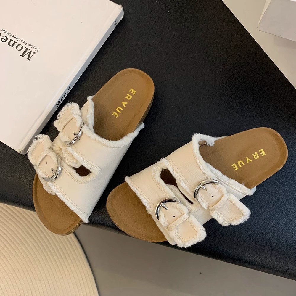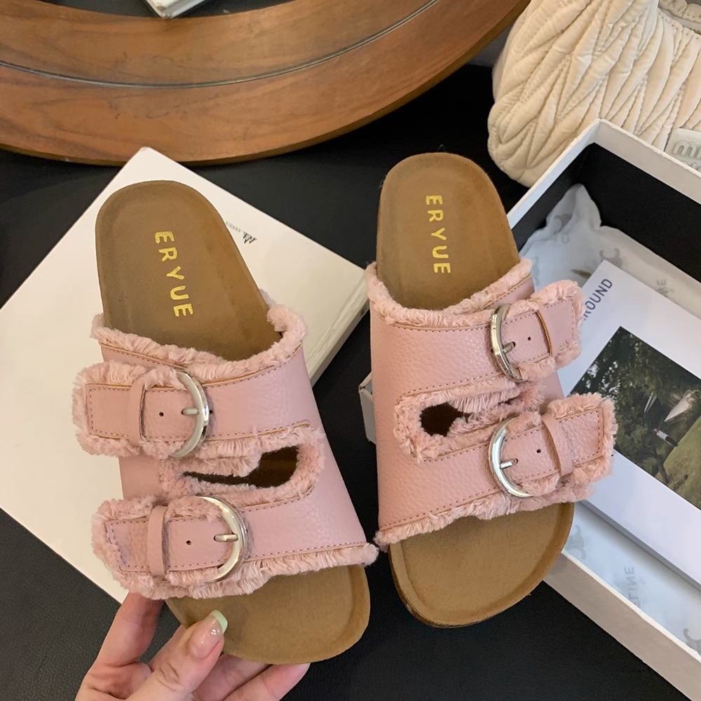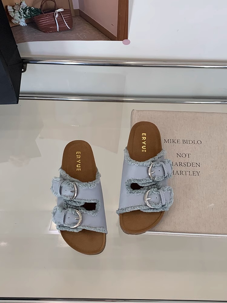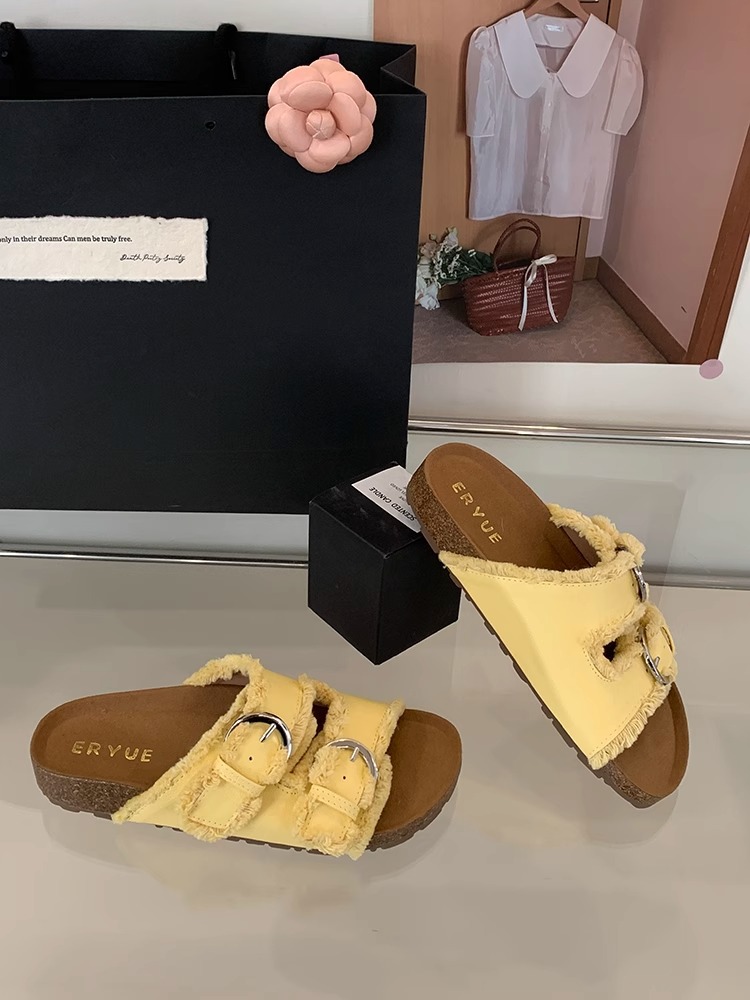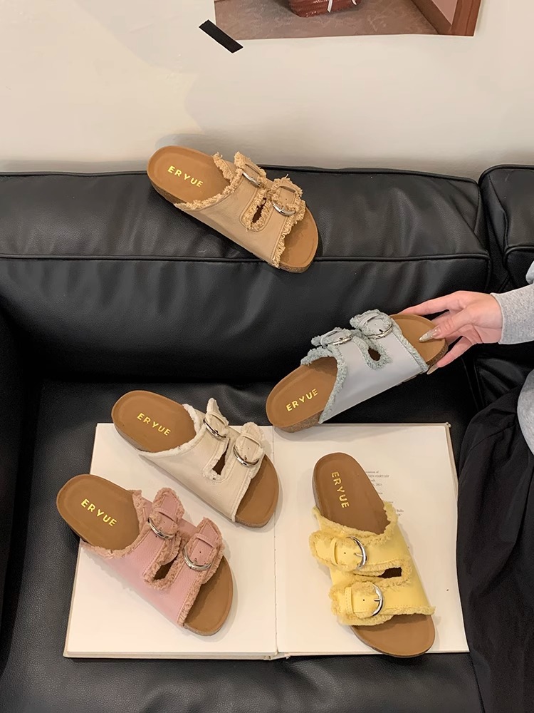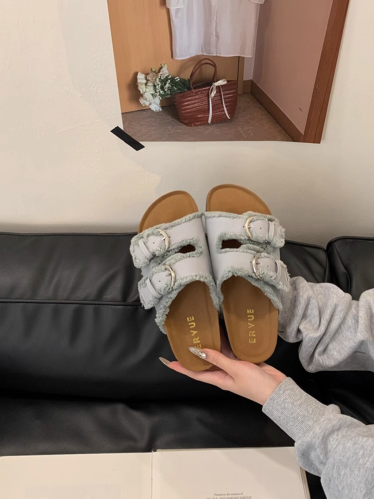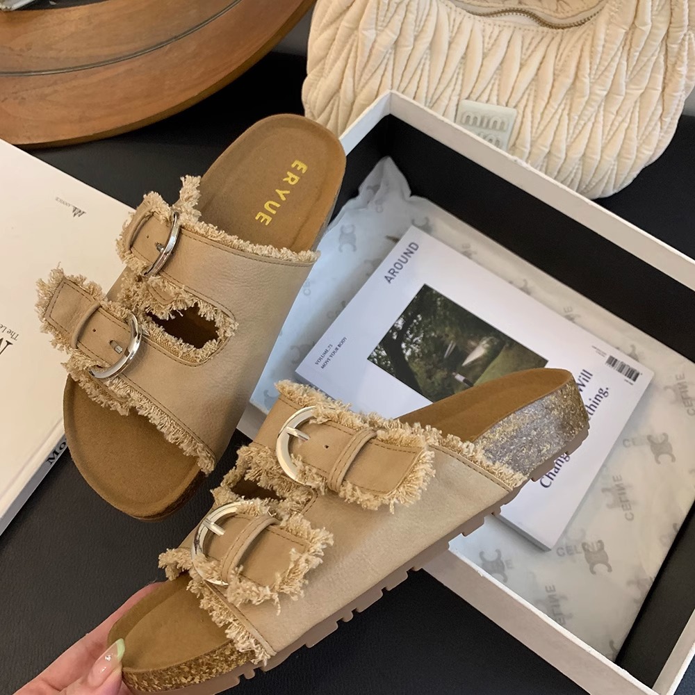 Zapatillas Birkenstock de suela gruesa para mujer en verano 2025 retro hada viento borla fea linda dama plana sandalias Boken marea