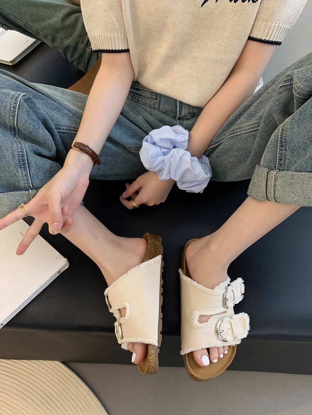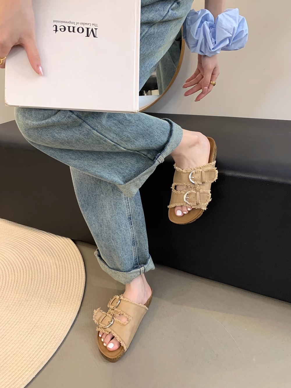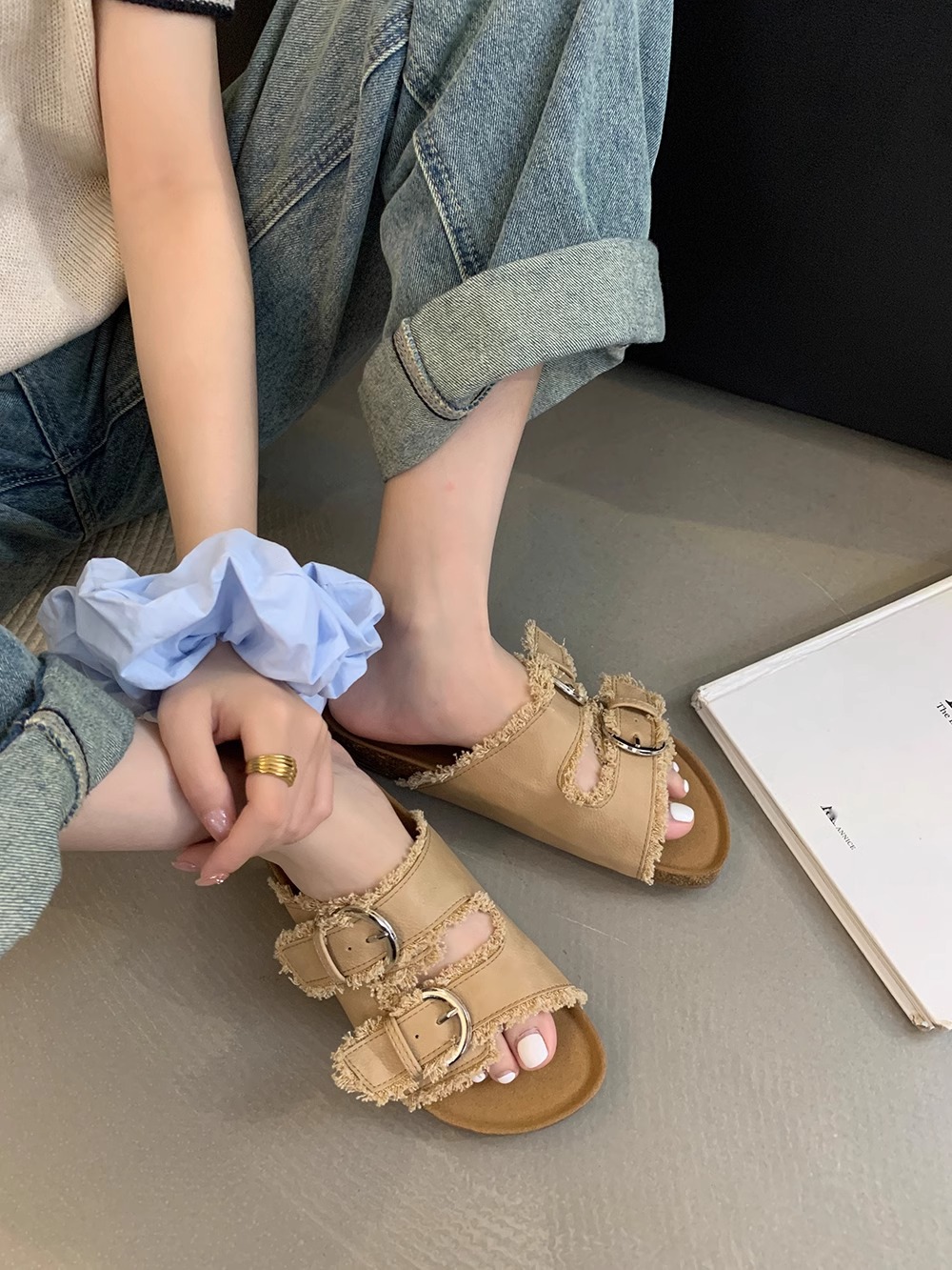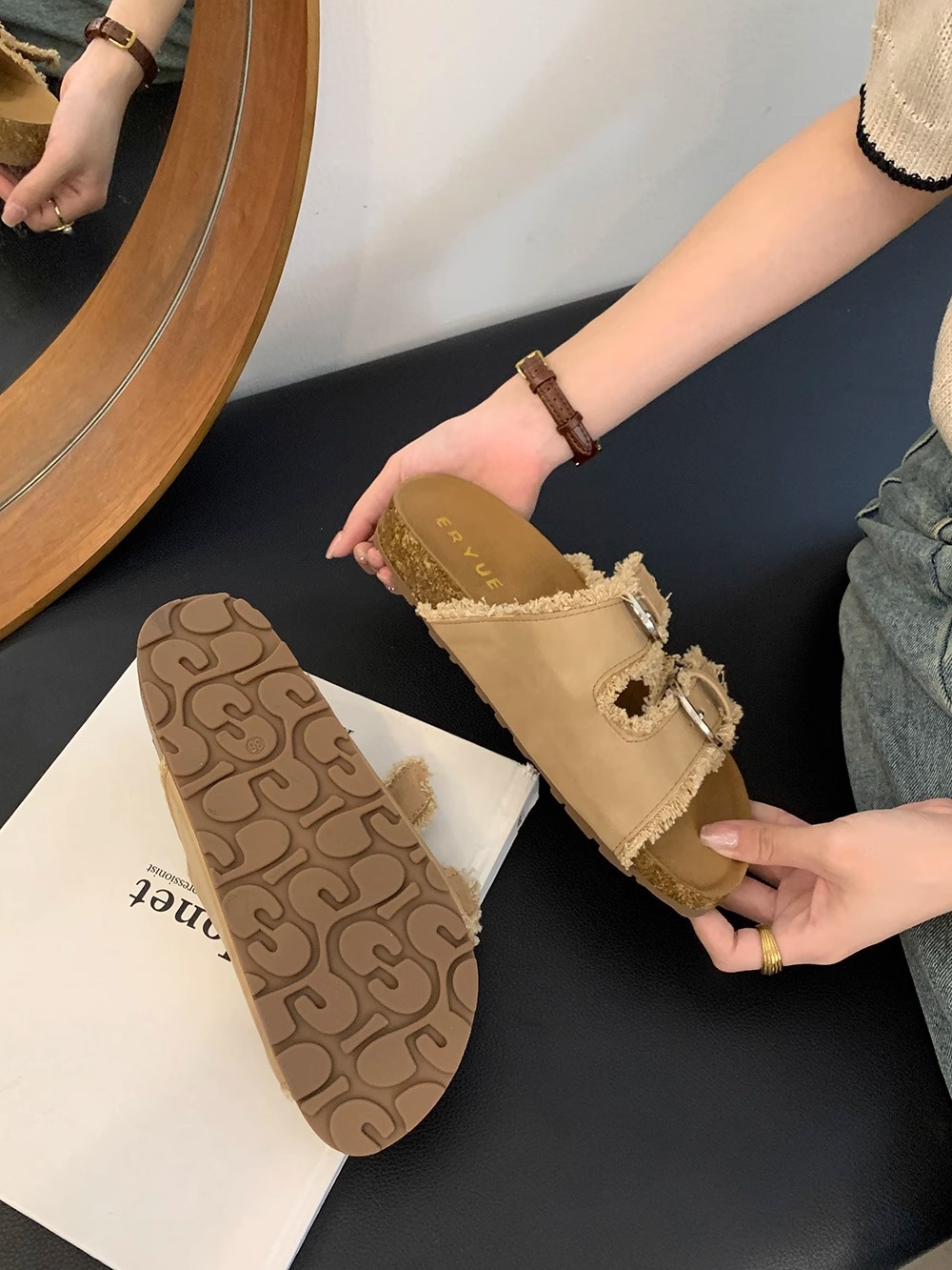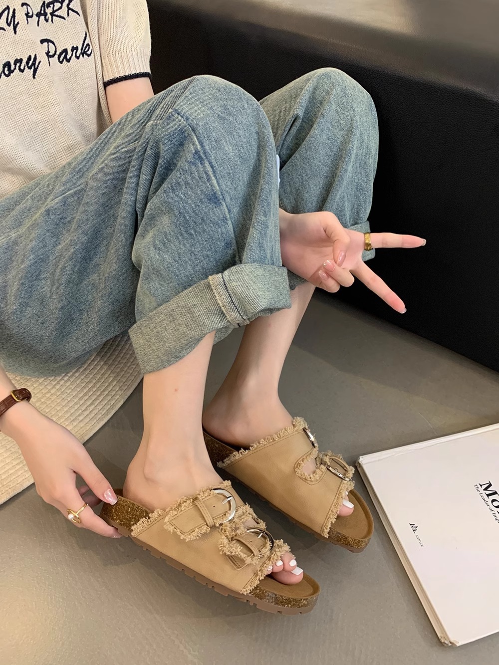 Zapatillas Birkenstock de suela gruesa para mujer en verano 2025 retro hada viento borla fea linda dama plana sandalias Boken marea