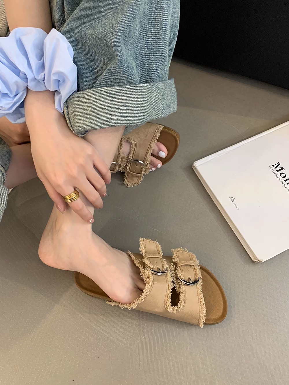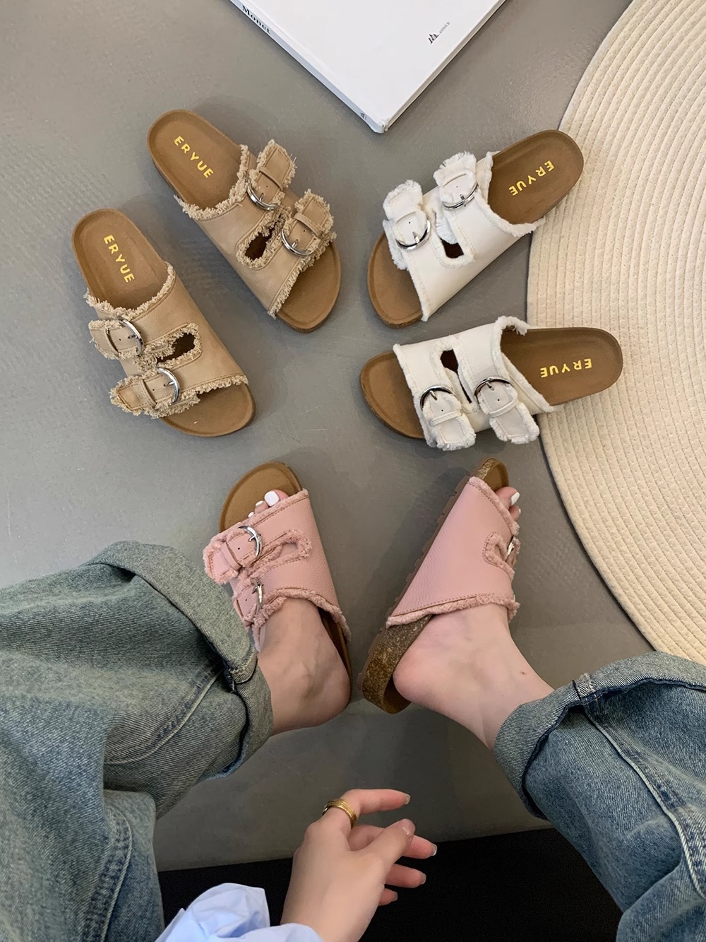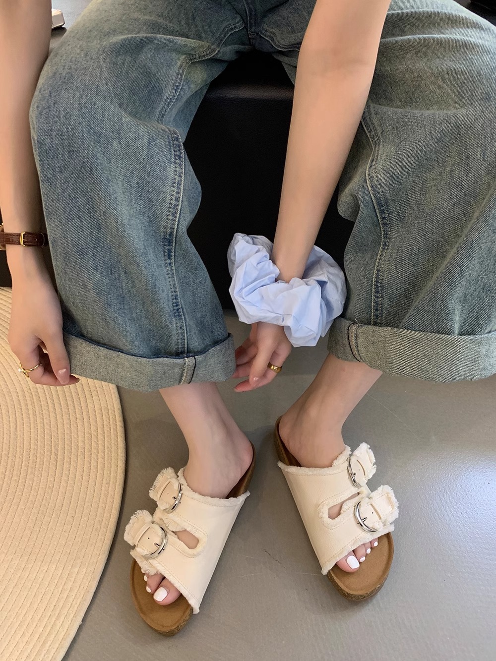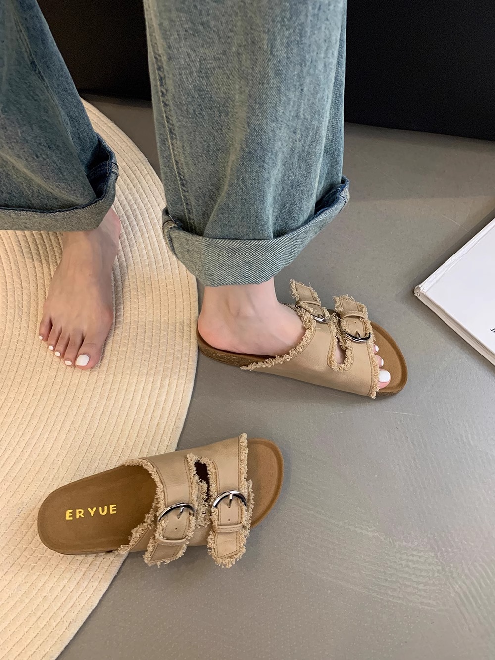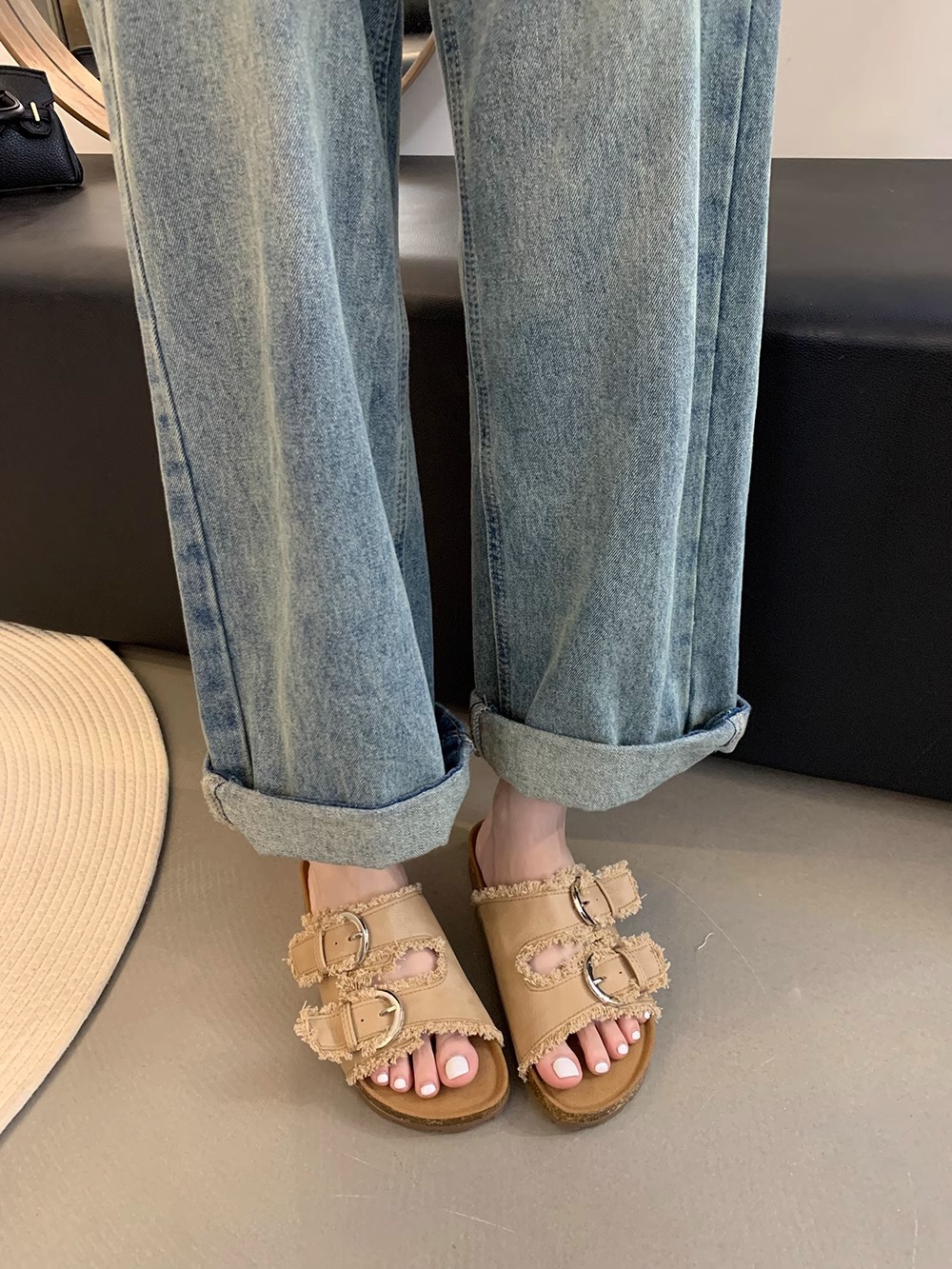 Zapatillas Birkenstock de suela gruesa para mujer en verano 2025 retro hada viento borla fea linda dama plana sandalias Boken marea