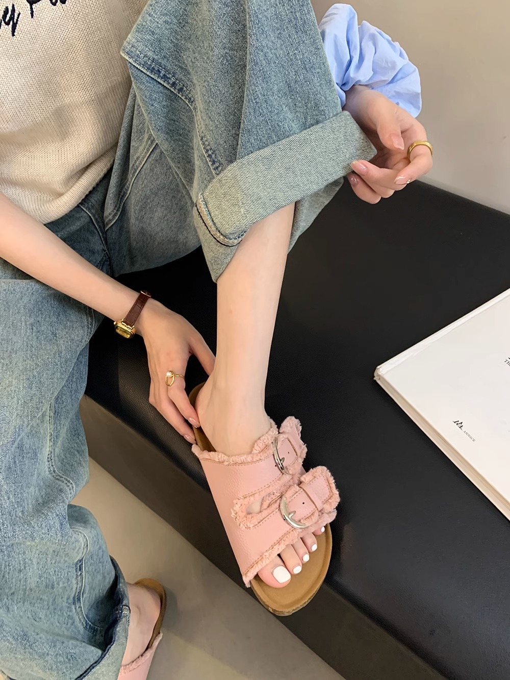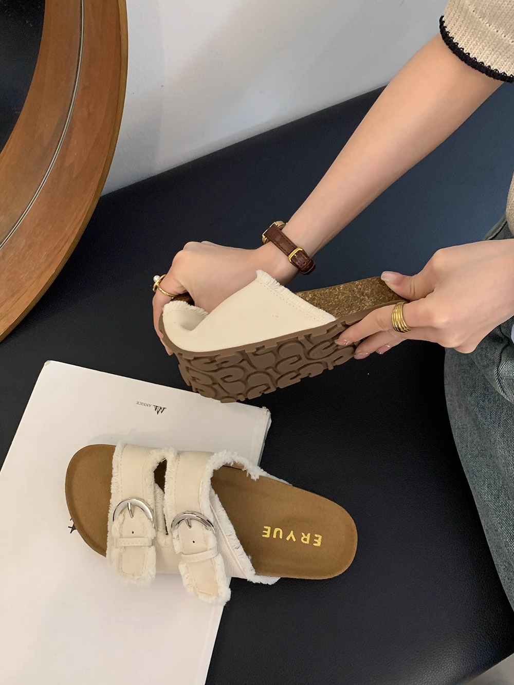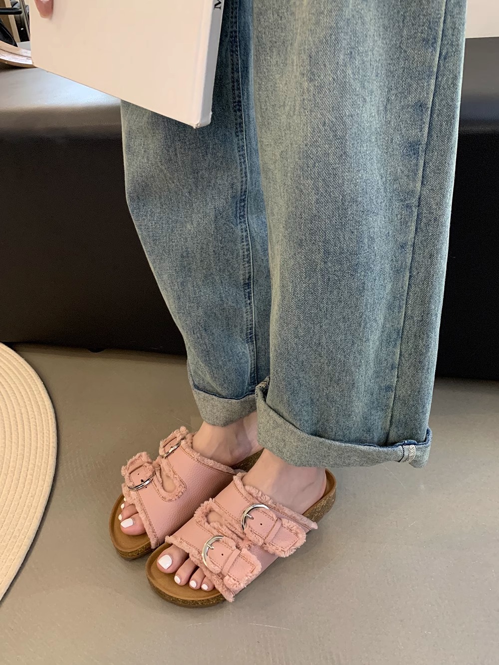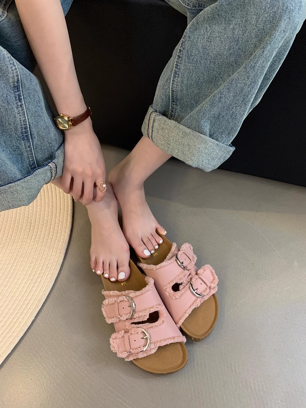 Zapatillas Birkenstock de suela gruesa para mujer en verano 2025 retro hada viento borla fea linda dama plana sandalias Boken marea
