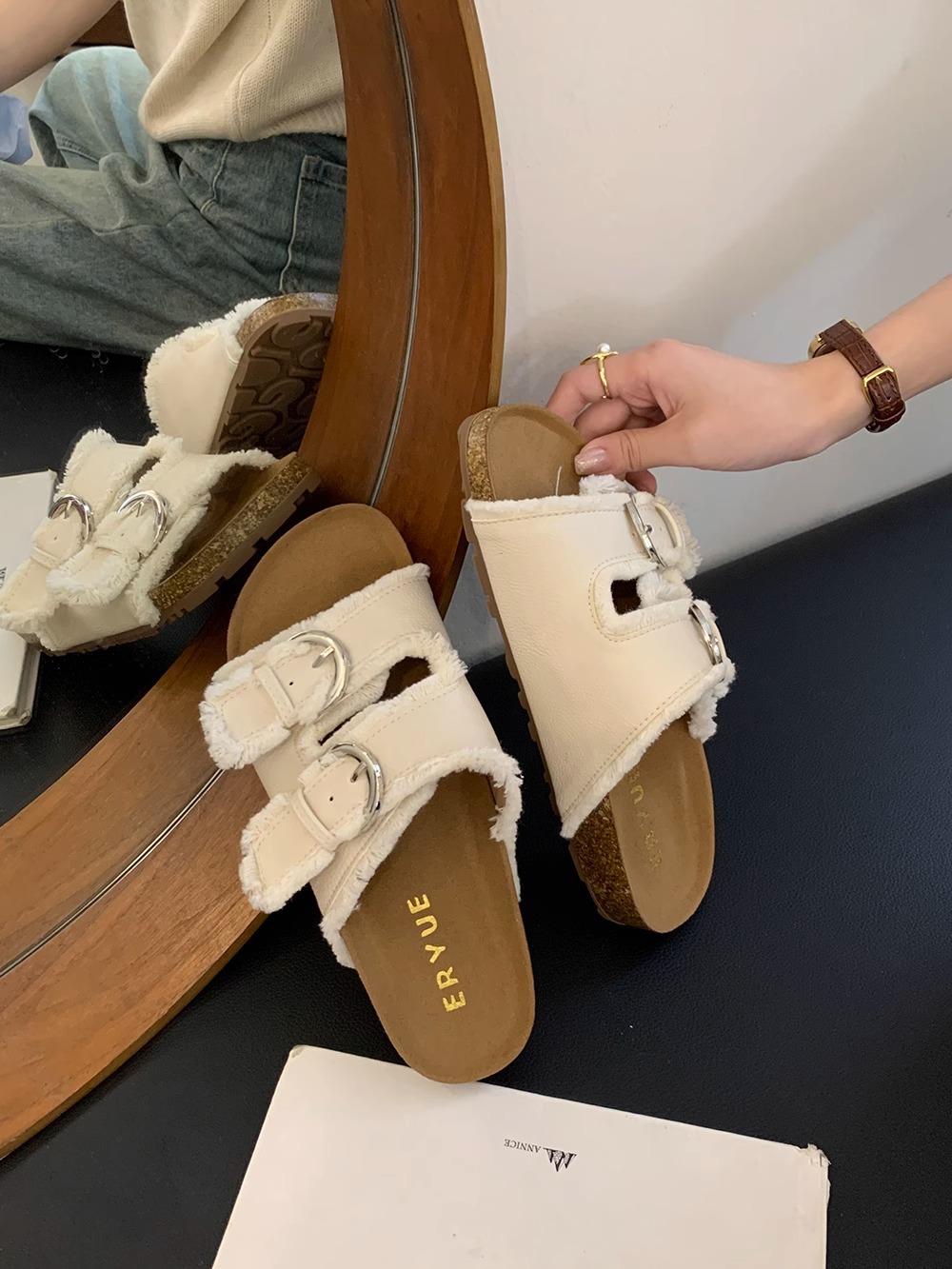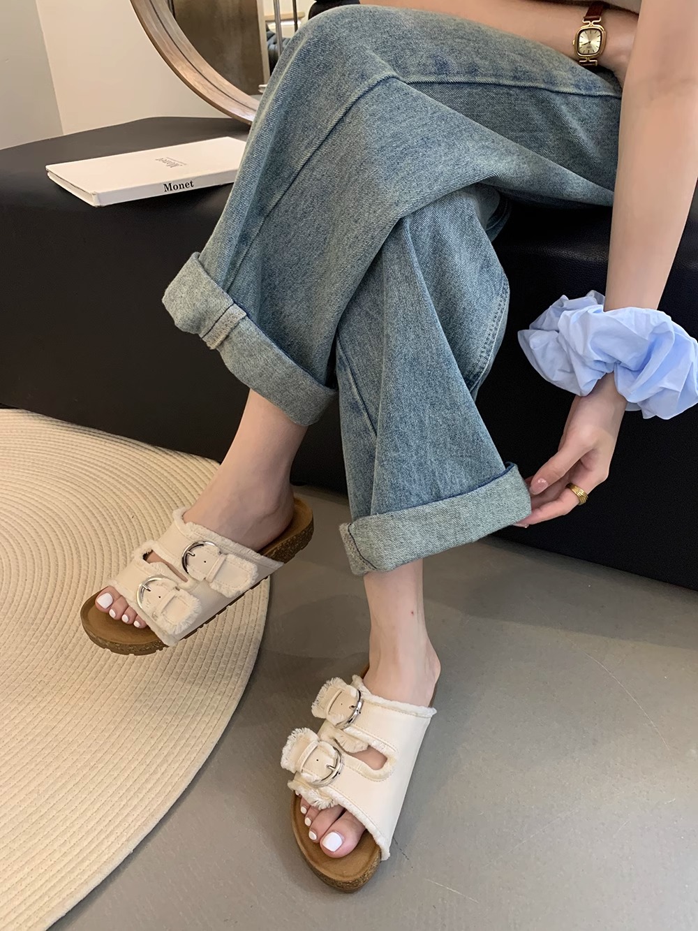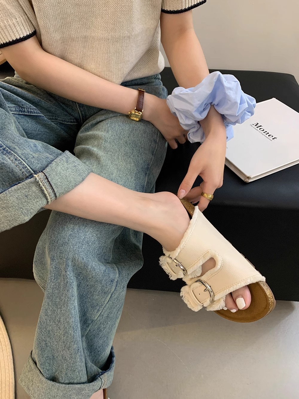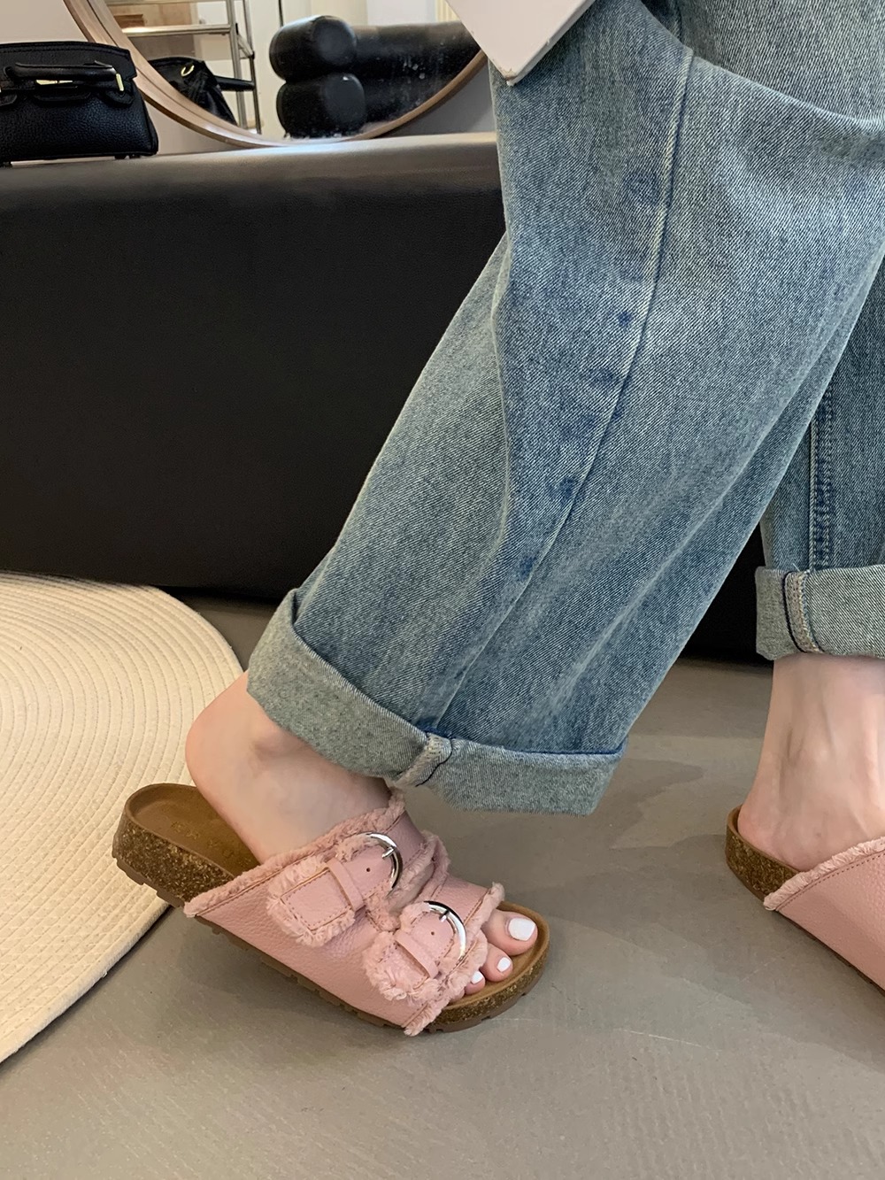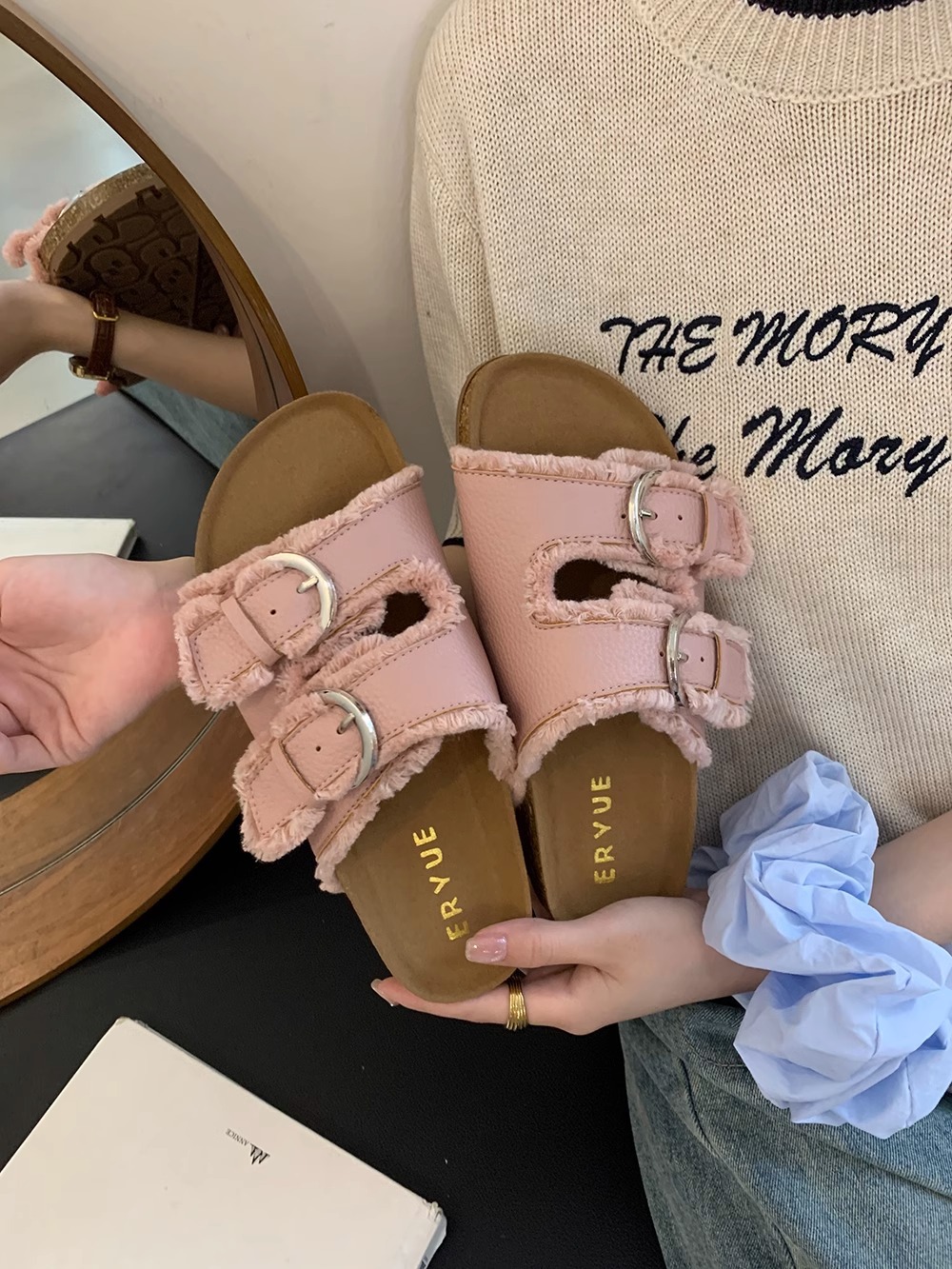 Zapatillas Birkenstock de suela gruesa para mujer en verano 2025 retro hada viento borla fea linda dama plana sandalias Boken marea