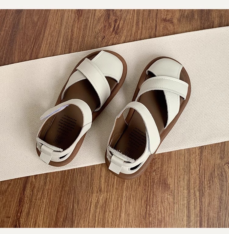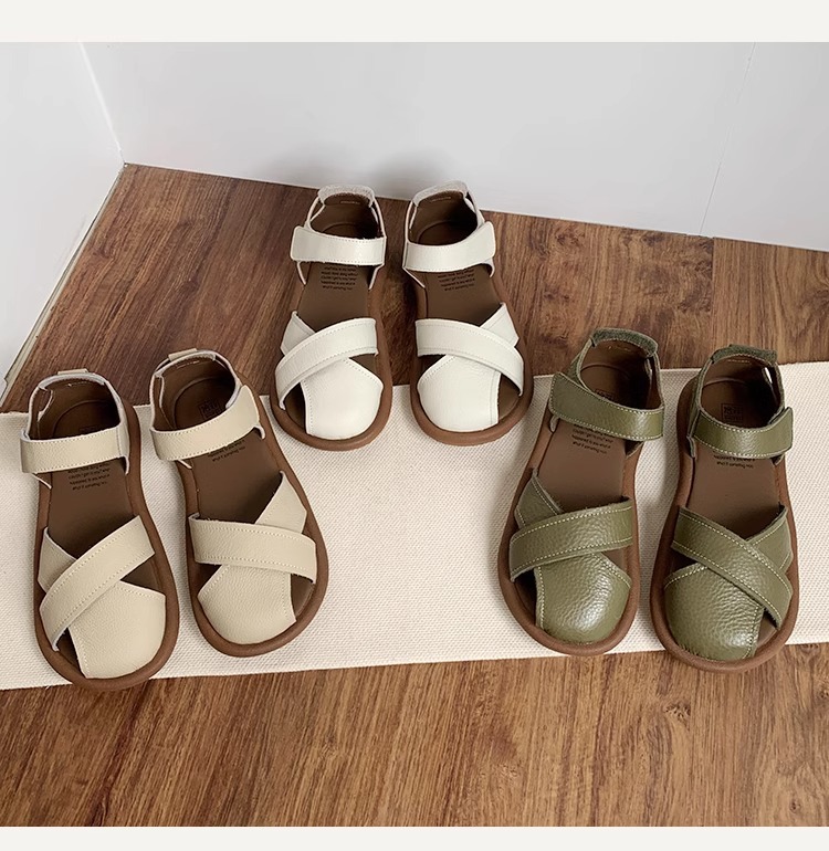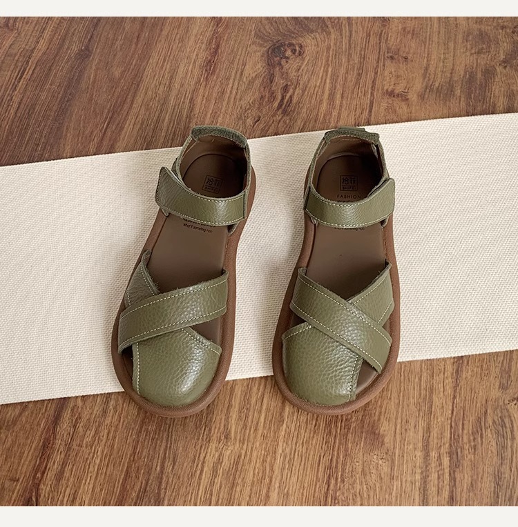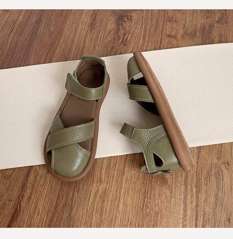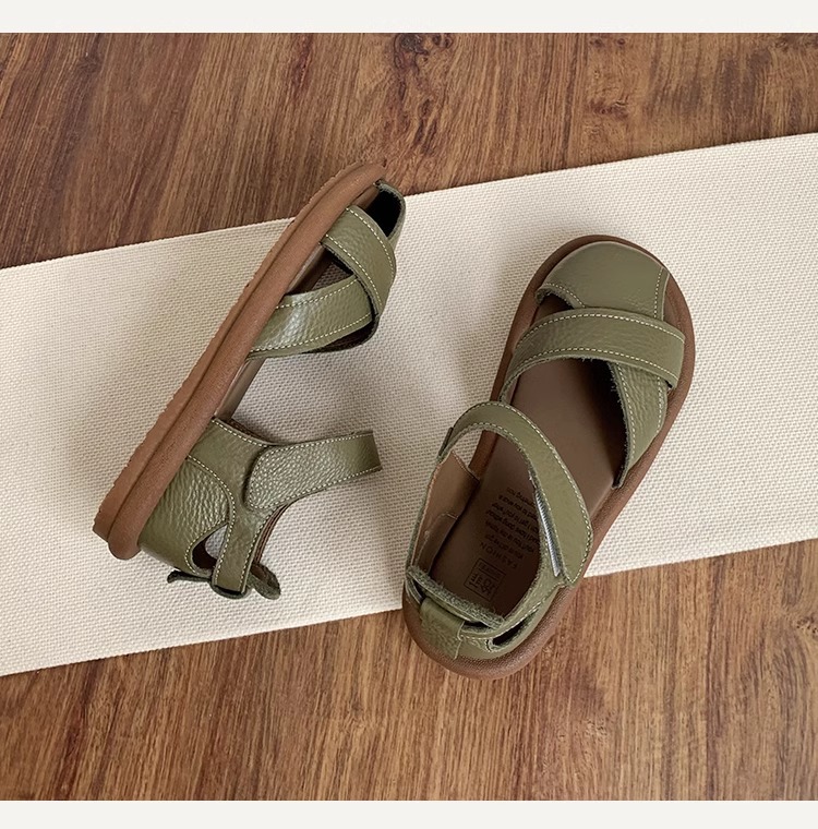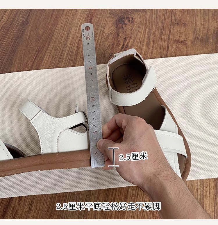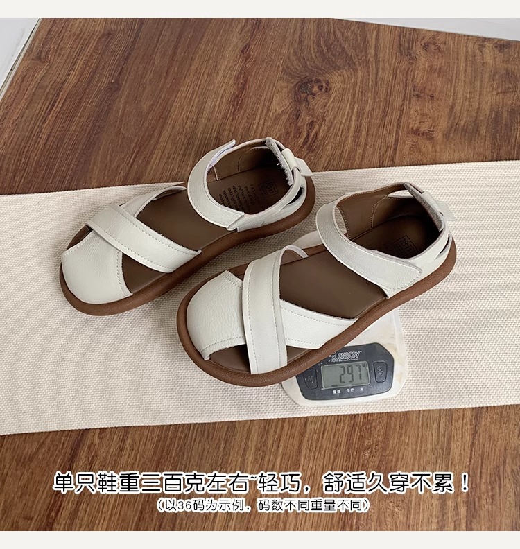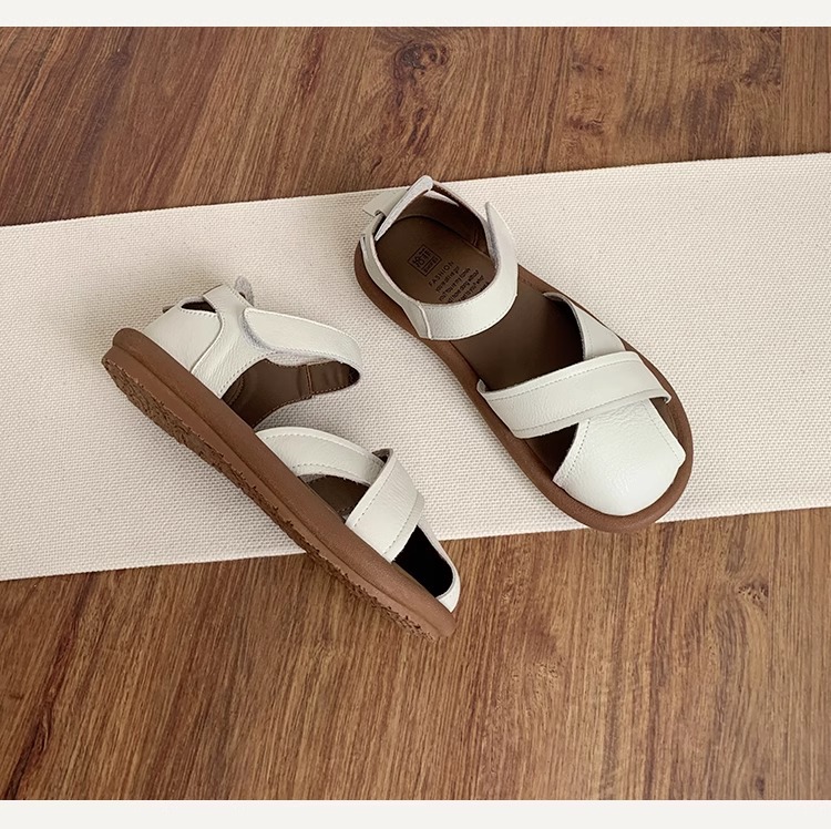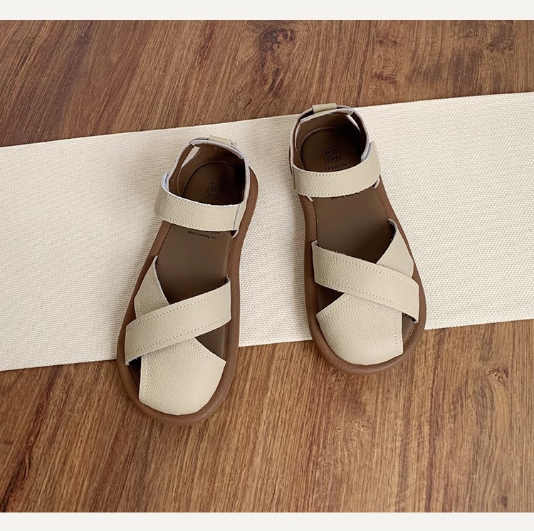 Sandalias planas de cuero para mujer estilo hada 2025 verano nuevo estilo ropa exterior zapatos romanos planos zapatos casuales de playa de suela blanda