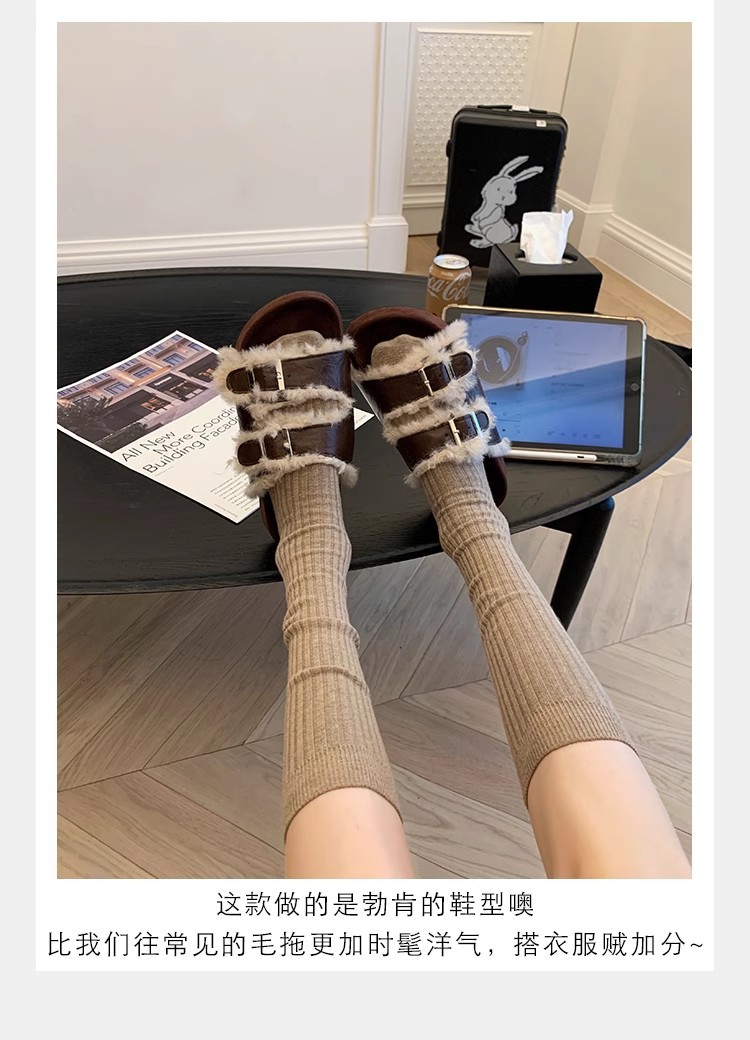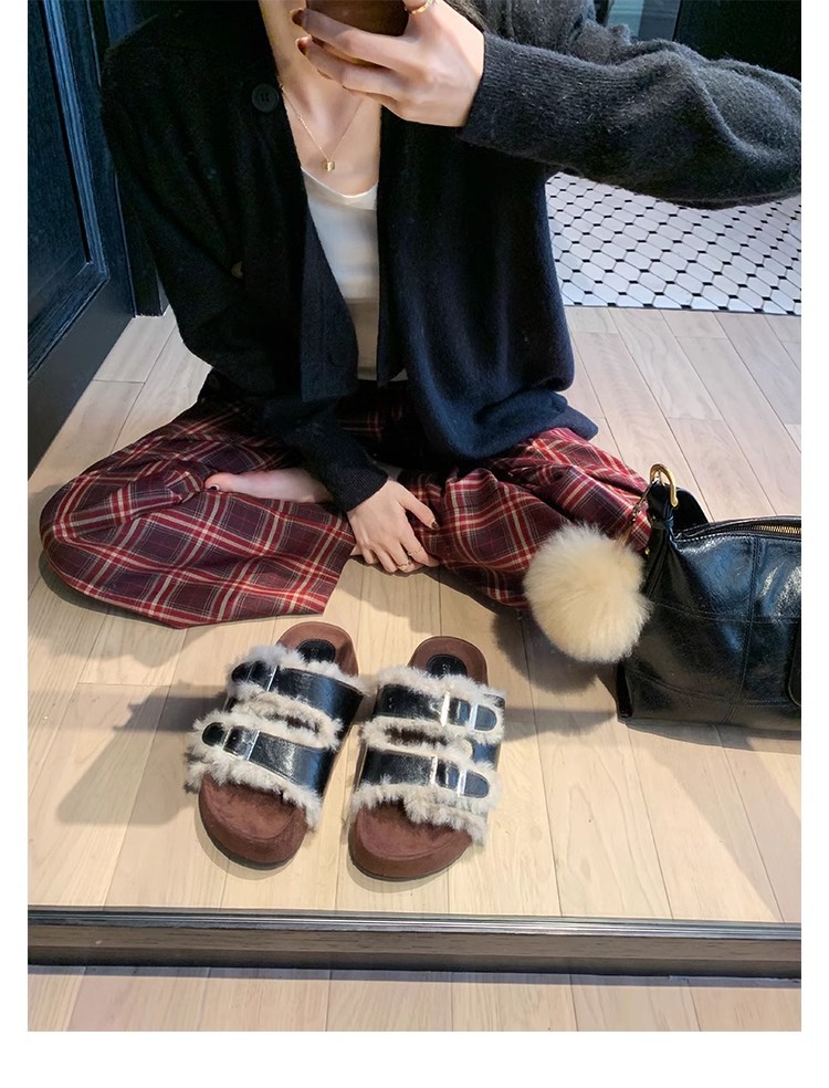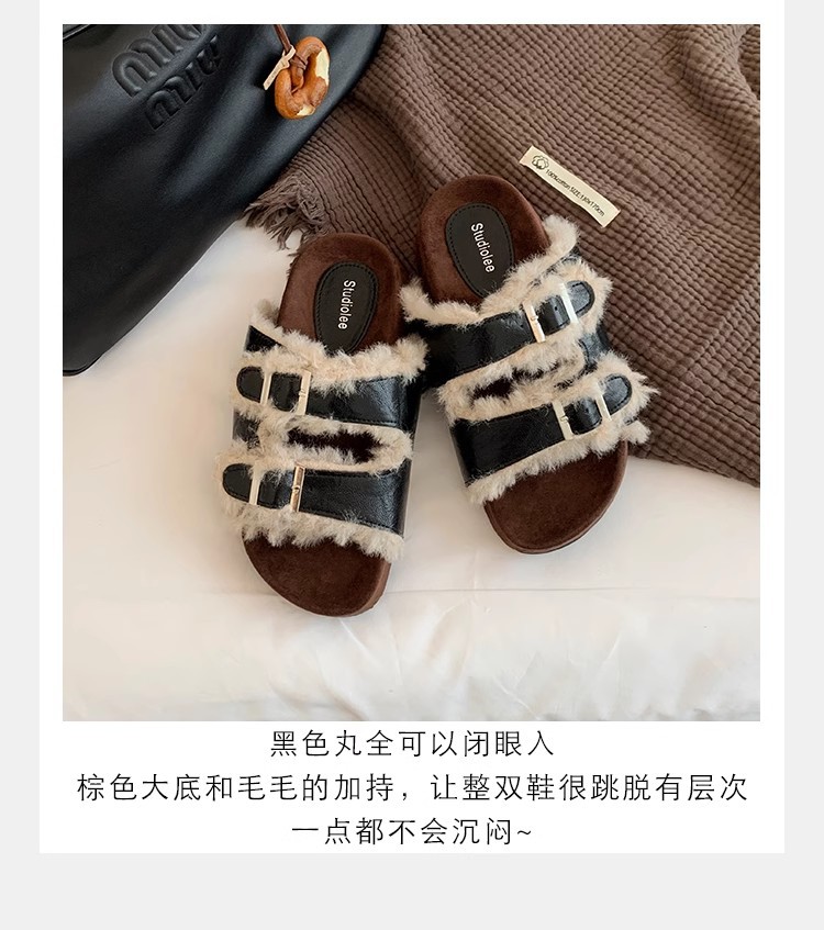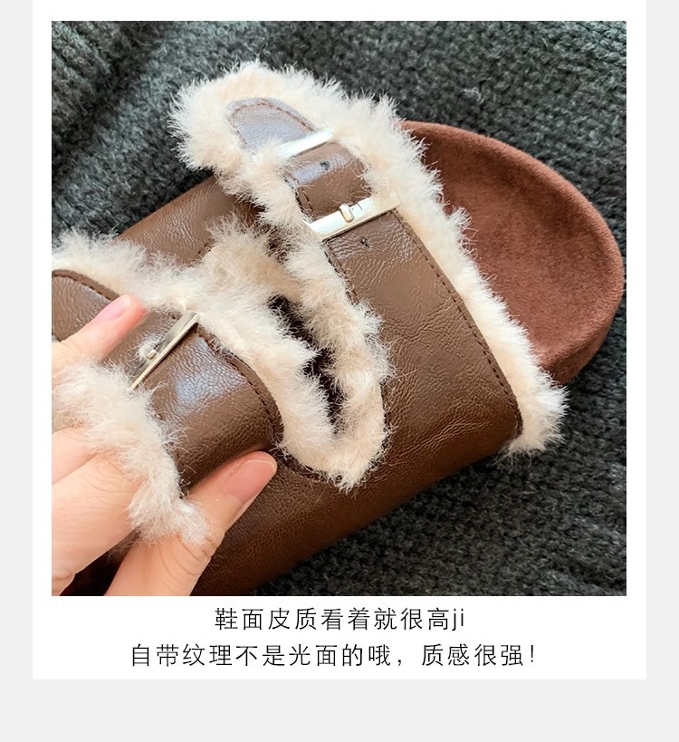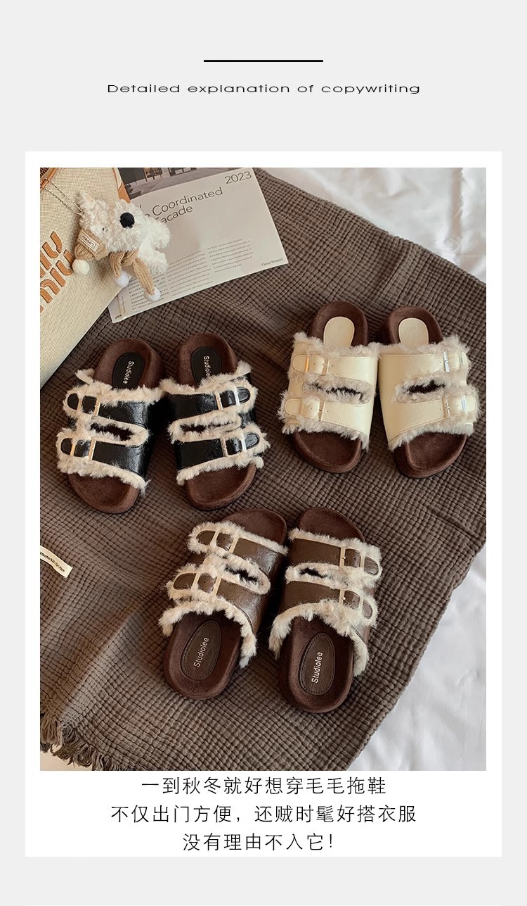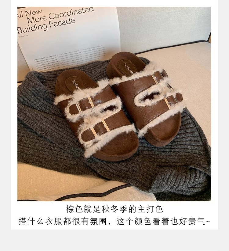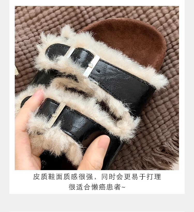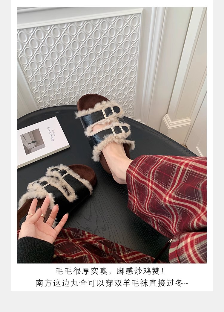 Madre de uva ~ doble botón con una parte inferior gruesa perezosa de dedos de pelo abiertos zapatillas de invierno para mujeres