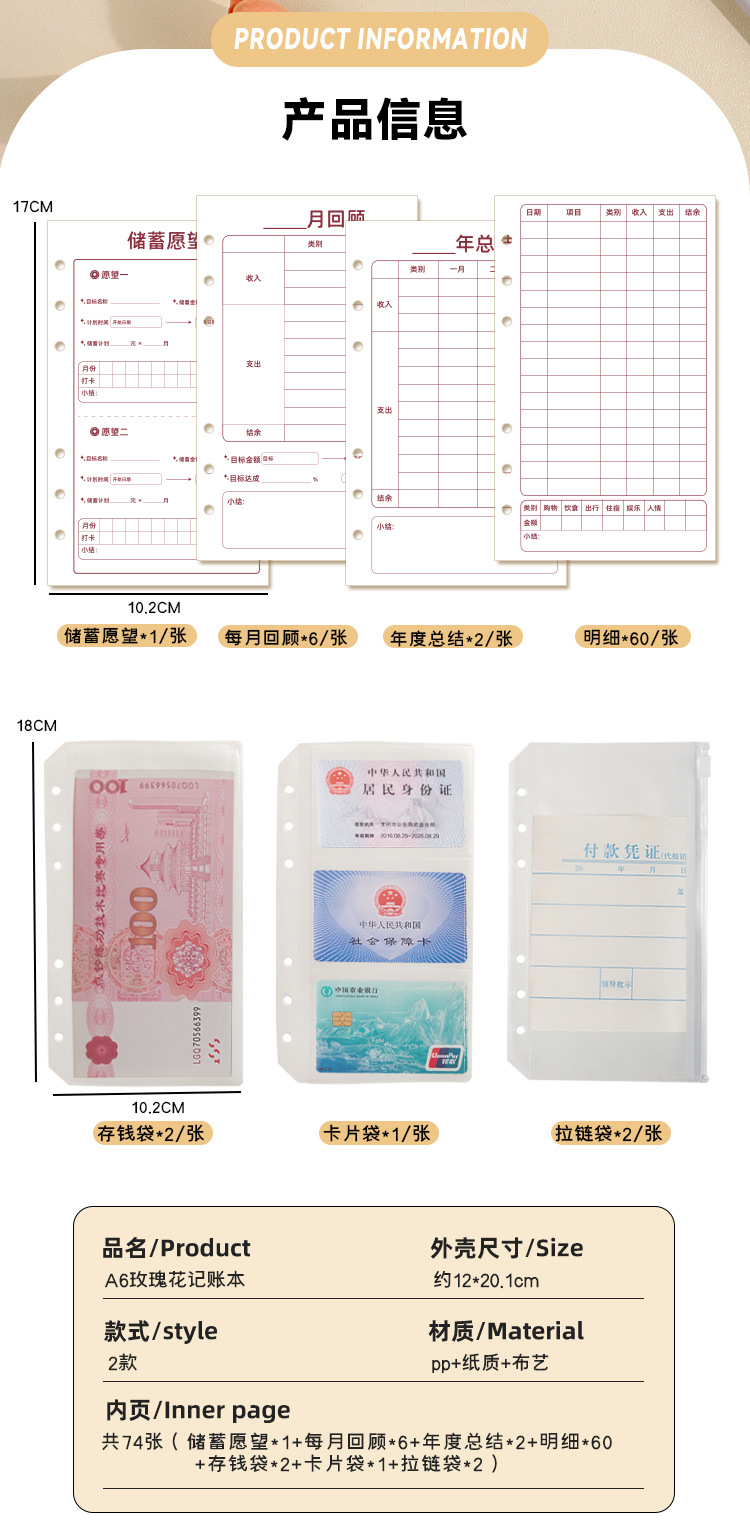 | Colores de la cubierta | Rosa amarilla (incluida la bolsa de dinero de 69 páginas interiores),Rosa blanca (incluida la bolsa de dinero de 69 páginas interiores),69 reemplazos de páginas interiores de contabilidad A6 (sin bolsa con cremallera),Libro de ahorros de vida verde A6,Libro de Ahorros Blanco A6 Flores de Campo Primavera,Amarillo cálido [Libreta de dinero con flores pequeñas A6],Yuebai [Libreta de efectivo A6 con diseño floral],Libro de Ahorros A6 Crema Galleta Negro,Rosa azul [pequeña fragancia],Polvo de cereza [poca fragancia] |