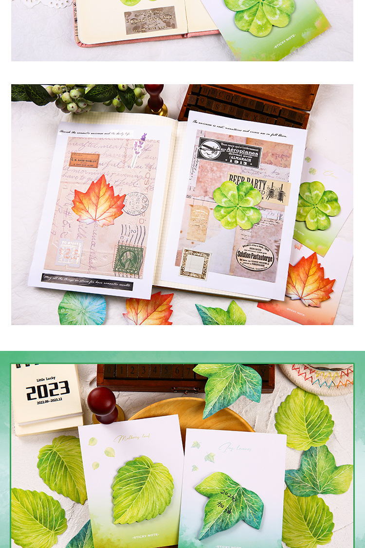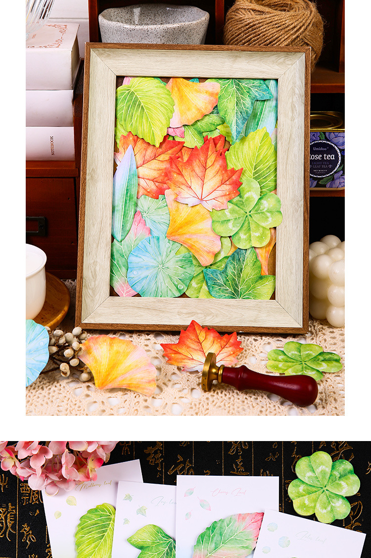 Hojas de arce, ginkgo biloba, hojas de morera, hiedra común, hojas de loto, Trébol de cuatro hojas, hojas de bambú, hojas de cereza
