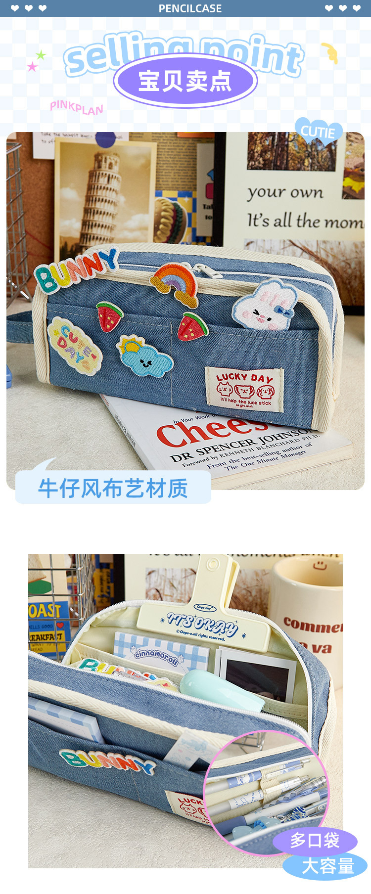 Cute Cat Cowboy Pen Bag [Azul claro],Color,Color,Lindo gato [pegatinas bordadas con estuche de lápices azul claro]