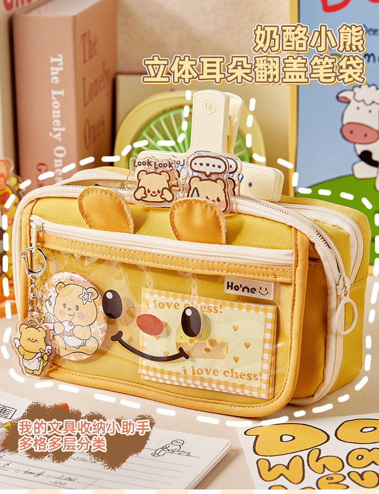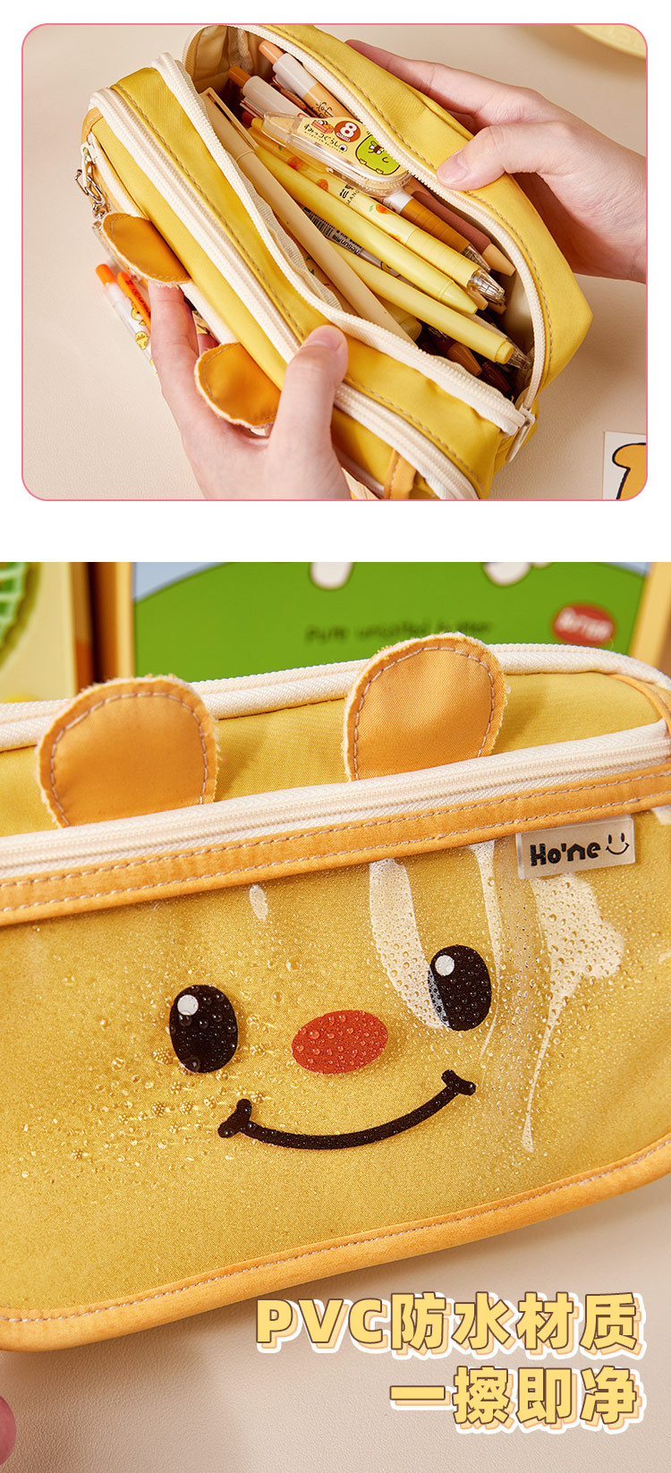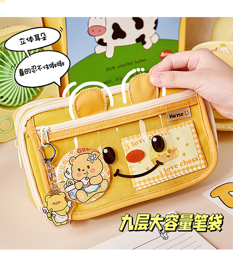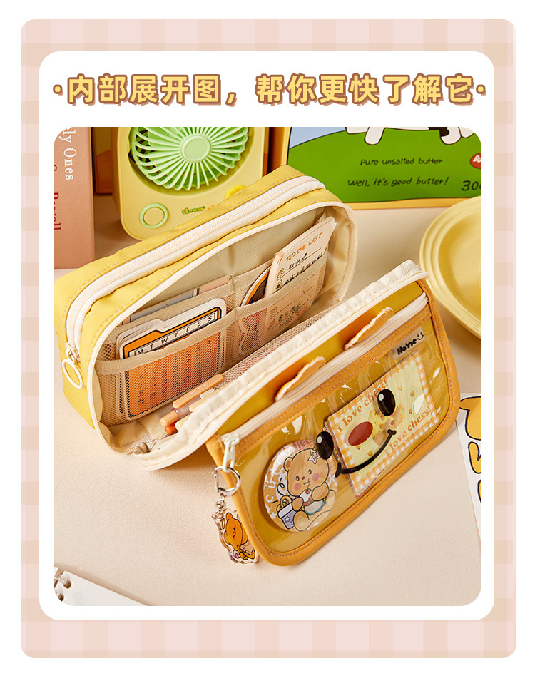Gran capacidad mantequilla oso bolsas de lápiz caja de papelería para estudiantes de primaria niñas lindas caja de lápiz nueva bolsa de papelería multicapa transparente