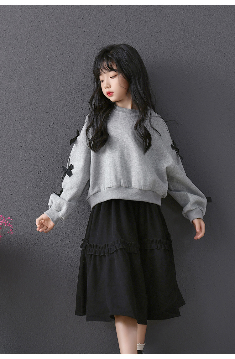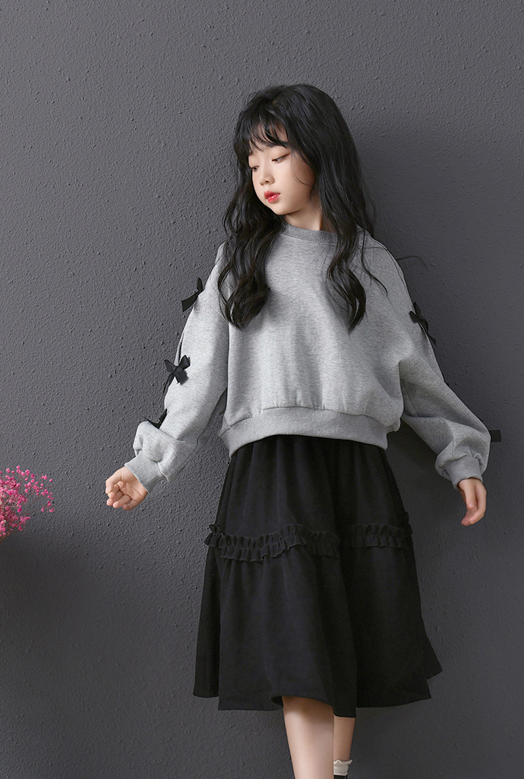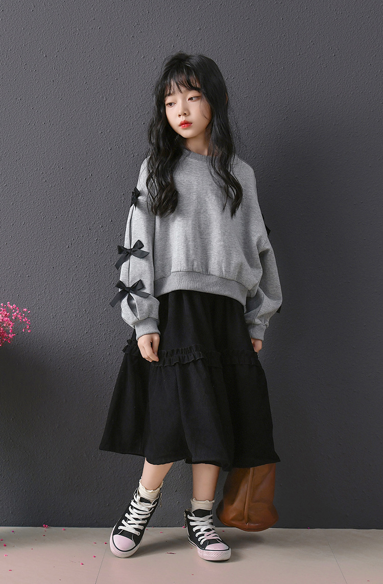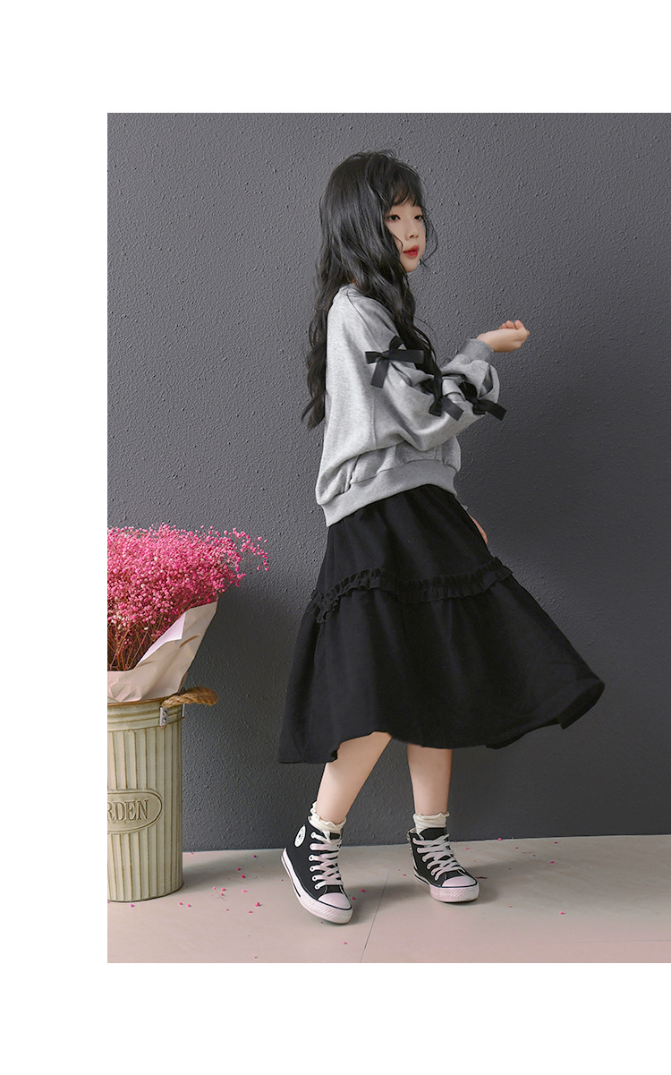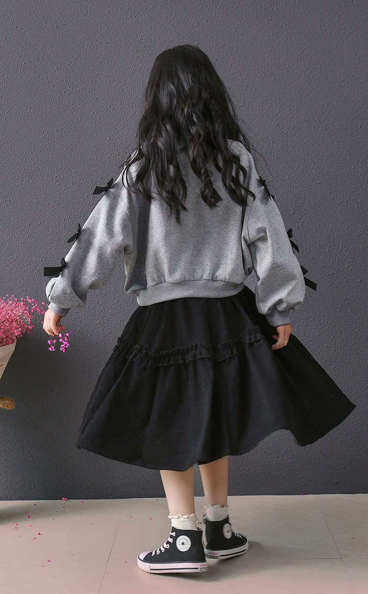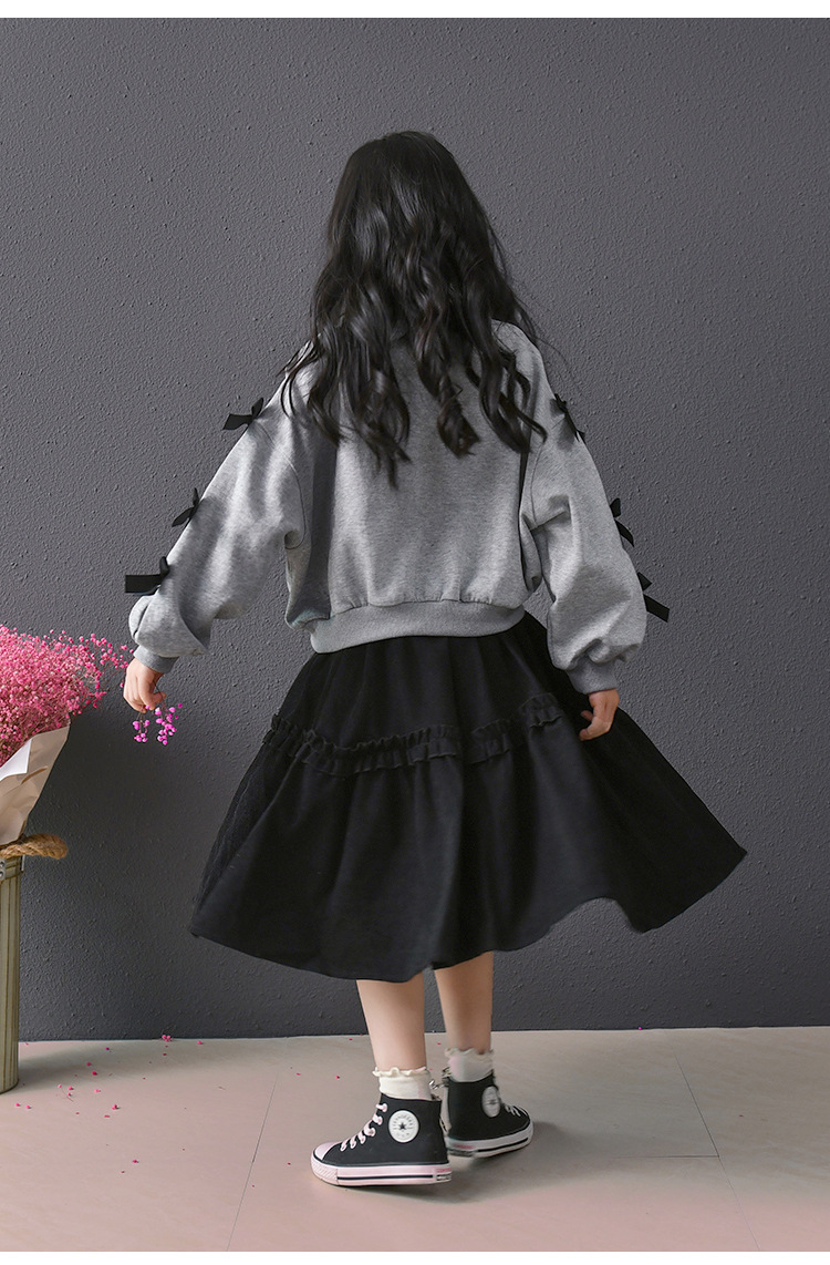 | Colores | Falda de pana negra,Sudadera gris con lazo |