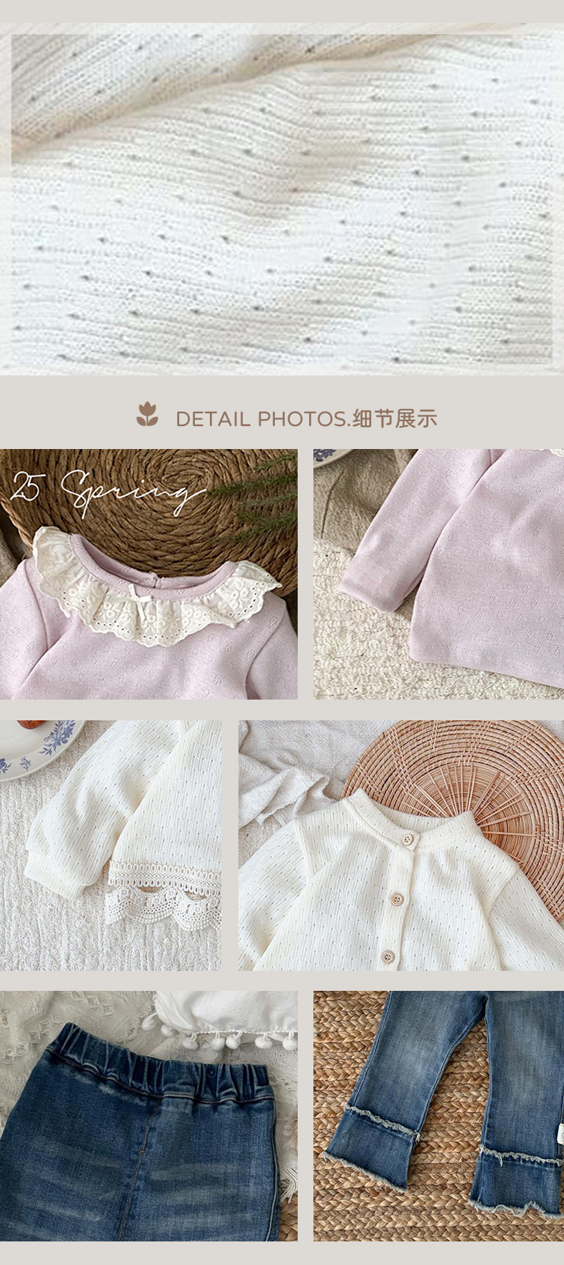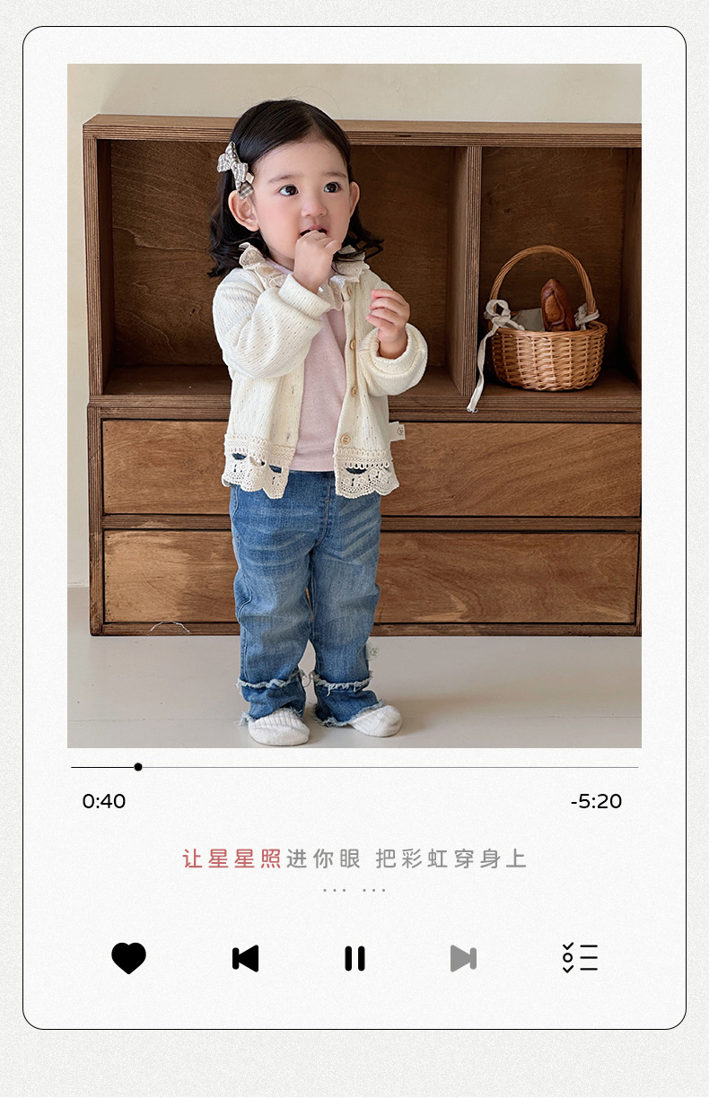 | Colores | Beige [cárdigan],Rosa [cárdigan],Púrpura [camisa de fondo],Blanco [camisa de fondo],Azul [jeans] |