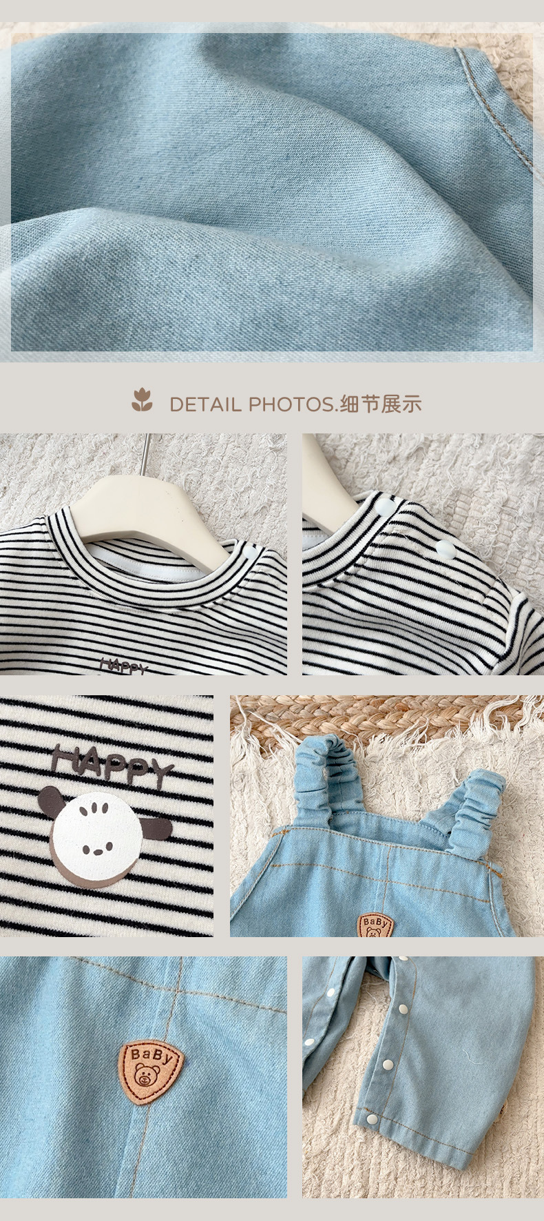 | Colores | Azul [babero],Tela en blanco y negro [camisa de fondo] |