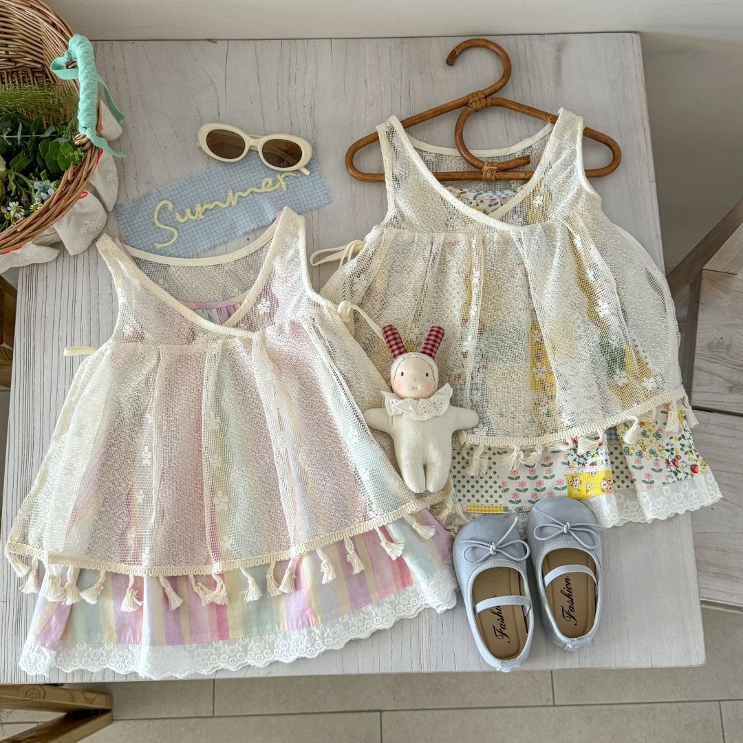 2022 verano estilo coreano niñas sin mangas chaleco vestido bordado vestido de piña vestido ins infantil vestido de malla de una línea