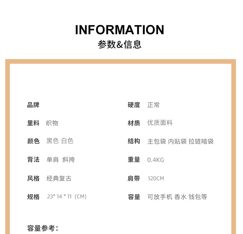 | Estructura interna del paquete | Bolsa de teléfono móvil, bolsa de documentos, bolsa de cremallera entrepiso |