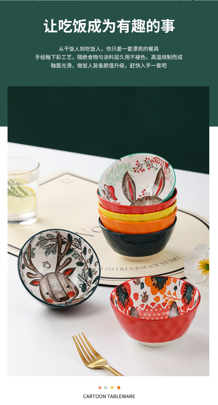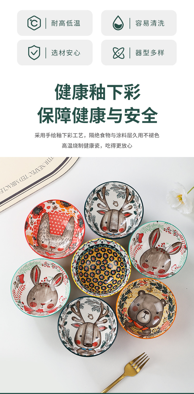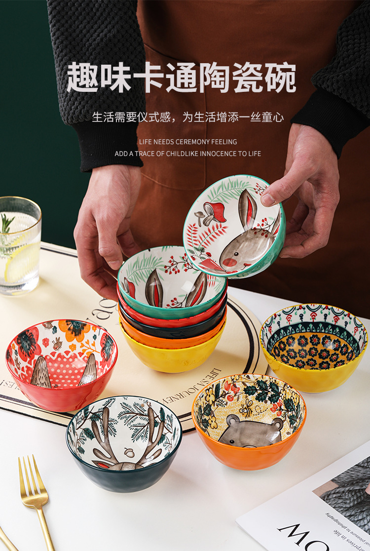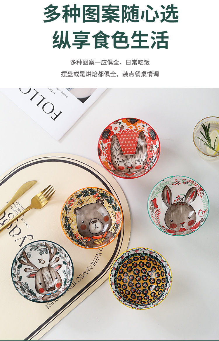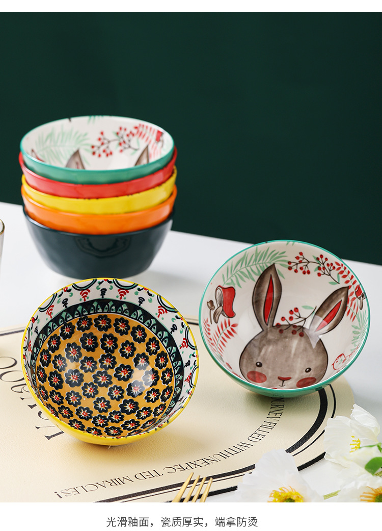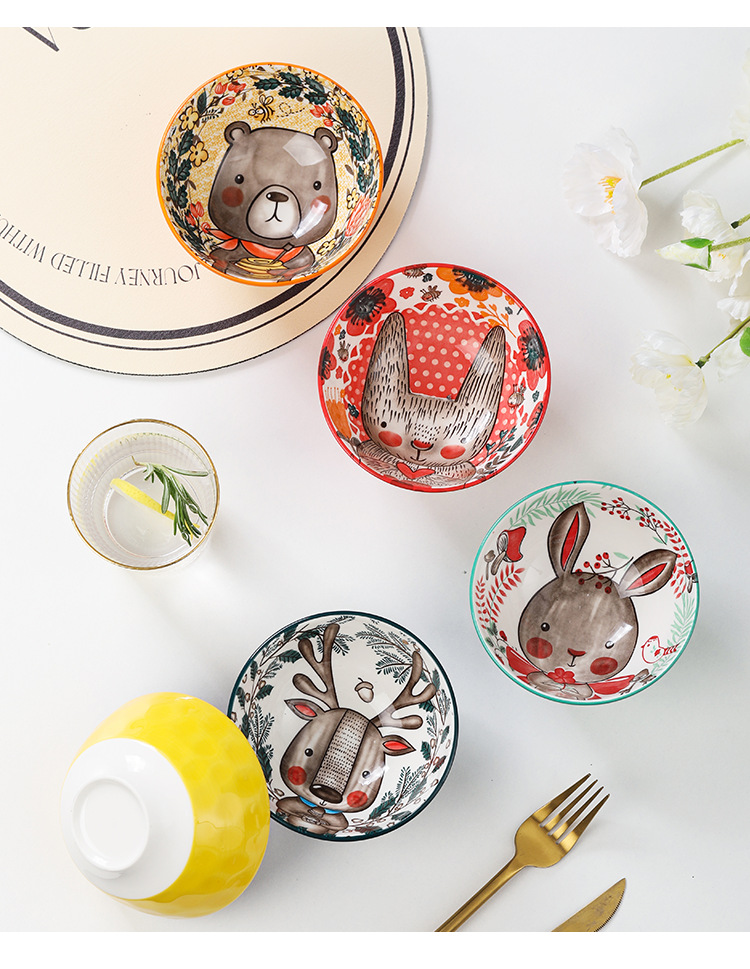 Tazón de Cerámica con Diseño de Animales del Bosque, 4.75 Pulgadas, con Patrón de Piedra, Lindo Tazón para Arroz, Vajilla para el Hogar, Tazón Pequeño, Adorable Conejo de Orejas Largas.