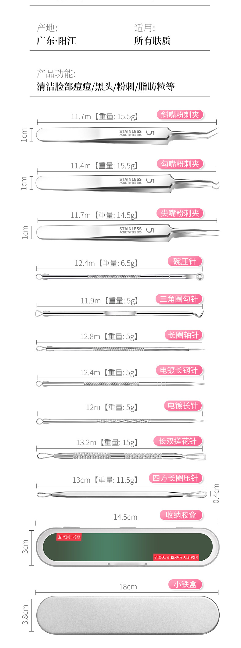 | Clasificación de colores | Juego de agujas para acné de 9 piezas (caja de hierro/aguja de acero),Juego de 8 agujas para acné (caja de hierro/aguja de hierro),Clip triple n.° 5 + 4 pines mejorado + aguja de lima larga (caja de hierro),No. 5 clip triple + gancho/acero/lima doble larga (caja de hierro),Juego de 8 piezas de agujas para acné n.° 5 (caja de plástico grande/aguja de hierro),Juego de 8 piezas de agujas para acné n.° 5 (caja de hierro/aguja de hierro),Gancho de crochet + aguja de acero + lima doble larga (caja de hierro),Clip recto n.° 5 + aguja de acero/gancho de crochet/aguja de prensa corta de doble bucle (caja de hierro/aguja de acero),Abrazadera triple n.° 5 + 4 agujas mejoradas (agujas de acero) + aguja de presión corta de doble giro (caja de hierro),No. 5 clip triple + aguja de acero/gancho de crochet/aguja de prensa corta de doble bucle (caja de hierro),No. 5 clip triple + cuatro agujas mejoradas (aguja de acero/caja de hierro),Clip recto n.° 5 + cuatro agujas mejoradas (aguja de acero/caja de hierro),Clip de gancho No. 5 + cuatro agujas mejoradas (aguja de acero/caja de hierro),Clip oblicuo n.° 5 + cuatro agujas mejoradas (aguja de acero/caja de hierro),Caja de hierro de cuatro agujas (aguja de acero),Juego de 5 piezas de aguja grande/clip para acné (caja de hierro grande),Tres clips y 4 pines (aguja de hierro/caja de plástico grande/inspección completa),Clip de boca recta 4 pines (caja de plástico/aguja de hierro),Clip de boca oblicua 4 agujas (caja de plástico/aguja de hierro),Clip de boca curva 4 agujas (caja de plástico/aguja de hierro),Jingguang No. 5 tres clips (caja de plástico/inspección completa),Tres clips de luz de espejo (caja de plástico/inspección completa),4 agujas normales (caja de plástico/aguja de hierro),Lupa negra de 5x,Lupa negra de 10x,Lupa negra de 15x,50 piezas de algodón con alcohol,100 piezas de algodón con alcohol |