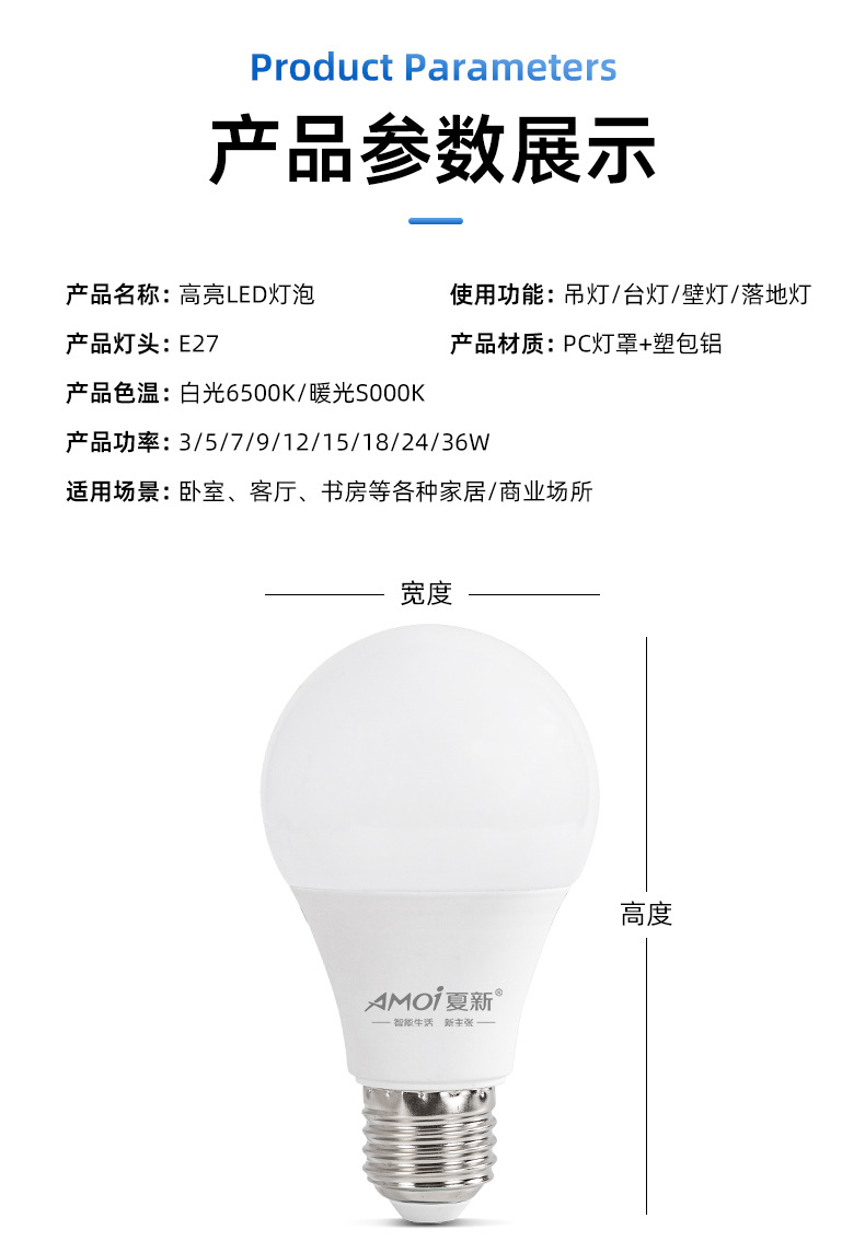 | Poder | Amoi bola de luz blanca 3W,Amoi bola de luz blanca 5W,Amoi bola luz blanca 7W,Amoi bola luz blanca 9W,Amoi bola luz blanca 12W,Amoi bola de luz blanca 15W,Amoi bola burbuja luz blanca 18W,Amoi bola luz blanca 24W,Amoi bola luz blanca 36W |