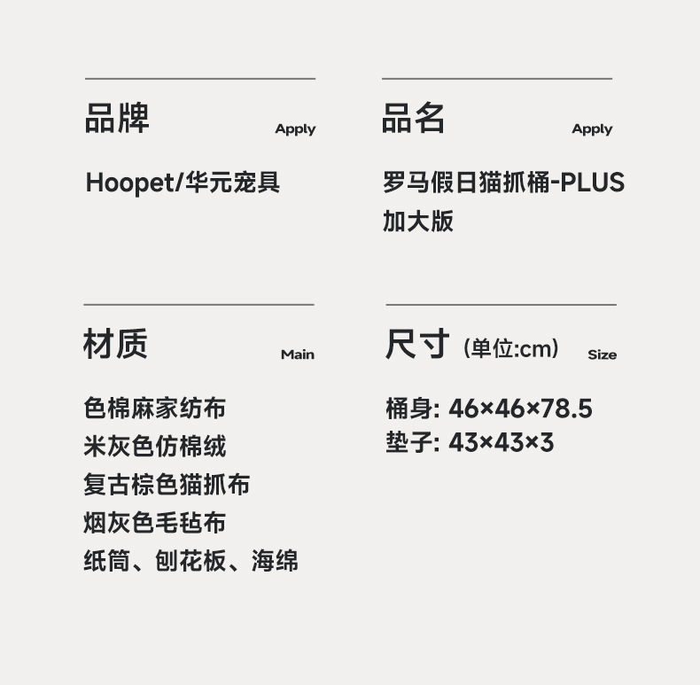 【材质】:桶身:天然剑麻全包裹、贴面板、棉麻家纺布、猫爪布,垫子:棉麻家纺布、海绵
