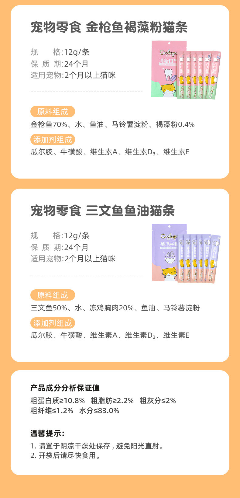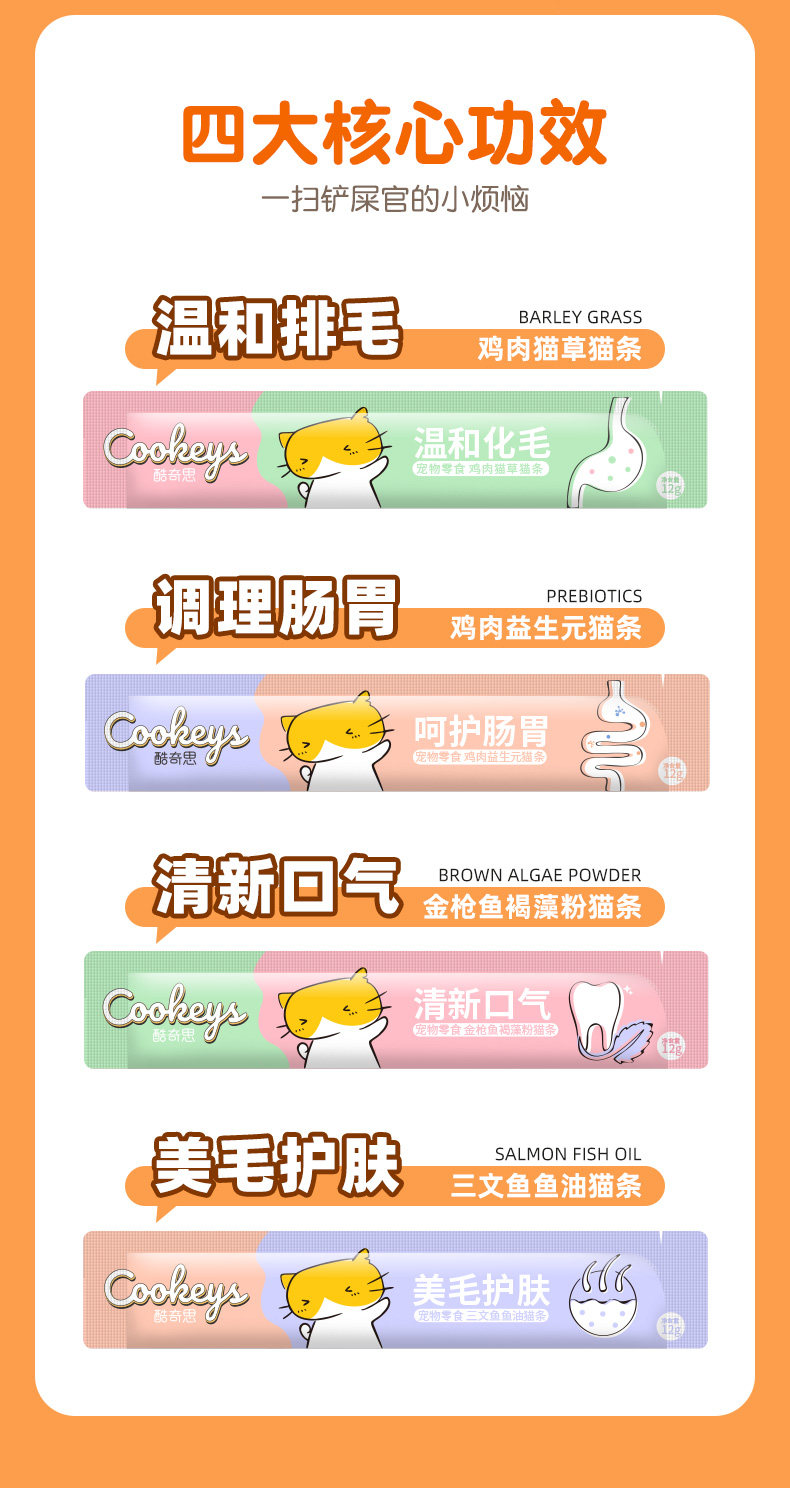 | * | 品名/Trade name | 酷奇思宠物零食(鸡肉猫草/鸡肉益生元/金枪鱼褐藻粉/三文鱼鱼油)猫条 12g*6 |