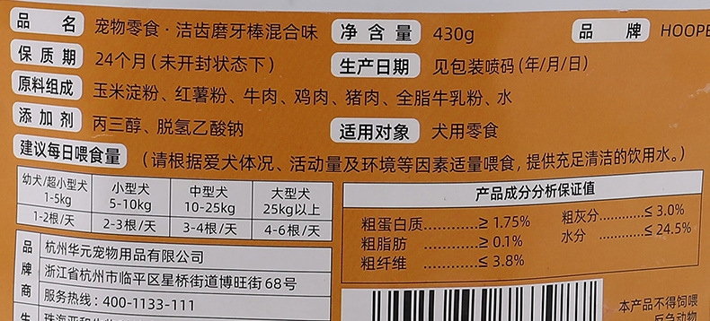 【品名】:hoopet宠物零食犬用 洁齿磨牙棒混合味85g