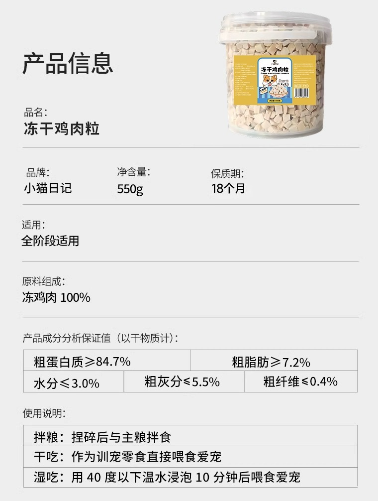 | Sabor | Pollo liofilizado en cubitos 50g,Pollo liofilizado 100g,Pollo liofilizado en cubitos 200g,Pollo liofilizado 20g (paquete de degustación) |