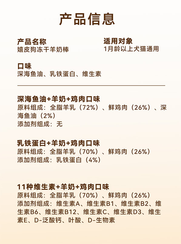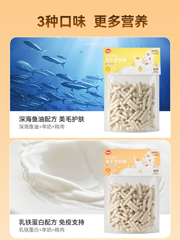 | Sabores | Aceite de pescado de aguas profundas liofilizado, Lactoferrina liofilizada, vitaminas compuestas liofilizadas |