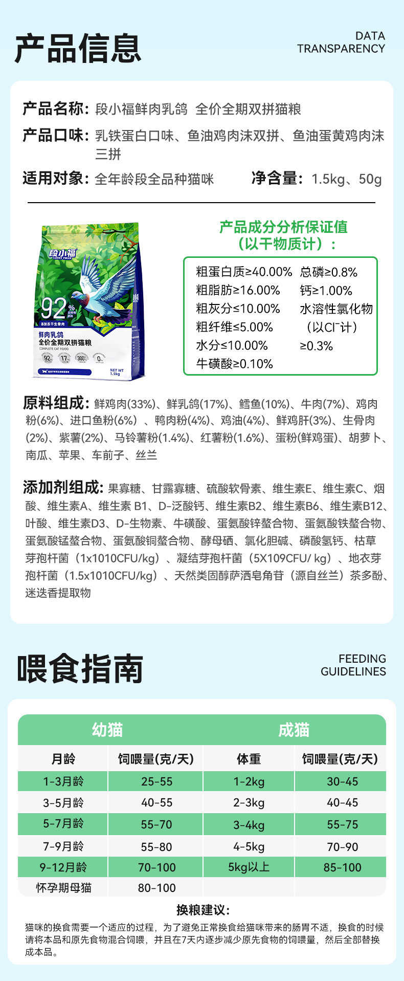 | Sabores | Doble lucha de palomas de carne fresca [3 kilogramos], doble lucha de palomas de carne fresca [3 kilogramos] entrega de carga de prueba, doble lucha de palomas de carne fresca comida de gato - carga de prueba de 50 gramos, comida de gato joven (calostro de vaca añadido) [2,5 kilogramos], comida de gato joven (incluyendo probiótico + liofilizado) [2,5 kilogramos], comida de gato sin Valle (40% de proteína bruta) [2,5 kilogramos], comida de gato joven (personalizada durante el período de salida) [2,5 kilogramos] |