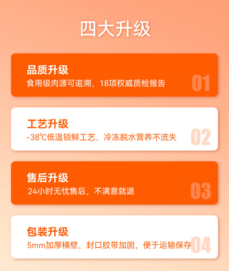| Sabores | [tres puñetazos nutricionales] Pollo + hígado de cerdo + yema de huevo con cubo 822g, [selección] cubo de yema de huevo de codorniz con peso neto 500g, [tres puñetazos nutricionales] Pollo + hígado de pollo + yema de huevo con cubo 822g, [selección de granos] Pollo + carne cruda + hígado de pollo con cubo 822g, [selección de granos] granos de pollo grandes con cubo 822g, [doble puñetazo clásico] Pollo + yema de huevo con cubo 822g, [mejor mezcla de granos] pollo roto con cubo 772g, [pecho de pollo entero con cubo 822g, [hueso redondo fuerte]el pastel contiene 822g en barriles, 550g de carne de pato cortada original limpia, 550g de pollo cortada original limpia, 550g de peso neto seco de carne mixta de pollo y pato, 550g de peso neto congelado de pollo + yema de huevo, 460g de peso neto congelado de pollo + yema de huevo, 350g de peso neto de pollo, 35% de yema de huevo + 500g de peso neto de hígado de pato, 500g de peso neto de pollo puro de lujo (calidad de pollo nativo), 530g de peso neto congelado de yema de huevo pura, 45% de pollo + 30% de yema de huevo + 500g de hígado de pollo.. Hay más pollo) 500g de peso neto, 5g de peso neto mixto de lujo 460g, 7g de peso neto mixto 500g (saludable sin vísceras), 10g de peso neto mixto congelado de tapa dura, 12g de peso neto de barril familiar 500g, 350g de peso neto de pollo de tapa dura, 450g de peso neto mixto liofilizado, 180g de peso neto de codorniz congelada (ginseng En gatos), 500g de peso neto mixto de lujo 500g, 400g de peso neto de pescado de primavera congelado (muchas semillas de pescado), 200g de pescado de primavera (75% de peso neto de pescado femenino 150g), 200g de pescado de primavera congelado (95% de peso neto de pescado femenino), 360g de pescado de primavera (75% de pescado de primavera).pesa 230g), 360g de pescado de primavera (95% de peso neto de pescado femenino 230g), 500g de frutas y verduras mixtas, 450g de frutas y verduras secas mixtas, 300g de frutas y verduras crujientes de varios sabores, 80g de verduras congeladas y limpias, 80g de frutas congeladas y limpias, 200g de verduras congeladas y limpias, y 200g de frutas congeladas y limpias. |