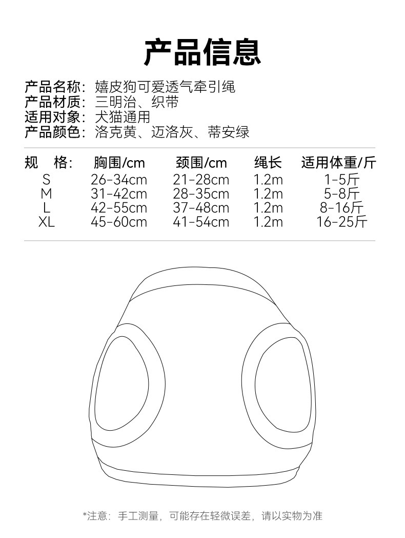 | Especificaciones (largo * ancho) | S (peso recomendado 1 - 5 kg), M (peso recomendado 5 - 8 kg), L (peso recomendado 8 - 16 kg), XL (peso recomendado 16 - 25 kg) |