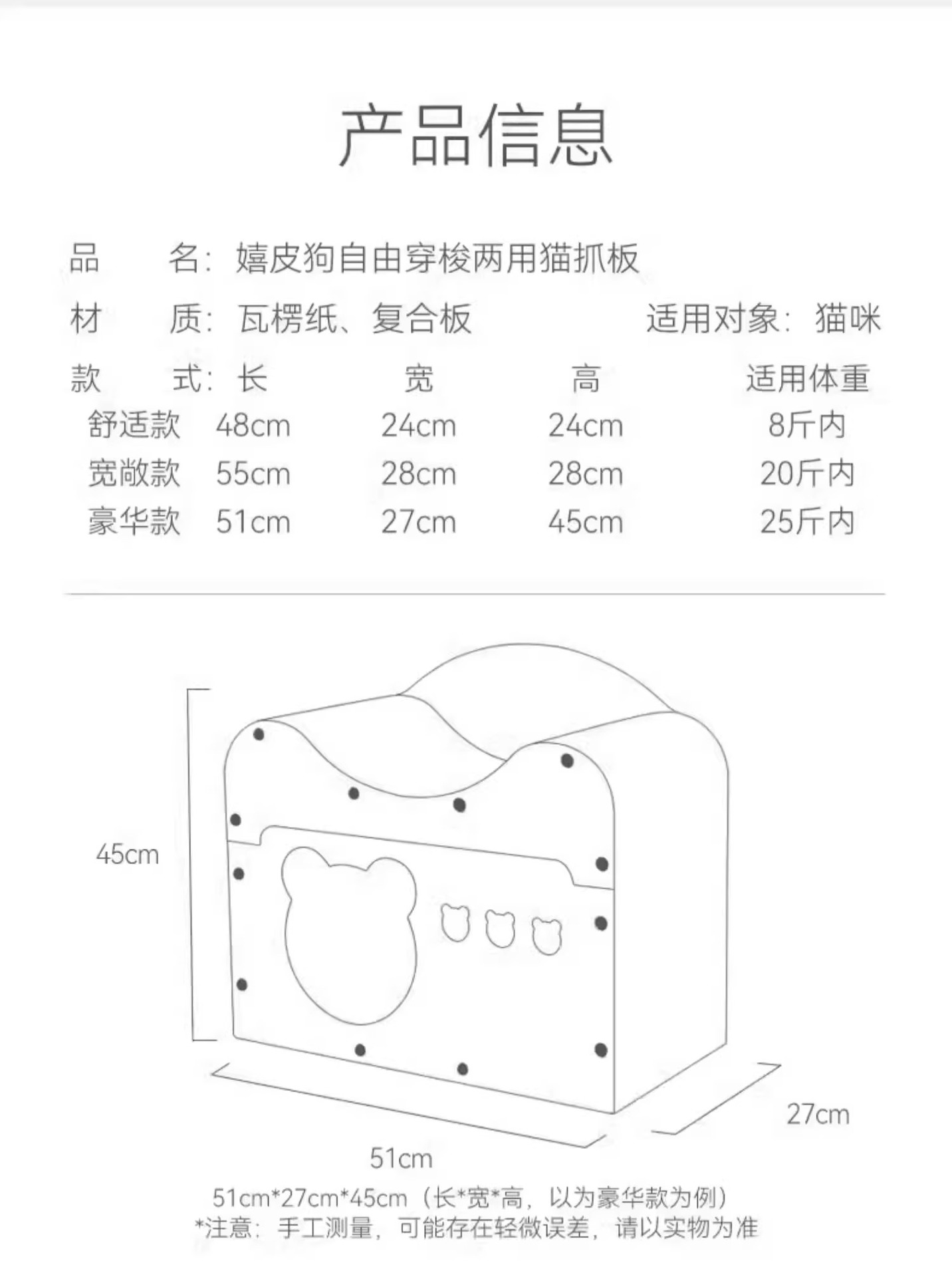 | Colores | Papel corrugado sillón reclinable,Papel corrugado de columna de agarre,Papel corrugado de bola de agarre,Silla reclinable [Versión de sisal mejorada],Columna de agarre de sisal [versión de sisal mejorada],Bola de captura de sisal [versión de sisal mejorada],Núcleo de reemplazo de placa de agarre para gatos [estilo de papel corrugado],Bola de agarre de sisal de tablero de agarre de gato arqueado (dentro de 15 kg),Placa de agarre de gato arqueada [puerta pequeña] (dentro de 15 kg),Tablero de agarre de gato arqueado [agujero de puerta grande] (dentro de 20 kg) |