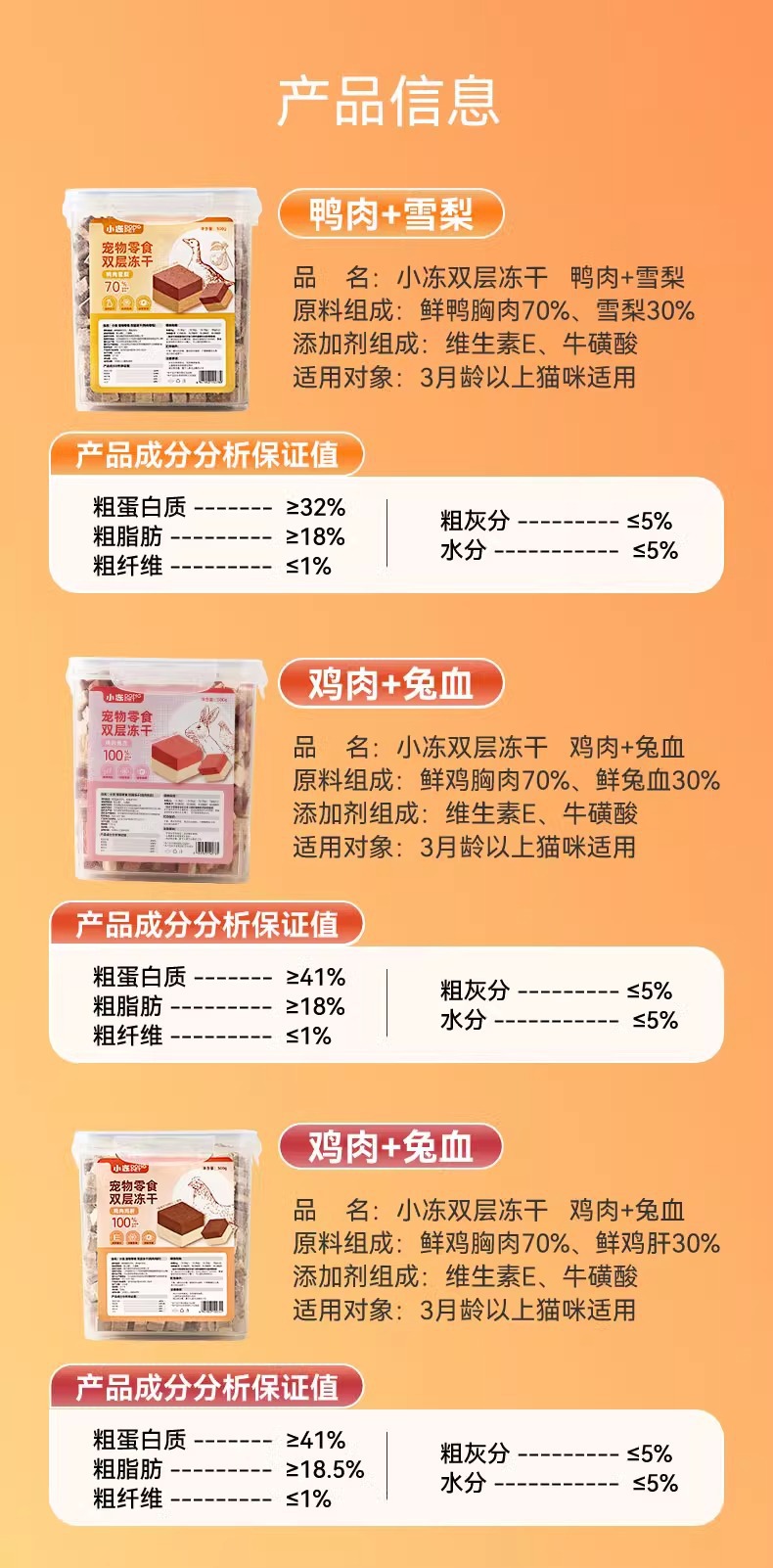 | Sabor | [200g] Pato Sydney doble,[500g] Pato Sydney,[200g] hígado de pollo doble,[500g] hígado de pollo doble,[200g] doble capa de sangre de pollo y conejo,[500g] sangre de pollo y conejo,[200g] Doble capa de pollo y gato,[500g] Pollo y hierba para gatos,[200g] yema de huevo de pollo doble,[500g] yema de huevo de pollo doble,[200g] Pollo compuesto,[500g] Pollo compuesto,[100g] Pollo liofilizado,[80g] Pechuga de pollo liofilizada,[100g] Yema de huevo en trozos de pollo,[100g] Hígado de pollo liofilizado,[100g] Hígado de pollo,[100g] yema de huevo liofilizada,[100g] Salmón liofilizado,[100g] Gránulos de pollo, hígado de pollo, yema de huevo,[100g] codorniz liofilizado,[100g] Cuello de pato liofilizado,[100g] Cuello de pollo liofilizado,[100g] Pescado fresco de primavera,[100g] Bacalao crudo,[100g] Carne cruda de venado,[100g] Carne de res cruda,[100g] Carne cruda Carne de avestruz,[100g] 95% pez hembra |